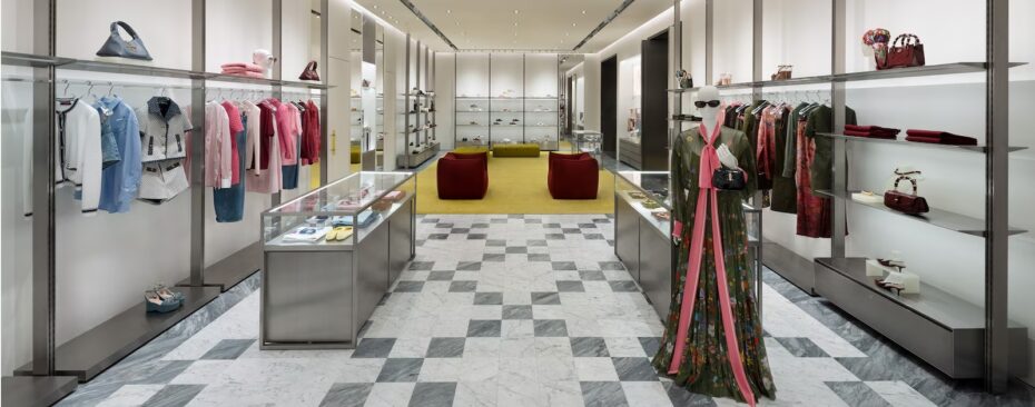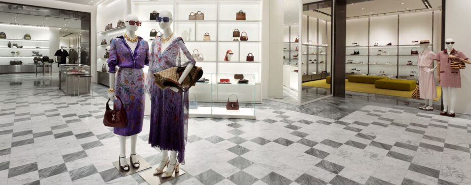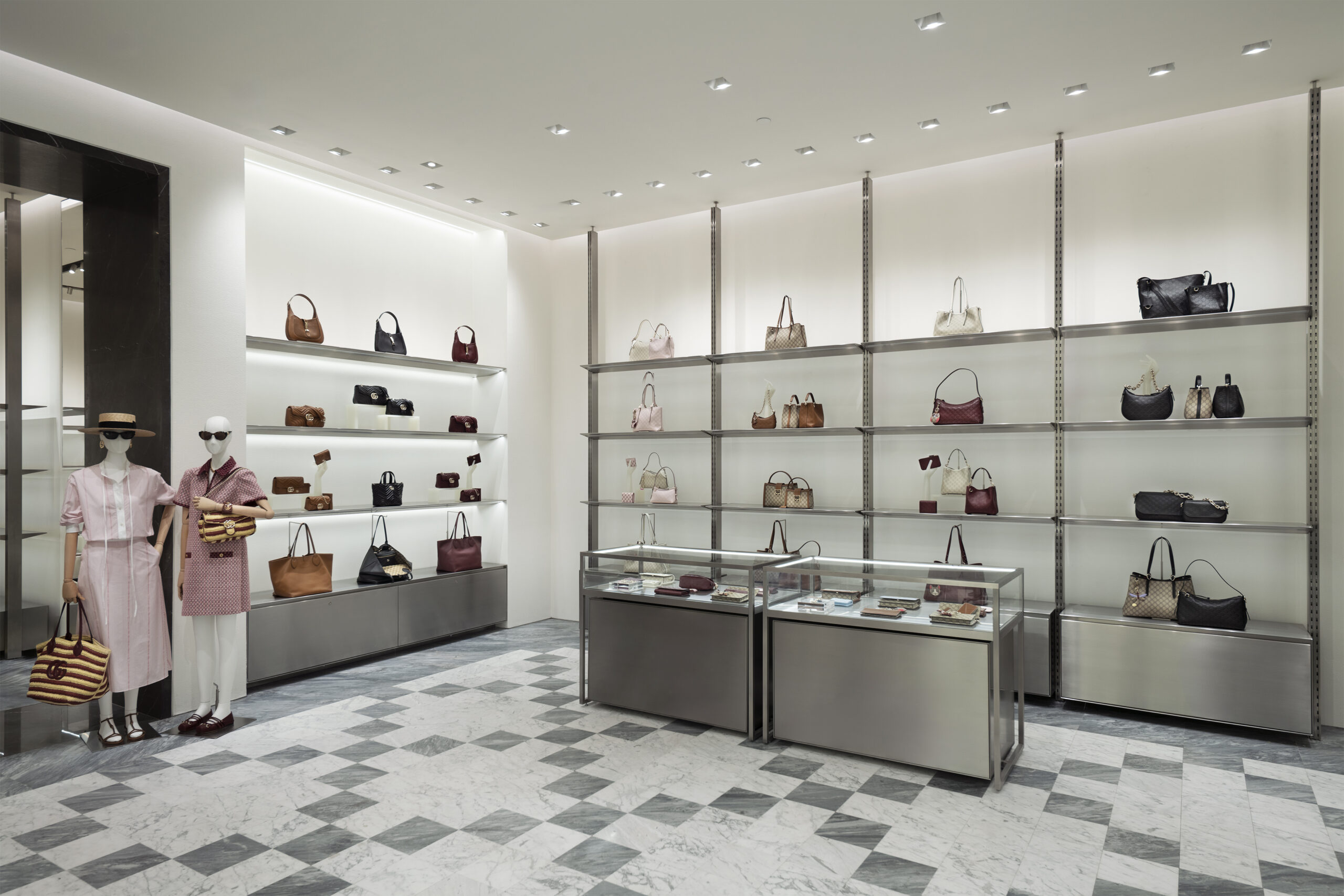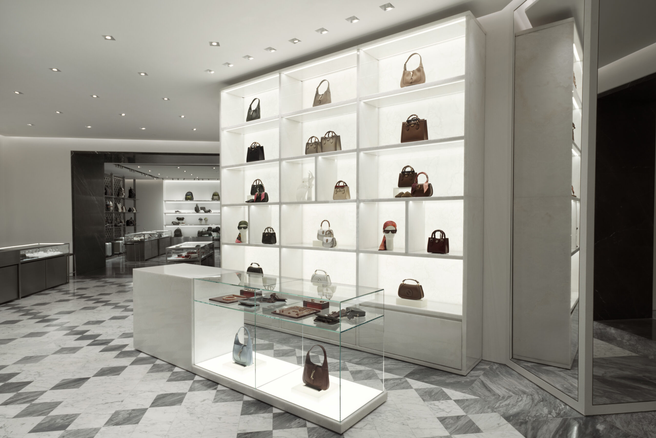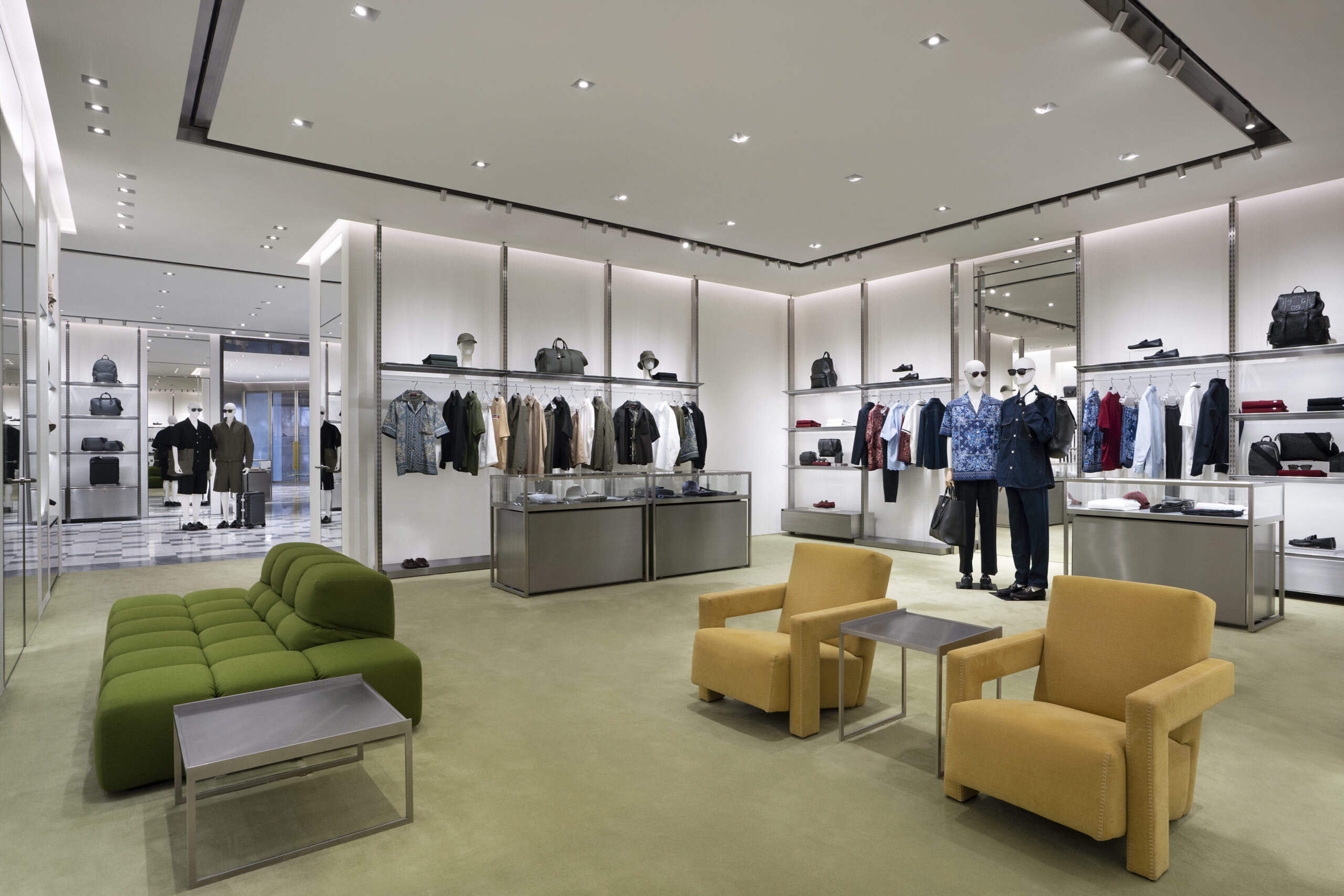 Cửa hàng được đổi mới dựa trên bản sắc Ý đương đại, kết hợp giữa thiết kế cổ điển và hiện đại, tạo nên một không gian mua sắm đẳng cấp. Các bộ sưu tập Gucci được đặt lên phía trước như một chủ ý trang trí thiết yếu. Sàn đá cẩm thạch quang học lấy cảm hứng từ các thiết kế kinh điển trong các tòa nhà lịch sử của thương hiệu. Thảm màu xanh lá cây và vàng được thêm vào, định hướng các khu vực khác nhau trong cửa hàng, đồng thời tô điểm và bổ sung vào nguồn năng lượng tươi trẻ, giàu sức sống của Gucci. Tường đá Onyx tại lối vào dành để trưng bày các thiết kế biểu tượng, trong khi các kệ, tủ và bàn trưng bày bằng thép và kính làm nổi bật thẩm mỹ sành điệu của Gucci.