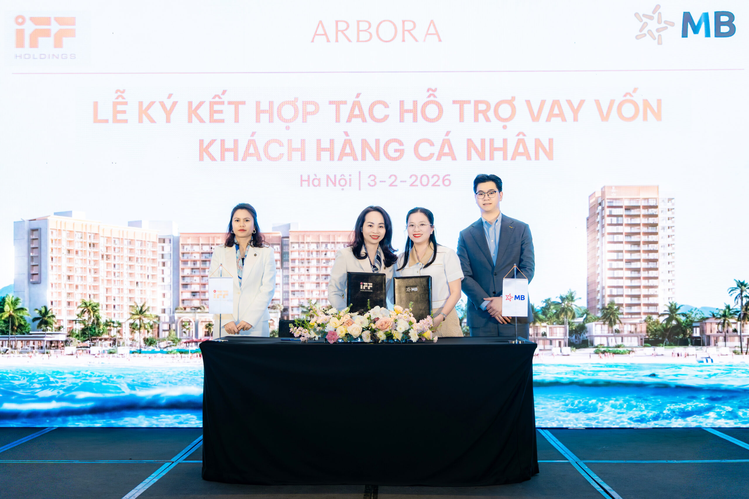 Song song đó, nhằm mang đến giải pháp tài chính tối ưu cho chủ nhân tương lai, IFF Holdings cũng chính thức ký kết hợp tác hỗ trợ vay vốn khách hàng cá nhân với Ngân hàng TMCP Quân đội (MB Bank). Với các chính sách linh hoạt được thiết kế riêng, sự tham gia của MB Bank giúp khách hàng dễ dàng tiếp cận và sở hữu dòng sản phẩm bất động sản hàng hiệu này.