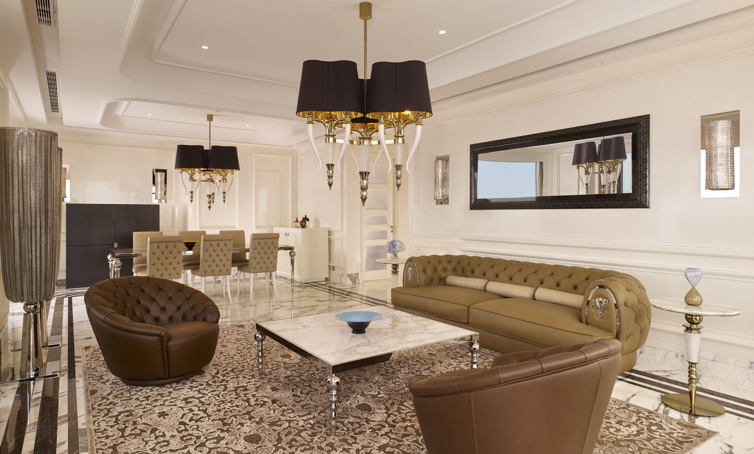 Với những du khách yêu thích phong cách nội thất Ý thanh lịch trong gam màu be, Designer Suite by Visionnaire chính là một lựa chọn hoàn hảo. Điểm nhấn độc bản của căn phòng rộng 126 mét vuông này đến từ sự kết hợp của chiếc đèn chùm pha lê Esmeralda – đậm chất quý tộc châu Âu, cùng chiếc đèn Excalibur đính pha lê Swarovski – lấy cảm hứng từ thanh kiếm huyền thoại của vua Arthur, tạo hiệu ứng ánh sáng vừa quyền lực vừa mê hoặc.