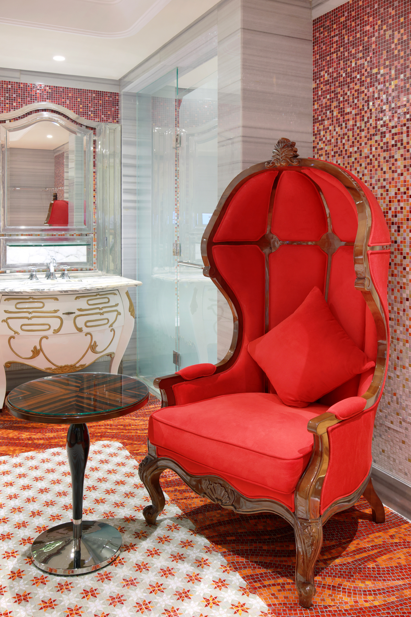 Là một trong những lựa chọn hàng đầu tại The Reverie Saigon, Reverie Romance Suite rộng 68 mét vuông được thiết kế cho những cặp đôi tìm kiếm sự riêng tư tuyệt đối và trải nghiệm lưu trú mang màu sắc lãng mạn, với tông đỏ ruby ấm áp và quyến rũ đóng vai trò chủ đạo. Những mảng tường lụa cao 4,5 mét do nghệ nhân Venetian chế tác, và phông đầu giường Gianduja của Rubelli được dệt thủ công với các họa tiết tinh xảo, mỗi chi tiết nhỏ góp phần làm nổi bật tổng thể không gian của phòng Reverie Romance Suite. Ngoài ra, phải kể đến mẫu ghế Loveseat Arkeos của Vittorio Grifoni, cuốn hút với đường cong cổ điển và chất liệu da bóng mịn, và đặc biệt, phòng tắm rộng rãi với sắc đỏ của gạch mosaic giúp khơi gợi bầu không khí gần gũi và thân mật cho các cặp đôi.