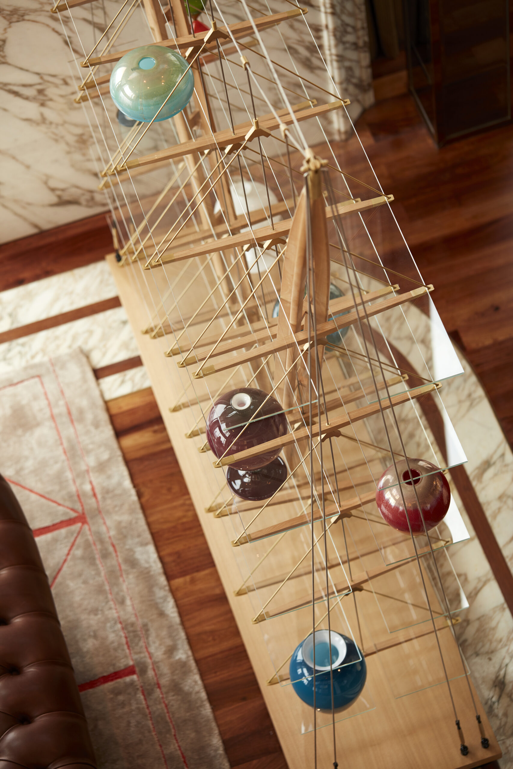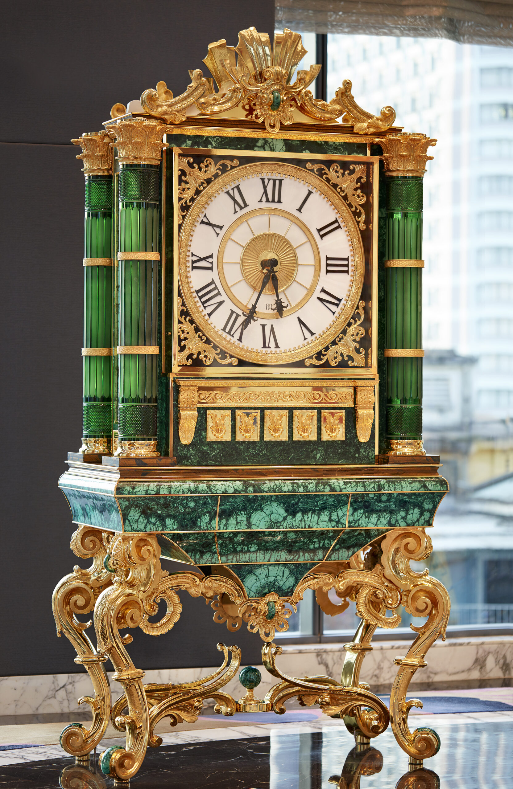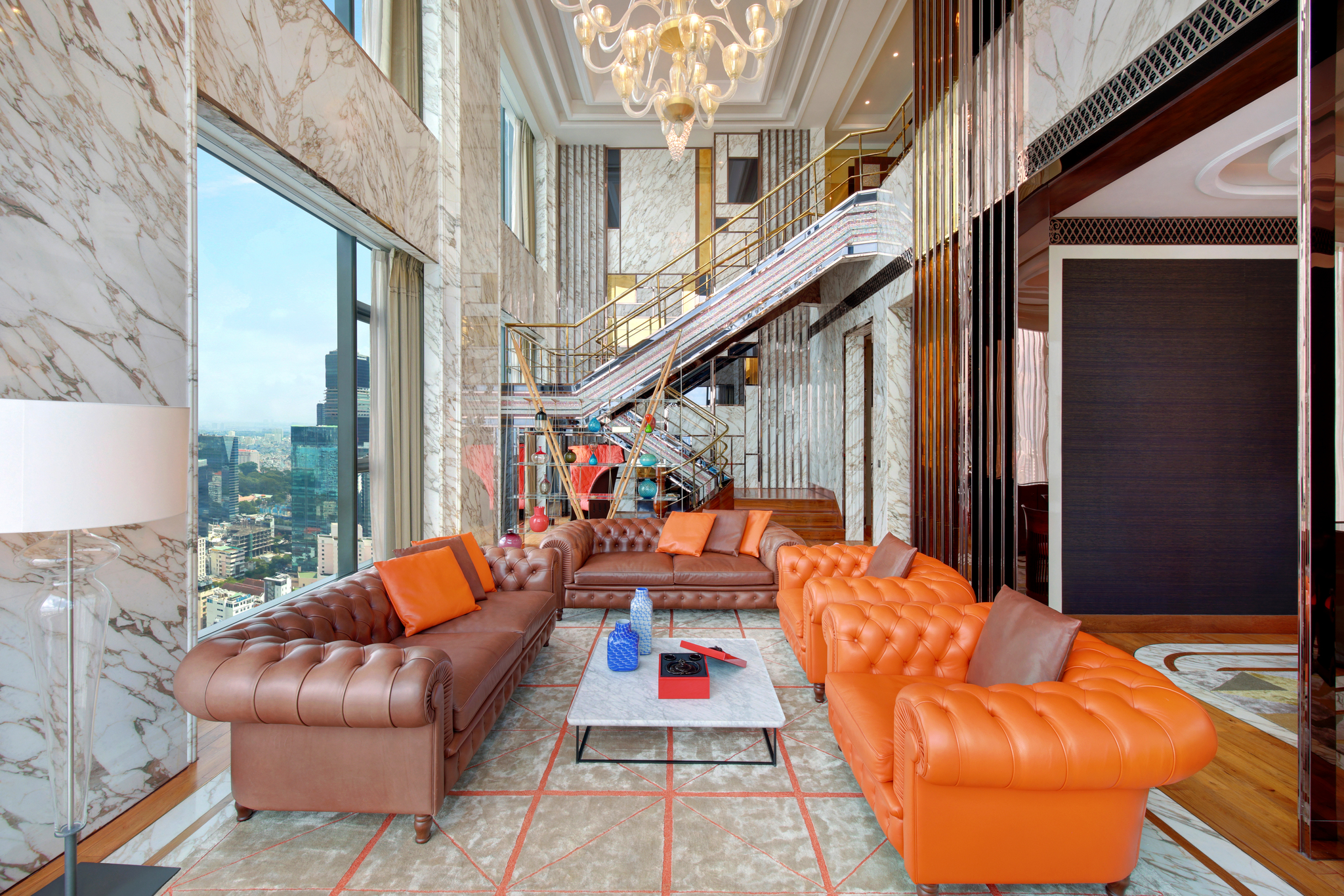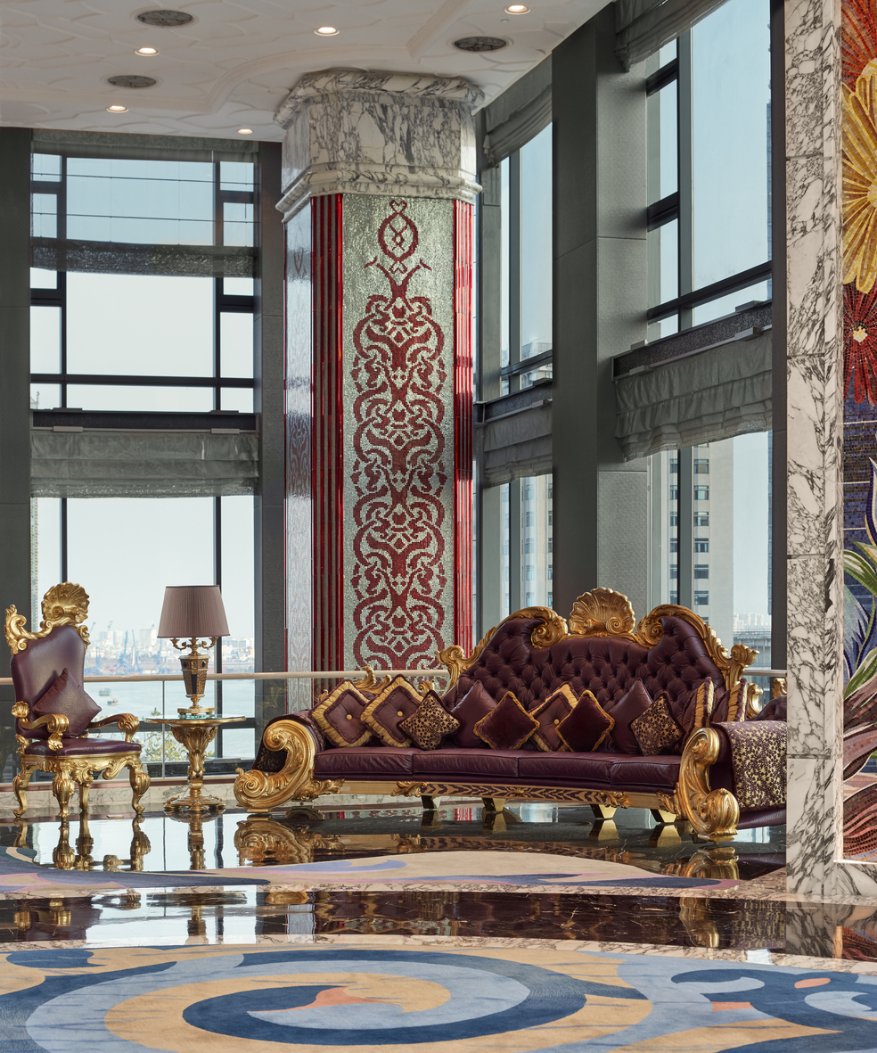Bước vào sảnh tầng trệt khách sạn, du khách dễ dàng nhận ra điểm nhấn là chiếc đèn chùm pha lê VGnewtrend Arabesque Egg của thương hiệu Murano, tinh xảo với những mảnh thủy tinh được thổi thủ công, lan tỏa ánh sáng rực rỡ, tạo nên tâm điểm thị giác đầy mê hoặc cho không gian. Khi đi đến tiền sảnh ở tầng 7, một không gian có thể ví như phòng trưng bày nghệ thuật, khách lưu trú sẽ bắt gặp một chiếc đồng hồ Baldi Monumental nổi bật với sắc xanh lục bảo được tạo tác từ đá lông công quý hiếm, cao 3 mét, nặng gần 1.000 kg, hiển thị thời gian nguyên tử chính xác. Điểm thêm sự nguy nga là sofa Colombostile thuộc bộ sưu tập Esmeralda của Giovanni Malerba di Busca, dài 5 mét, làm từ gỗ quý, dát vàng 24K, bọc da đà điểu nhuộm tím và điểm xuyết một viên thạch anh tím phía sau. Bản hòa ca tuyệt mỹ ấy là sự gợi mở cho một hành trình thưởng lãm sâu lắng hơn, nơi mỗi căn phòng là một “tác phẩm nghệ thuật” riêng tư được “đồng sáng tạo” bởi chính phong cách cá nhân của từng vị khách.