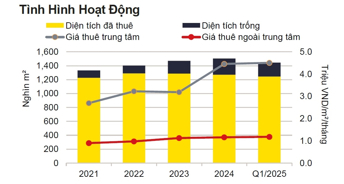 Trong Q1/2025, công suất ổn định theo quý và tăng 2 điểm % theo năm lên 94%. Công suất của trung tâm thương mại đóng góp 0.1 điểm % theo quý, bù đắp cho công suất khối đế bán lẻ giảm 1 điểm % theo quý. Sự tăng trưởng công suất theo năm được thúc đẩy nhờ nhu cầu cao từ các khách thuê thuộc ngành F&B, giải trí và thiết bị gia dụng & nội thất cùng với mức hấp thụ tốt tại các dự án mới.