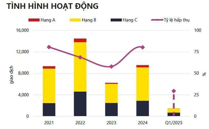 Lượng giao dịch Q1/2025 giảm 46% theo quý xuống còn 1.400 căn. So với cùng kỳ của hai năm gần nhất, tình hình hoạt động có sự cải thiện, được thúc đẩy bởi lịch thanh toán giãn và chính sách hỗ trợ vay.