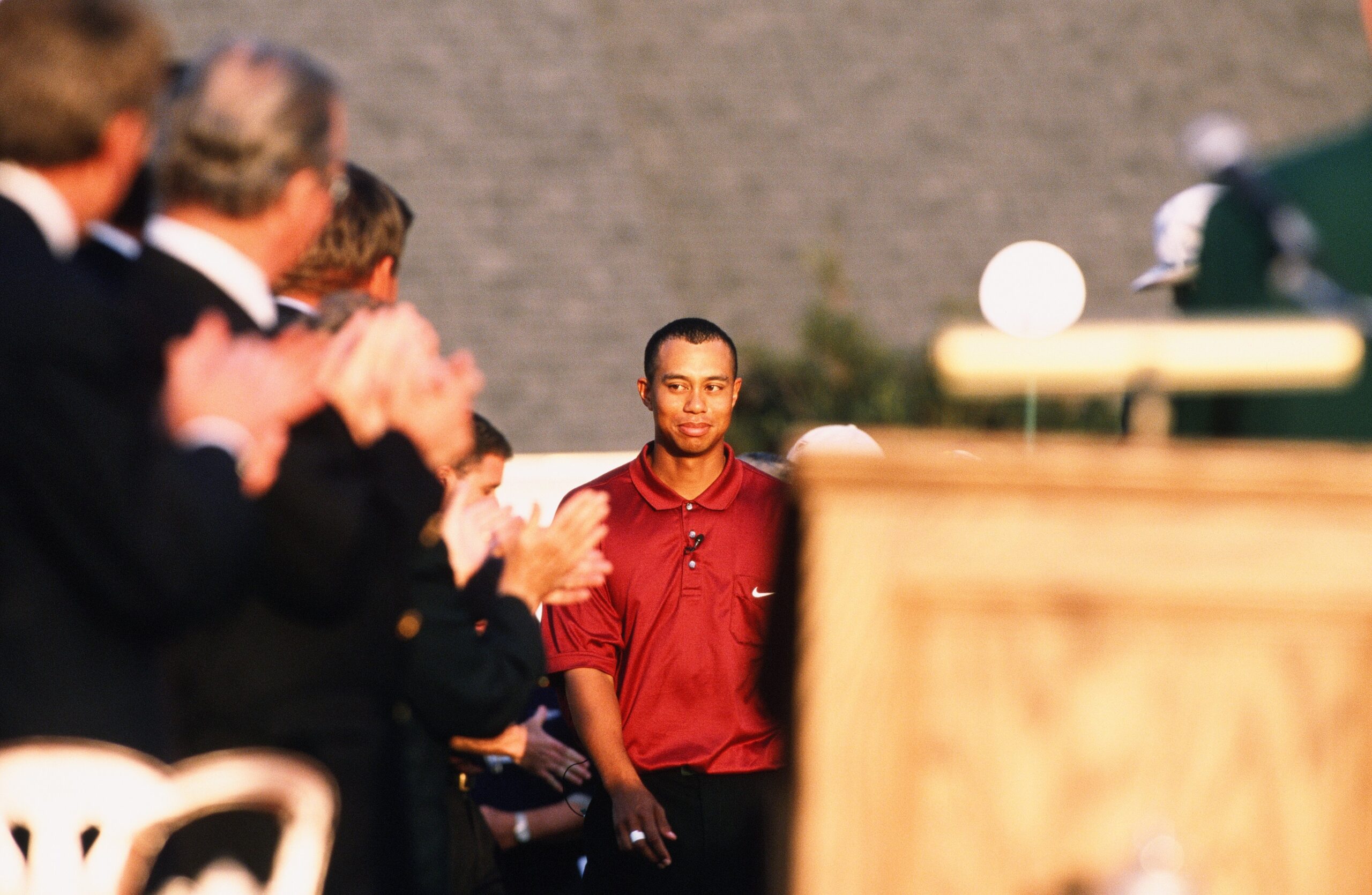 Tiger Woods bước lên bục nhận giải trong giải Masters Tournament năm 2001. Ảnh: Augusta National/Getty Images