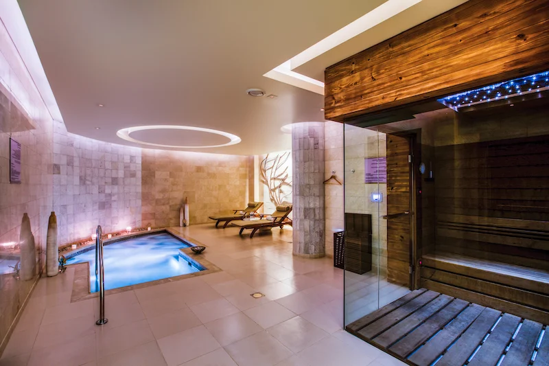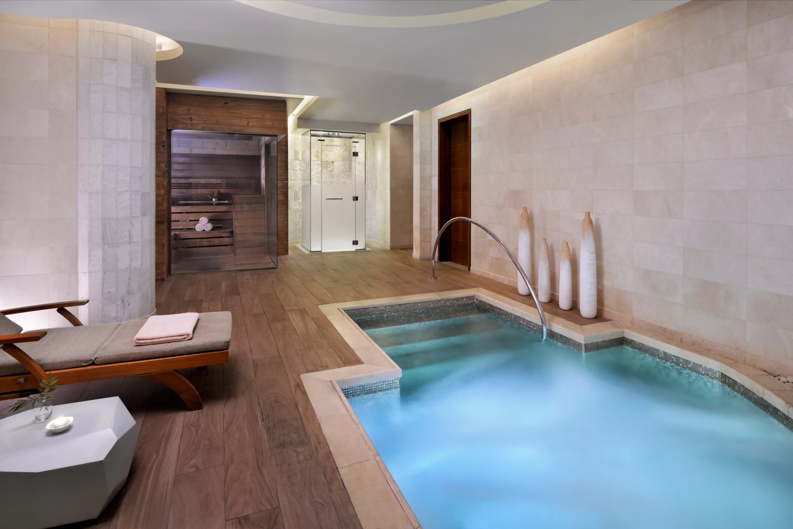 Phòng trị liệu dành cho cặp đôi có hai bồn Jacuzzi và một phòng tắm hơi rộng rãi với ghế và tường bằng đá cẩm thạch bóng bẩy. Trần nhà “lấp lánh như sao” hoàn thiện không gian, lý tưởng cho một ngày thư giãn đôi lãng mạn. Với tông màu nâu trầm, các phòng tạo cảm giác thoải mái và ấm áp ngay lập tức. Mỗi phòng đều có khu vực thay đồ riêng, tăng thêm trải nghiệm độc quyền. Bên cạnh đó, một phòng tập thể dục riêng được cung cấp cho các buổi tập huấn cá nhân, cũng như các lớp yoga theo lịch hai lần một tuần.