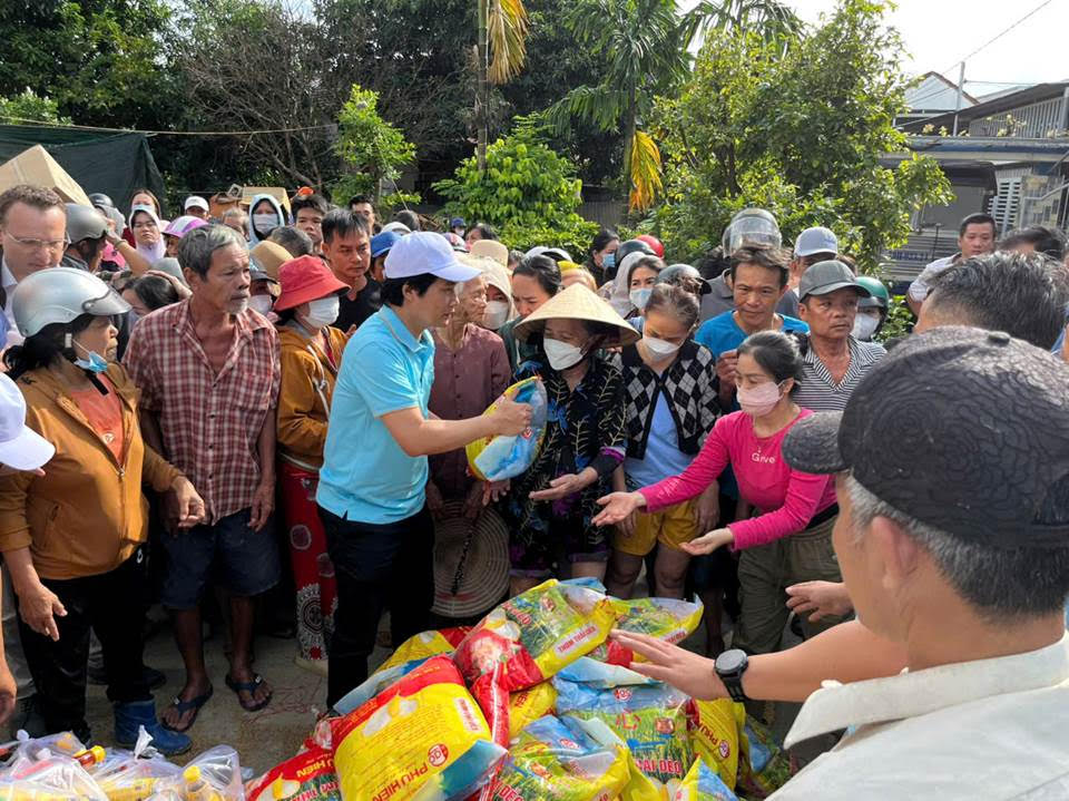 Ông Phạm Văn Hiến (áo xanh) cùng đội ngũ quản lý của tập đoàn trao 200 suất quà cứu trợ cho người dân thôn Phú Vinh 1, phường Tây Nha Trang.