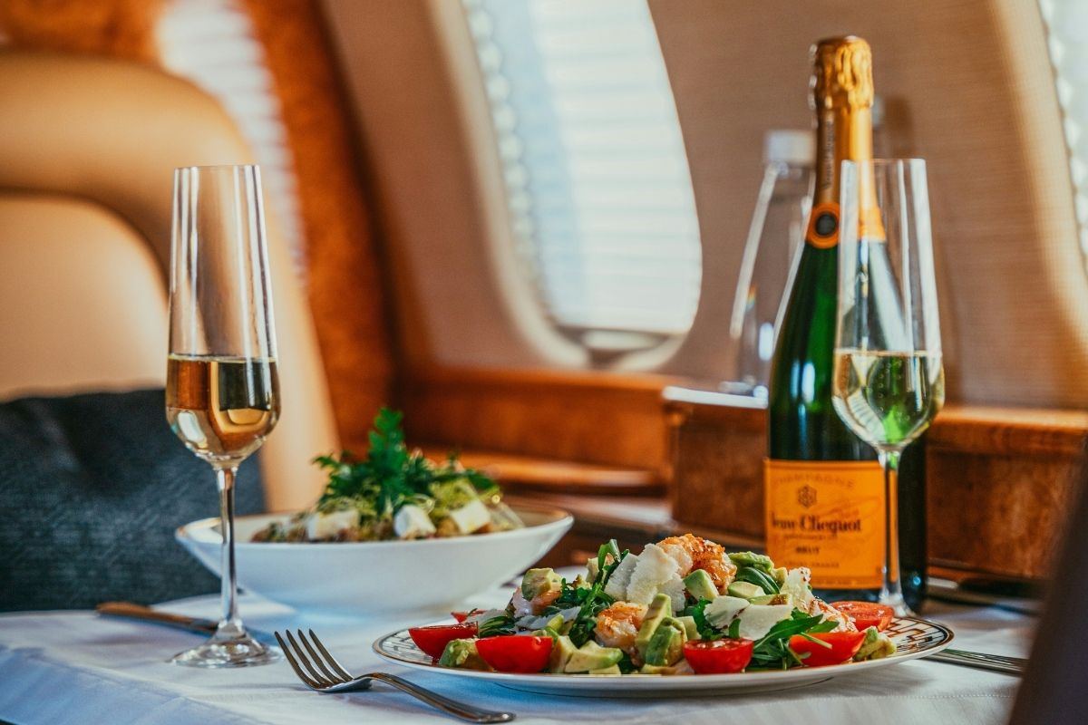 Trải nghiệm ẩm thực trên chuyên cơ sẽ cao cấp hơn với những chuyến bay thông thường. Bạn sẽ được phục vụ champagne thượng hạng cùng những món ăn được chế biến từ nguyên liệu cao cấp được tinh tuyển. Bên cạnh đó, không gian riêng tư và sang trọng càng làm tăng thêm sự trọn vẹn cho mỗi bữa tiệc ẩm thực trên không. Tuy nhiên, cần lưu ý tiết chế những yêu cầu quá cầu kỳ, bởi hầu hết những món ăn trên máy bay riêng được chuẩn bị trước khi cất cánh. Những đòi hỏi không phù hợp không chỉ gây khó khăn cho đội ngũ phục vụ mà còn có thể làm giảm trải nghiệm của chính chủ nhân chuyên cơ.