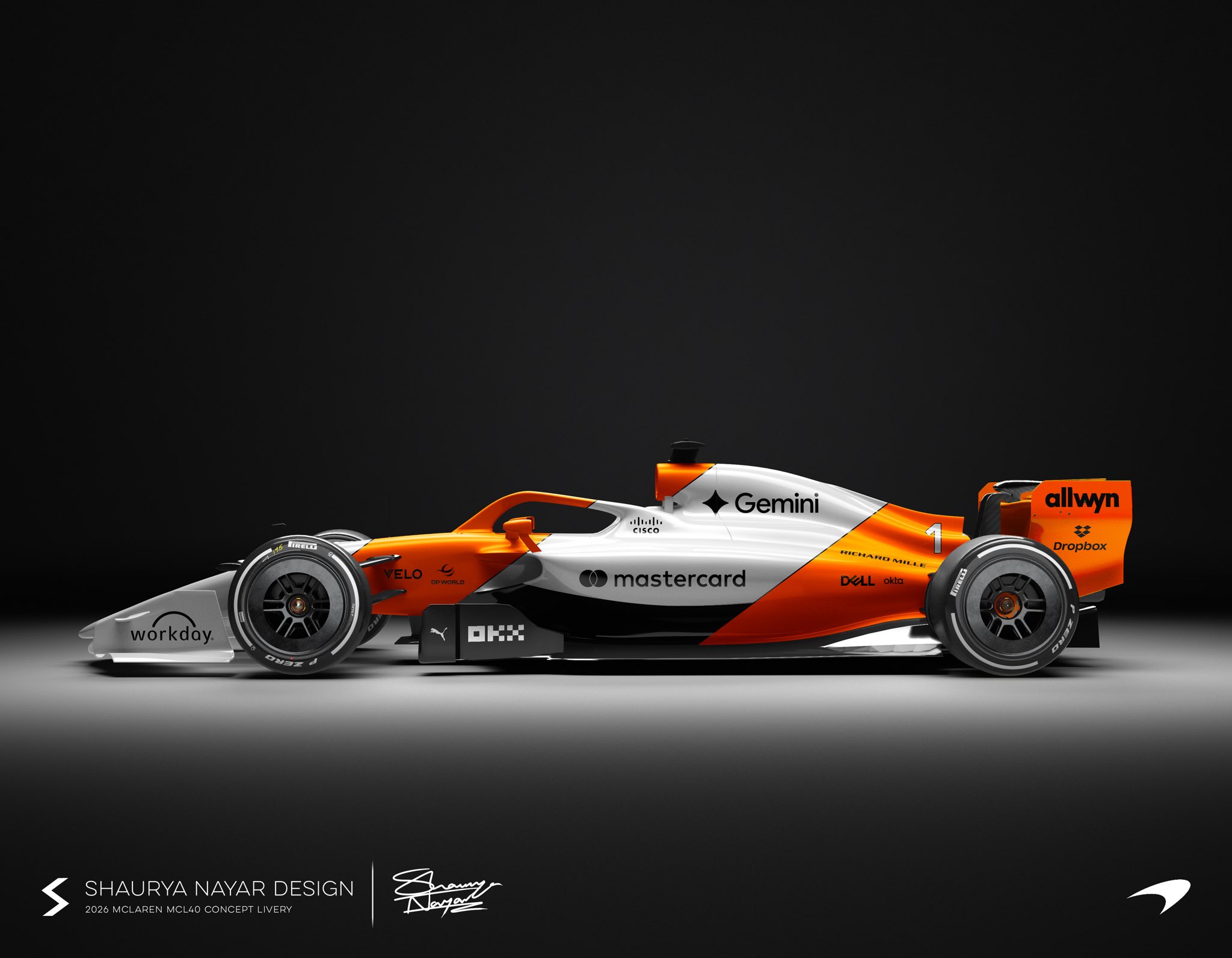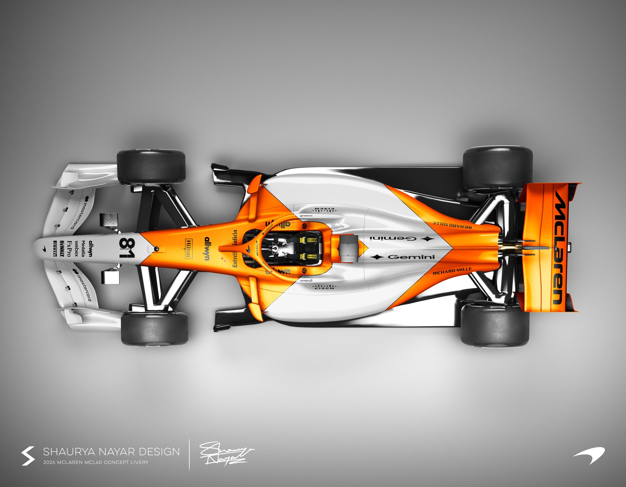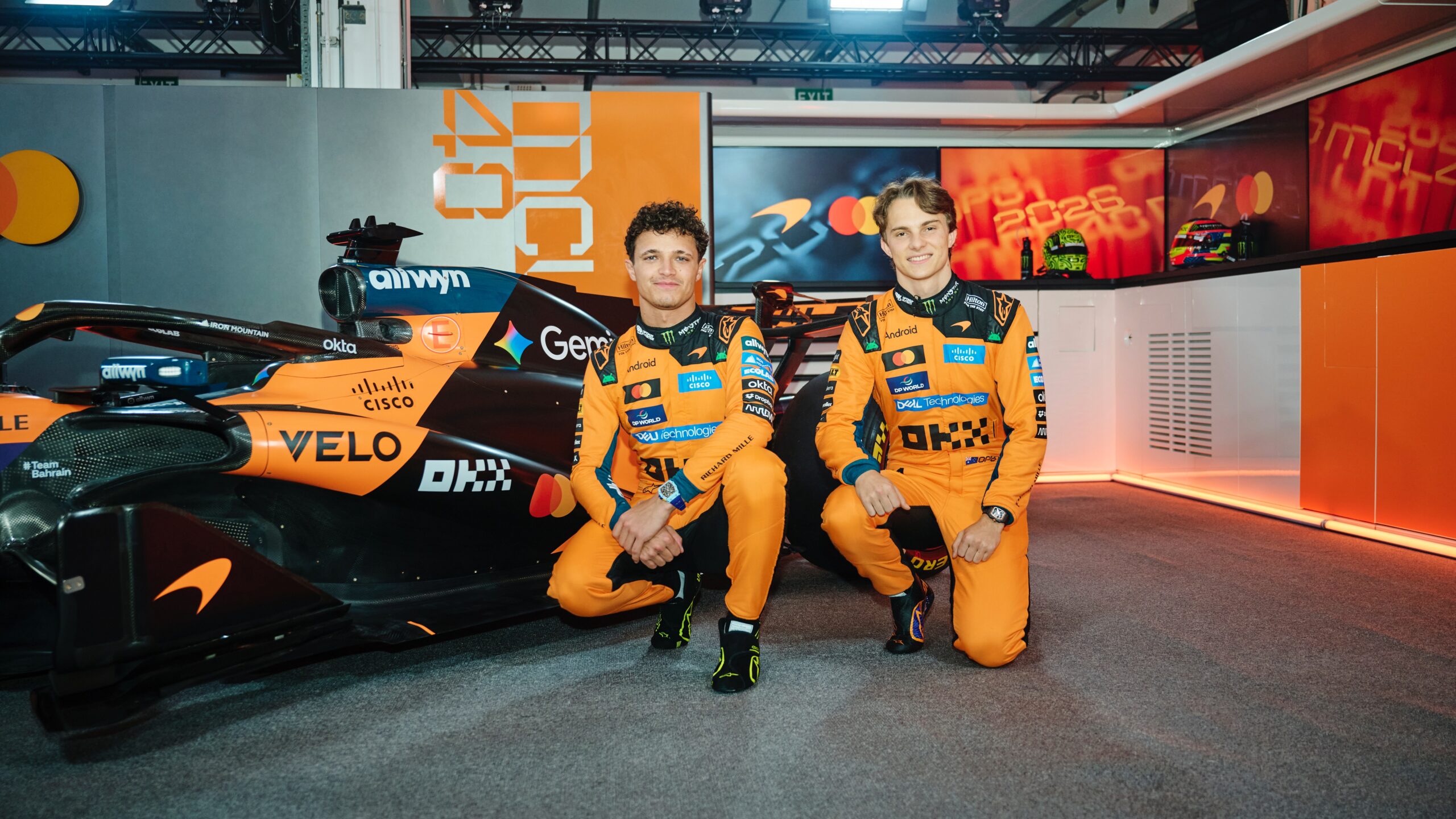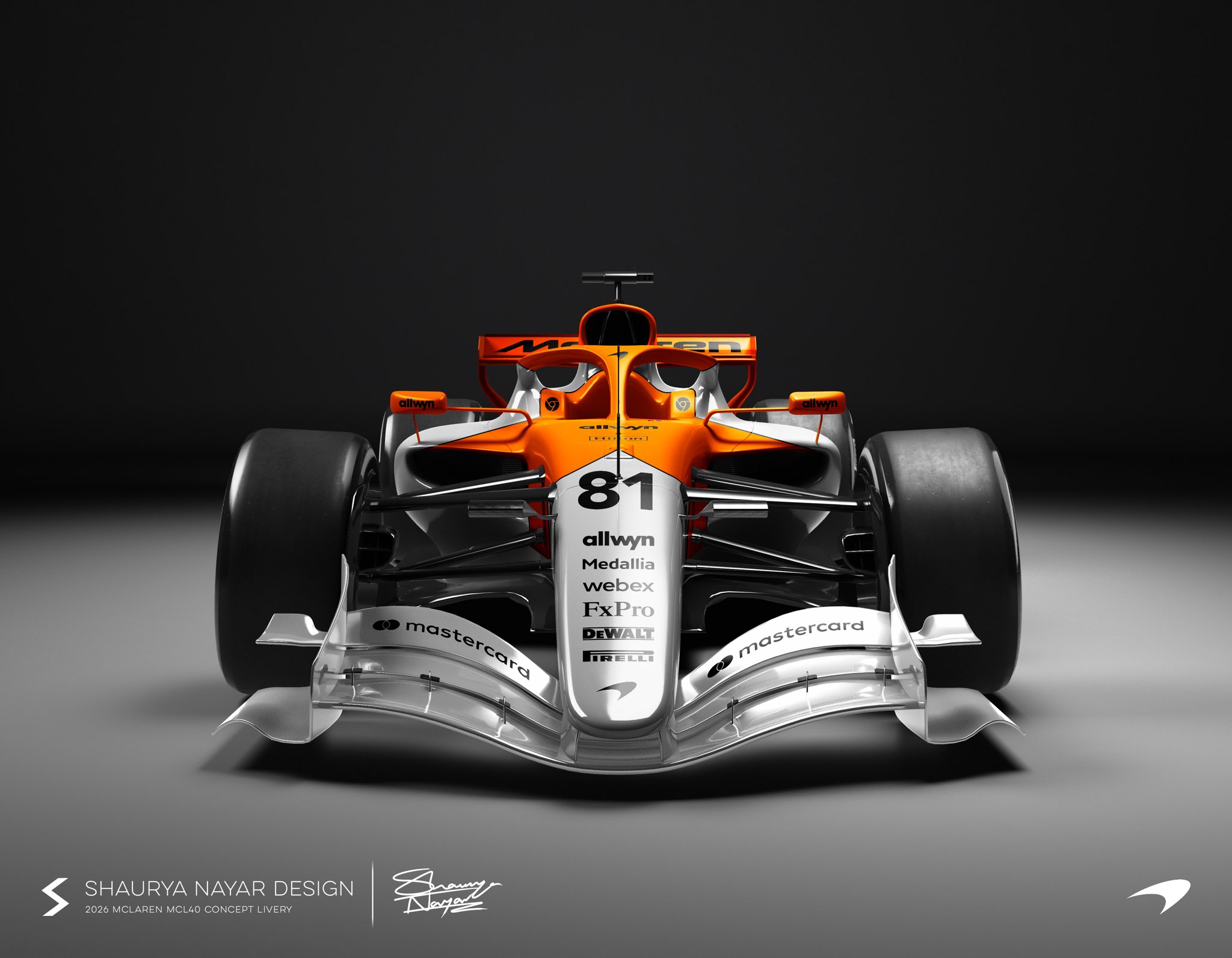 Đương kim vô địch thế giới McLaren tiếp tục duy trì màu sơn cam Papaya quen thuộc từng mang lại chiến thắng vang dội trong năm 2025. Tỷ lệ giữa sắc cam đu đủ và tông xám than chì được điều chỉnh nhẹ nhằm tạo cảm giác mới mẻ về thị giác.