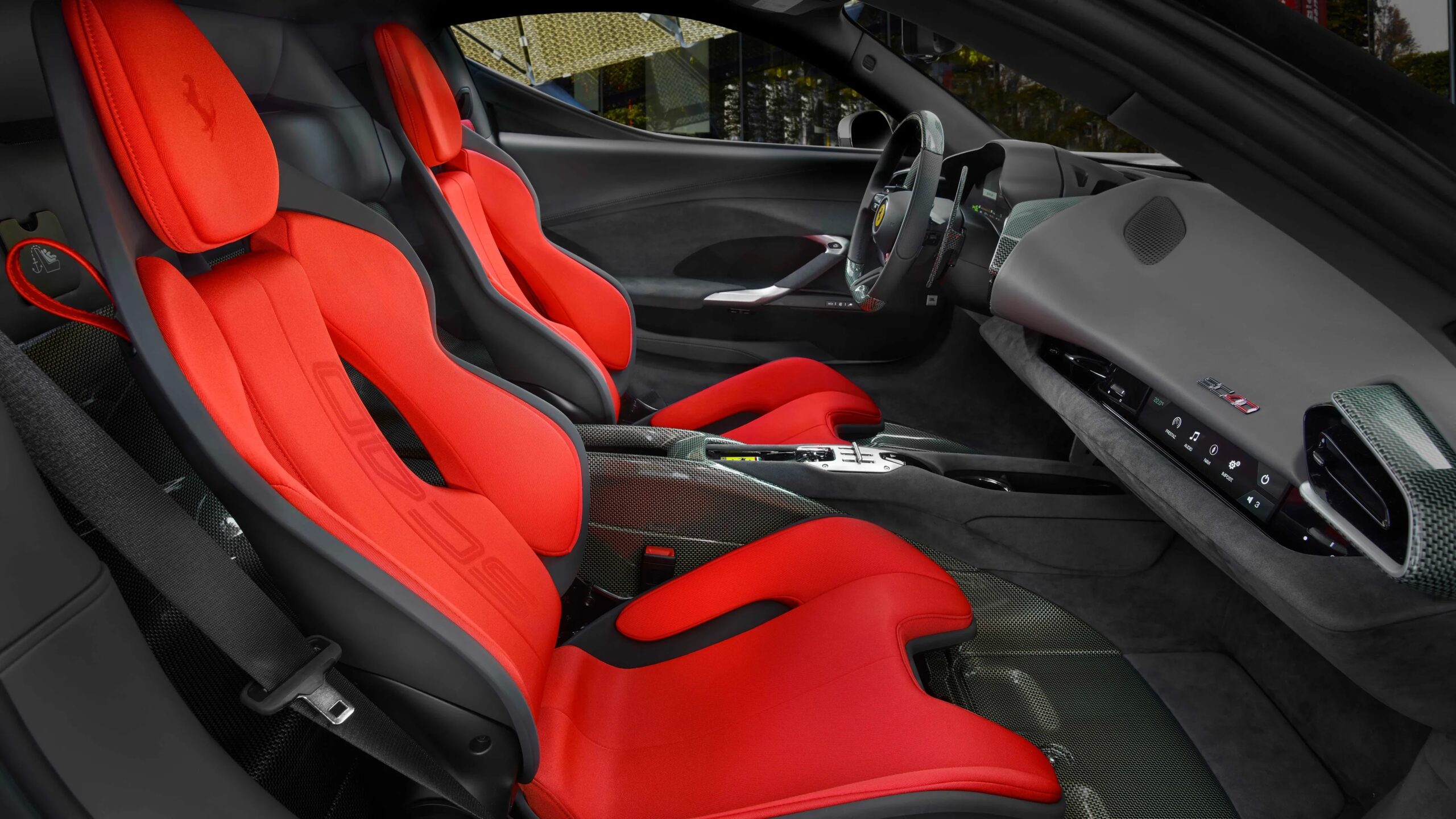 Khoang lái của SC40 vẫn giữ bố cục kỹ thuật số của 296 GTB nhưng được phủ lên những vật liệu hoài cổ. Kevlar được ứng dụng tại khoang để chân, khu vực sàn, sau ghế và bảng điều khiển trung tâm. Sợi carbon có ánh xanh nhạt – đặc trưng của F40 – xuất hiện khắp nội thất, từ sàn, thành cabin cho đến khoang động cơ sau. Chất liệu Alcantara cao cấp cùng sắc sơn trắng đặc biệt SC40 White khiến không gian nội thất trở nên tinh tế, cân bằng giữa cổ điển và đương đại.
