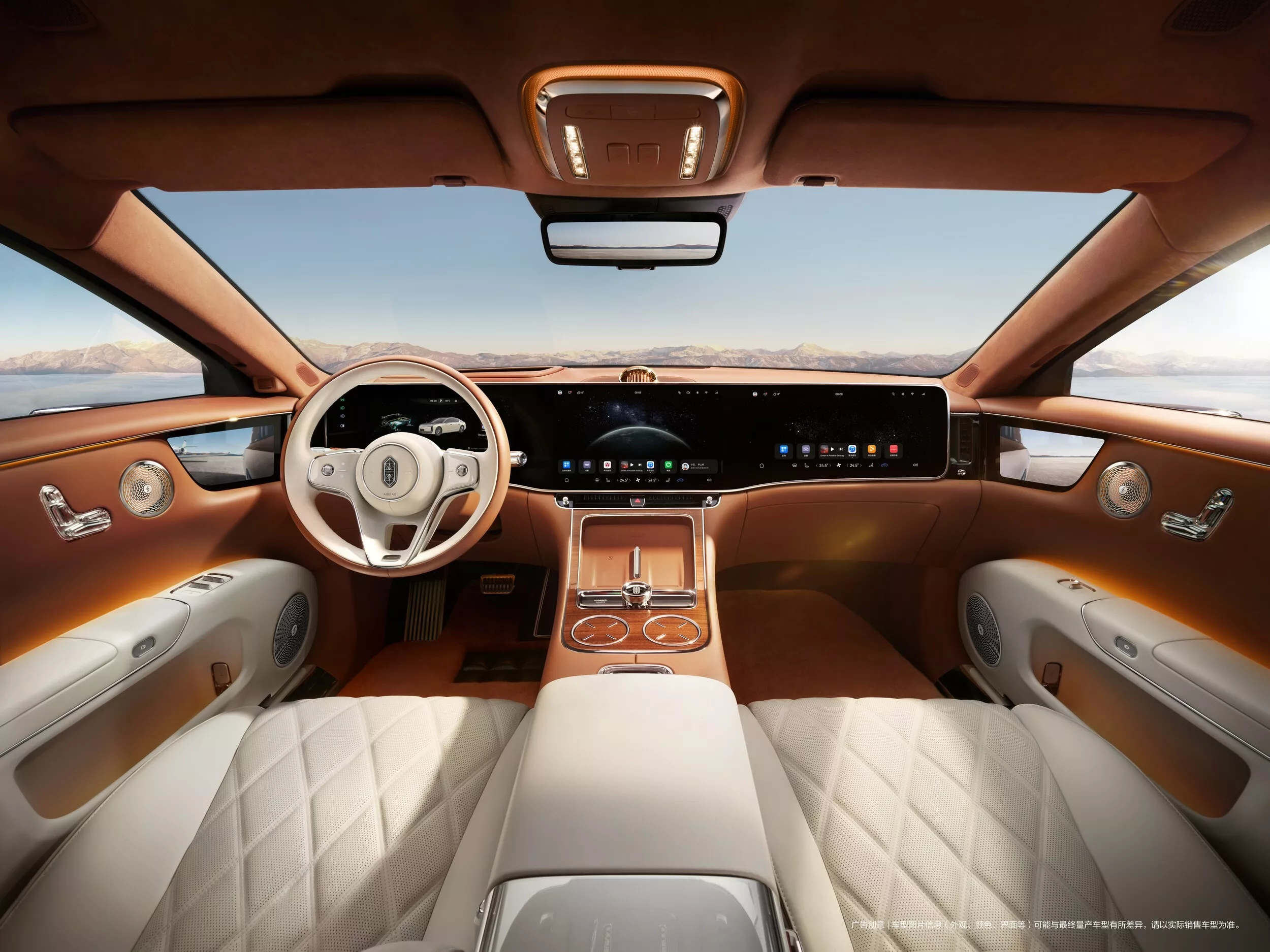 Phía trên trần xe là hệ thống đèn LED mô phỏng bầu trời sao, lấy cảm hứng từ thiết kế Starlight Headliner đặc trưng của Rolls-Royce. Ngoài ra còn có các màn hình gắn trên cửa, gợi nhớ đến những chi tiết trên BMW 7-Series.