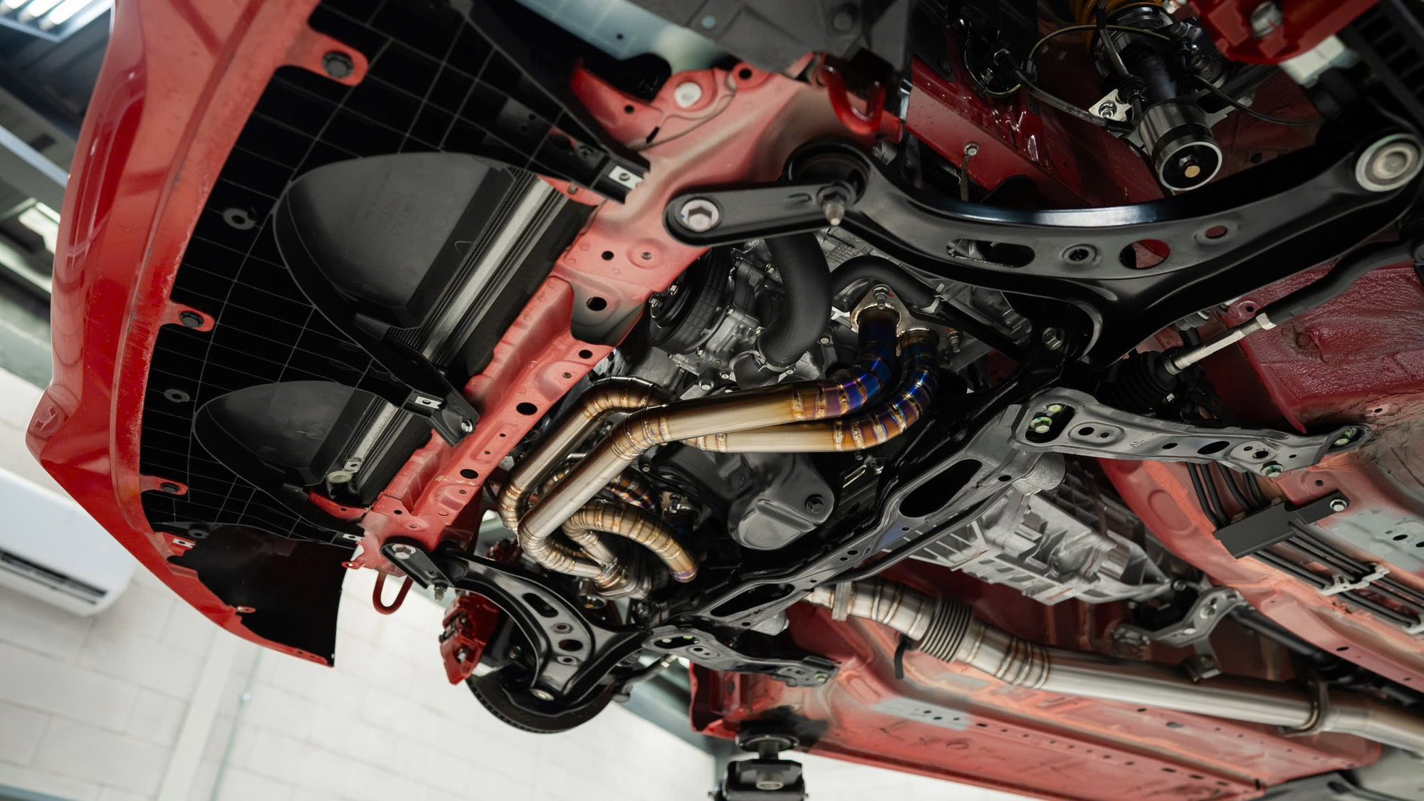 Để hoàn thiện phần âm thanh và tăng tính thể thao cho xe, hệ thống ống xả nguyên bản đã được thay bằng ống xả titan của thương hiệu Tomei. Bộ ống xả này có thiết kế nhẹ hơn, tạo ra âm thanh uy lực hơn, đồng thời giúp động cơ “thở” tốt hơn. Cuối cùng ở khoang máy, bộ ốp máy carbon của hãng Armaspeed cũng được thêm vào.