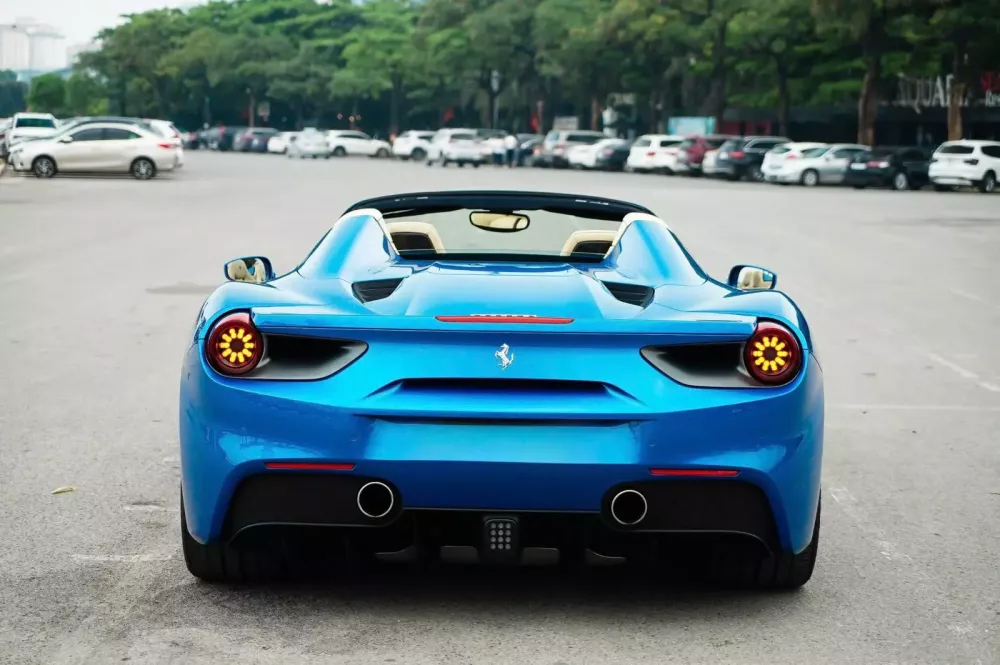 Là 1 trong 3 chiếc xe Ferrari 488 Spider được nhập về Việt Nam trong suốt gần 10 năm qua, tuy nhiên, đây cũng là xe duy nhất sở hữu màu xanh dương. Ngoài màu sơn xanh dương, xe còn có nhiều chi tiết sơn đen, bộ mâm 5 chấu kép màu bạc cùng kẹp phanh màu vàng rất nổi bật.