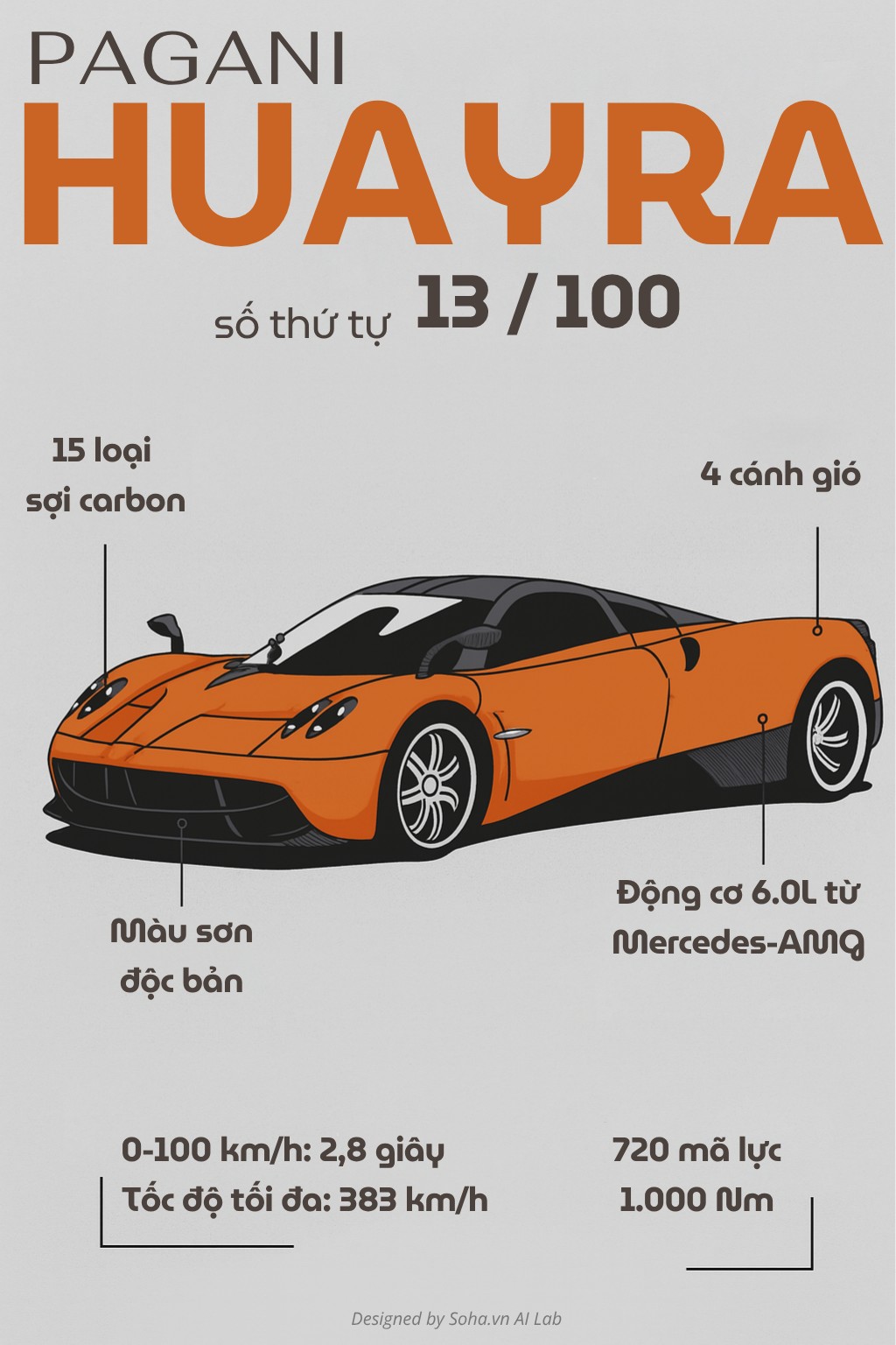 Pagani Huayra phiên bản mui cứng sử dụng động cơ V12 6.0 lít tăng áp kép M158 do Mercedes-AMG lắp ráp, sản sinh 720 mã lực và mô men xoắn 1.000 Nm. Trọng lượng khô chỉ 1.350 kg giúp Huayra tăng tốc 0–100 km/h trong 2,8 giây và đạt tối đa 383 km/h. Để gia tăng sức ép xuống mặt đường khi di chuyển ở tốc độ cao, Horaccio Pagani (nhà thiết kế và đang nắm quyền điều hành Pagani) đã thiết kế bộ bốn cánh gió ở đầu và đuôi xe, có thể chủ động điều chỉnh độc lập để giữ xe ổn định khi phanh gấp hay ôm cua tốc độ cao. Tại Việt Nam, giới quan sát ước tính chiếc Pagani Huayra có giá trị từ 80 đến 100 tỷ đồng sau thuế, nằm trong nhóm những chiếc xe đắt nhất nước.