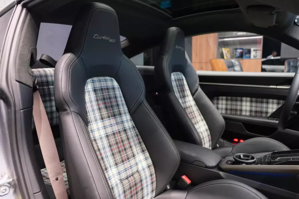 Nội thất của Porsche 911 Turbo 50 Years được mô phỏng theo chiếc Porsche 911 RSR Turbo tại triển lãm vào năm 1973, với da vải dệt caro. Khách hàng có thể giữ nguyên thiết kế ghế Adaptive Sports Seats Plus được bọc lớp vải dệt Tartan với họa tiết gia tộc McKenzie, hoặc nâng cấp bộ ghế da toàn bộ màu đen trị giá gần 100 triệu đồng.