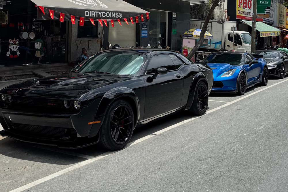 Dàn xe này gồm siêu xe Audi R8 V10 Plus cùng 2 mẫu xe thể thao cơ bắp Mỹ là Dodge Challenger SRT Hellcat và Chevrolet Corvette C7 Z06. Bộ đôi xe Mỹ thuộc sở hữu của một tay chơi xe tại TPHCM.
