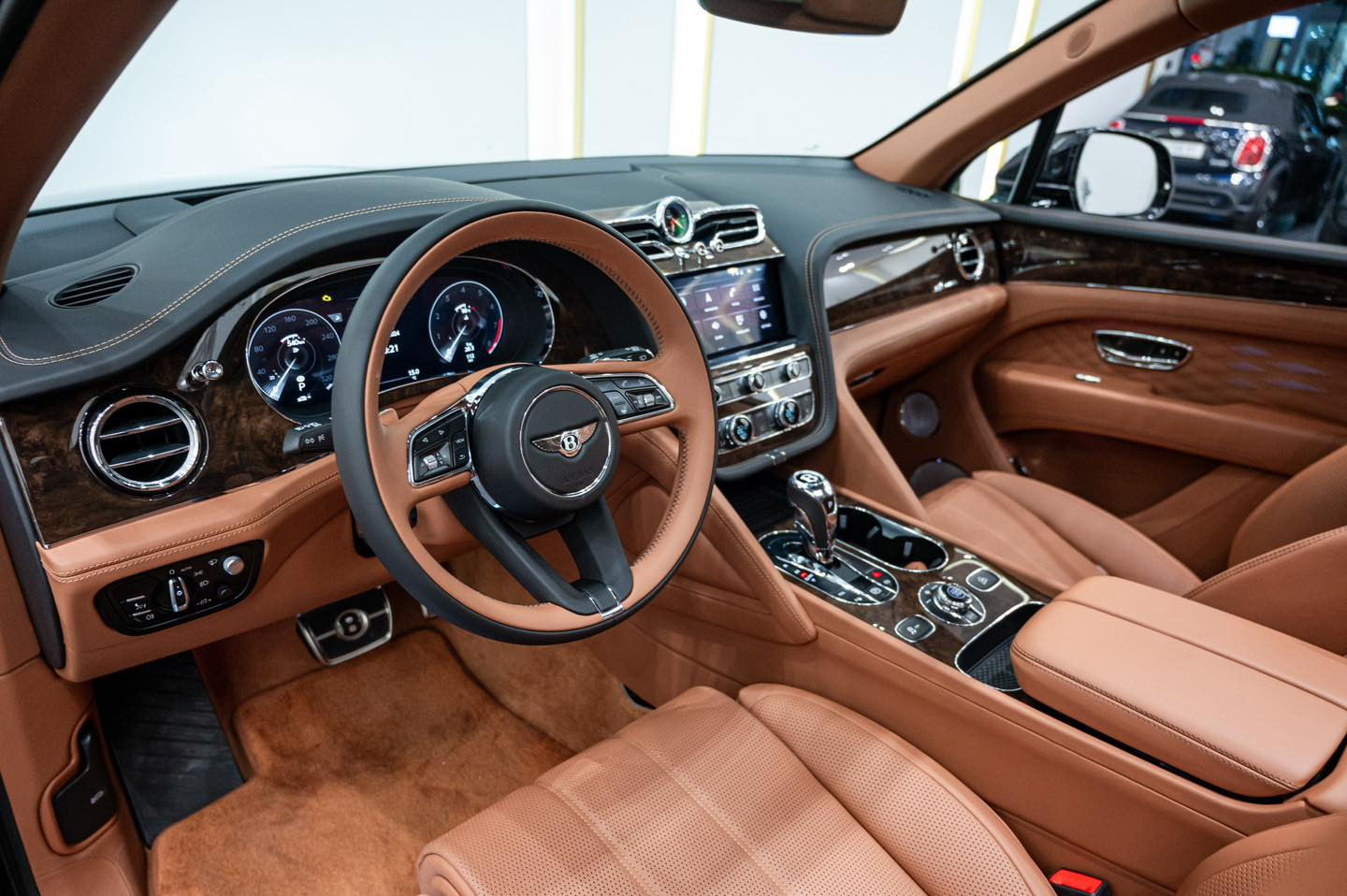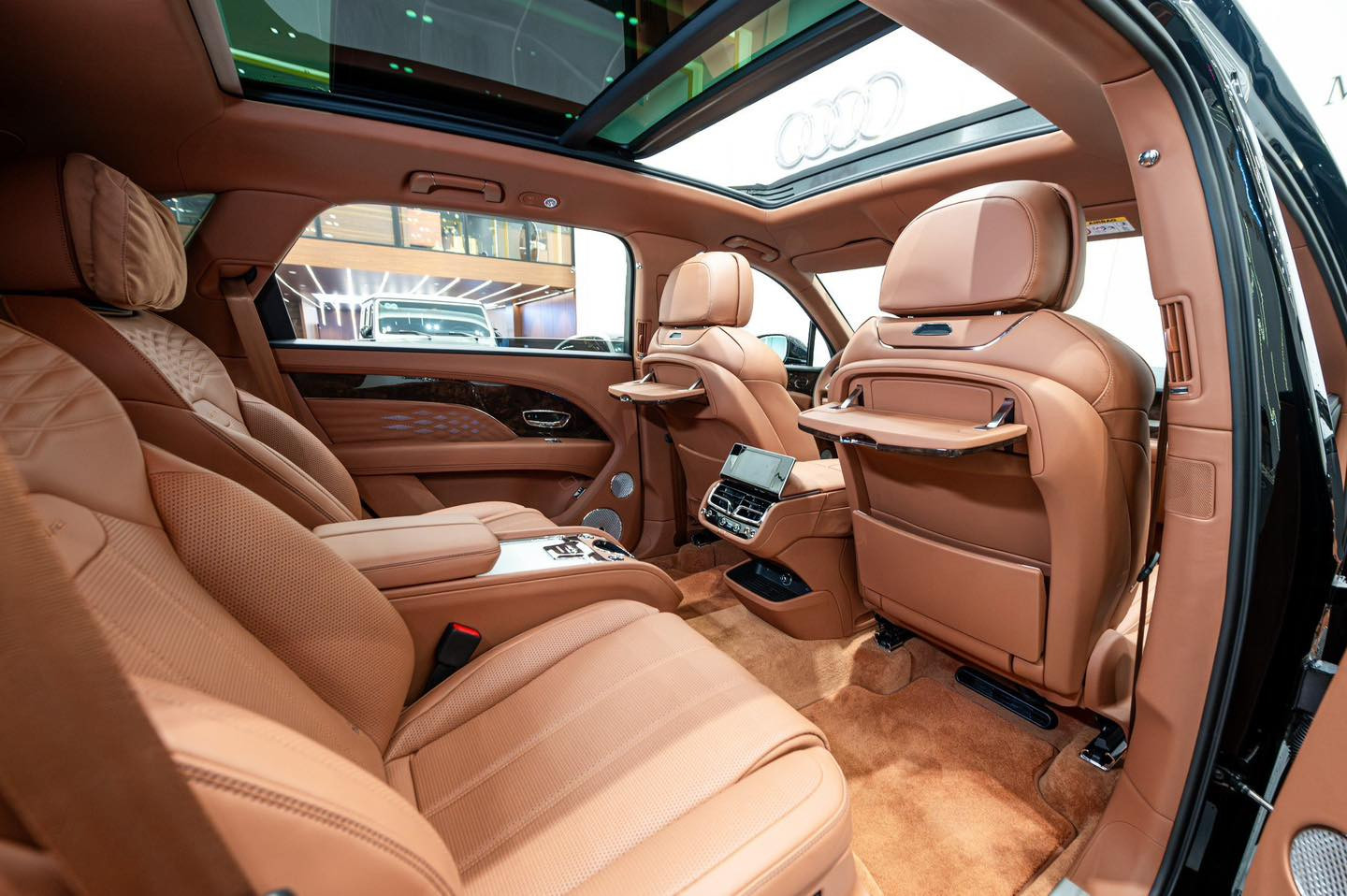 Chưa rõ nội thất xe sử dụng tông màu nào, nhưng Bentayga Azure về cơ bản giữ nguyên thiết kế từ bản thường. Nhiều chi tiết được bọc da cao cấp, đi kèm tùy chọn ốp trang trí bằng gỗ hoặc kim loại sáng. Điểm khác biệt lớn nhất giữa Bentayga tiêu chuẩn và Azure EWB là hàng ghế thứ hai mang cấu hình 2 ghế ngồi độc lập theo phong cách thương gia, ngăn cách bằng tựa tỳ tay cố định nhưng khoảng để chân rộng rãi hơn. Bên dưới là hộc chứa đồ, ngăn để cốc kèm tính năng làm nóng/mát, bảng điều khiển và sạc điện thoại.