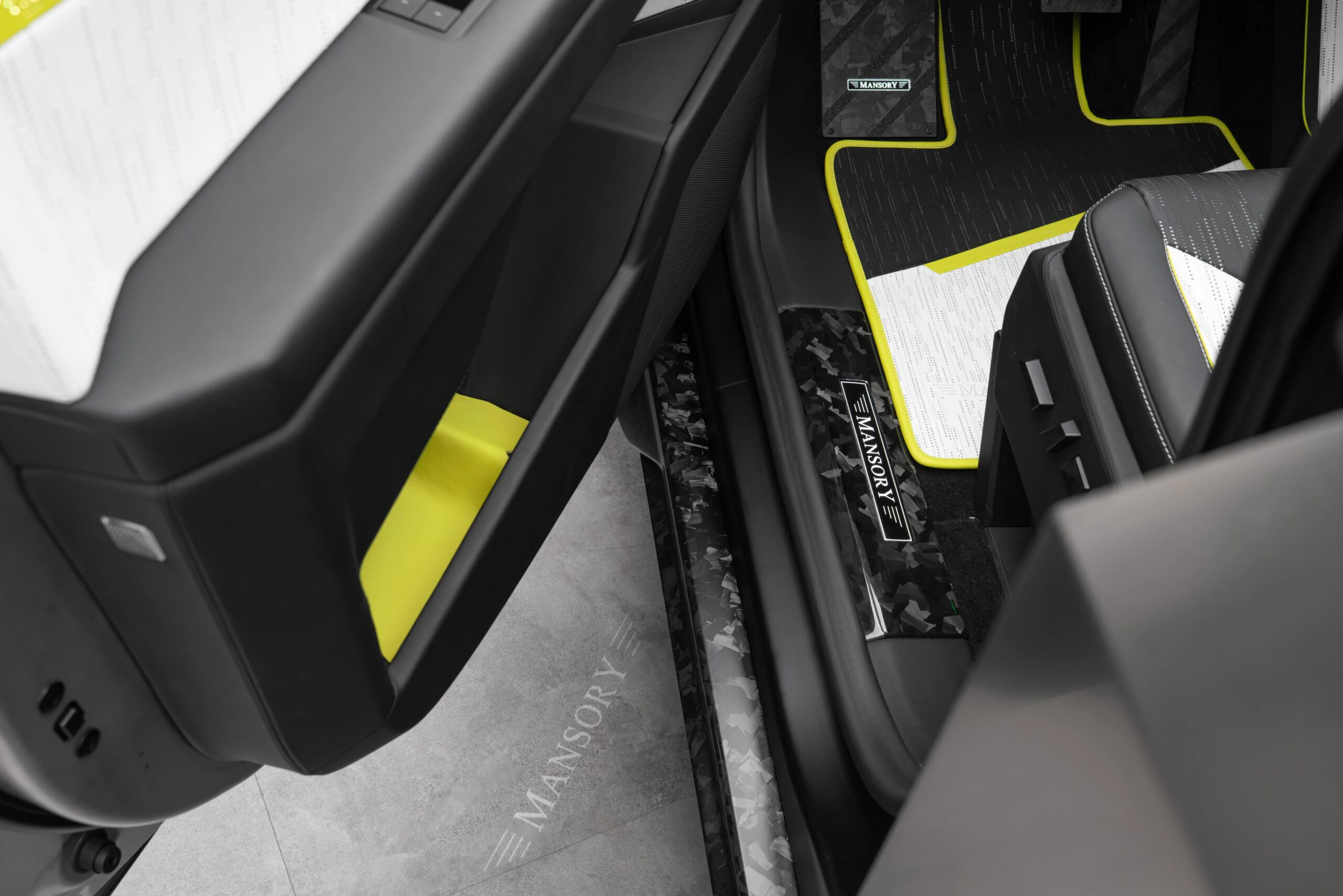 Gương chiếu hậu và phần thân dưới cũng được trang trí bằng vật liệu carbon. Mansory còn thiết kế thêm tấm ốp bằng sợi carbon đúc mô phỏng cửa sổ phụ kết hợp cùng huy hiệu đặc trưng của gói độ. Ở phía sau, Mansory cũng bổ sung hai vây gió nhỏ bằng carbon đúc được gắn trên khoang tải, chi tiết này chủ yếu đóng vai trò trang trí thay vì góp phần tăng cường tính khí động học.