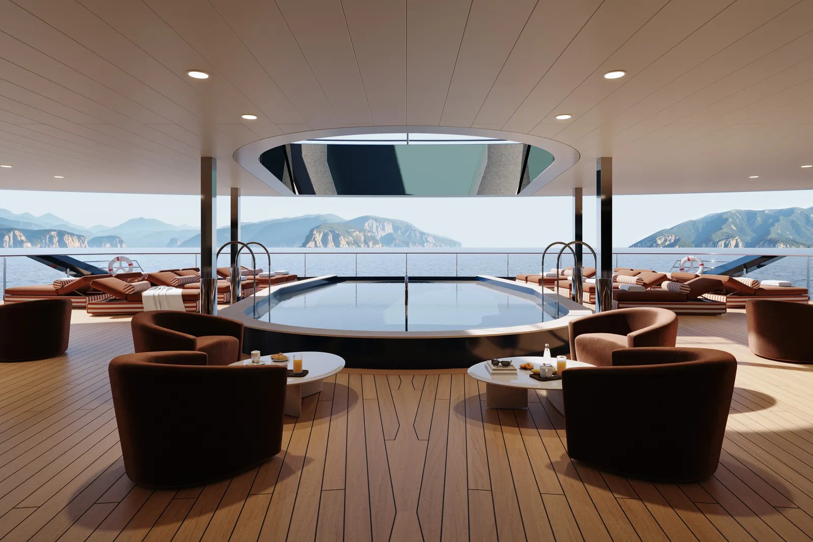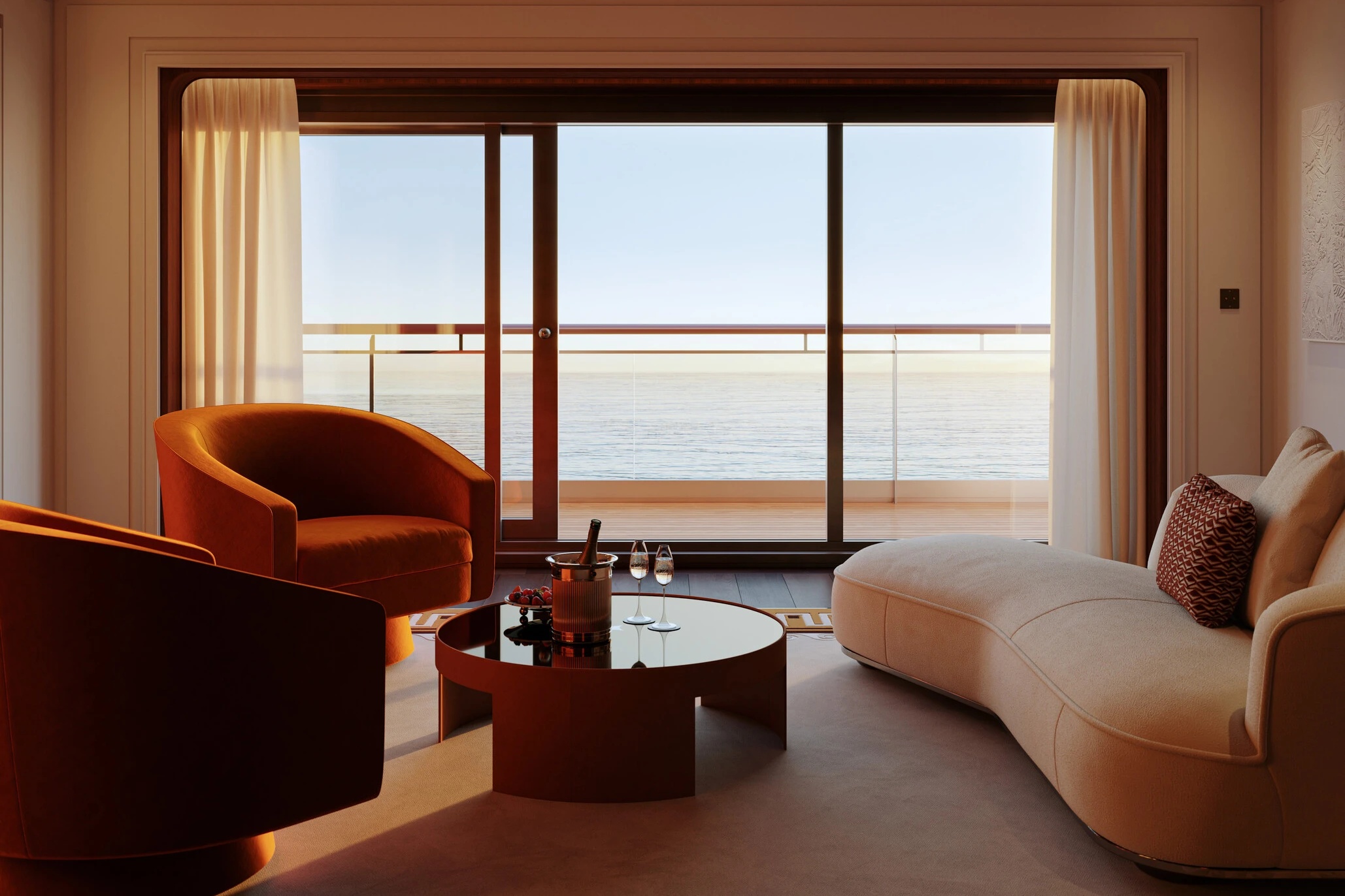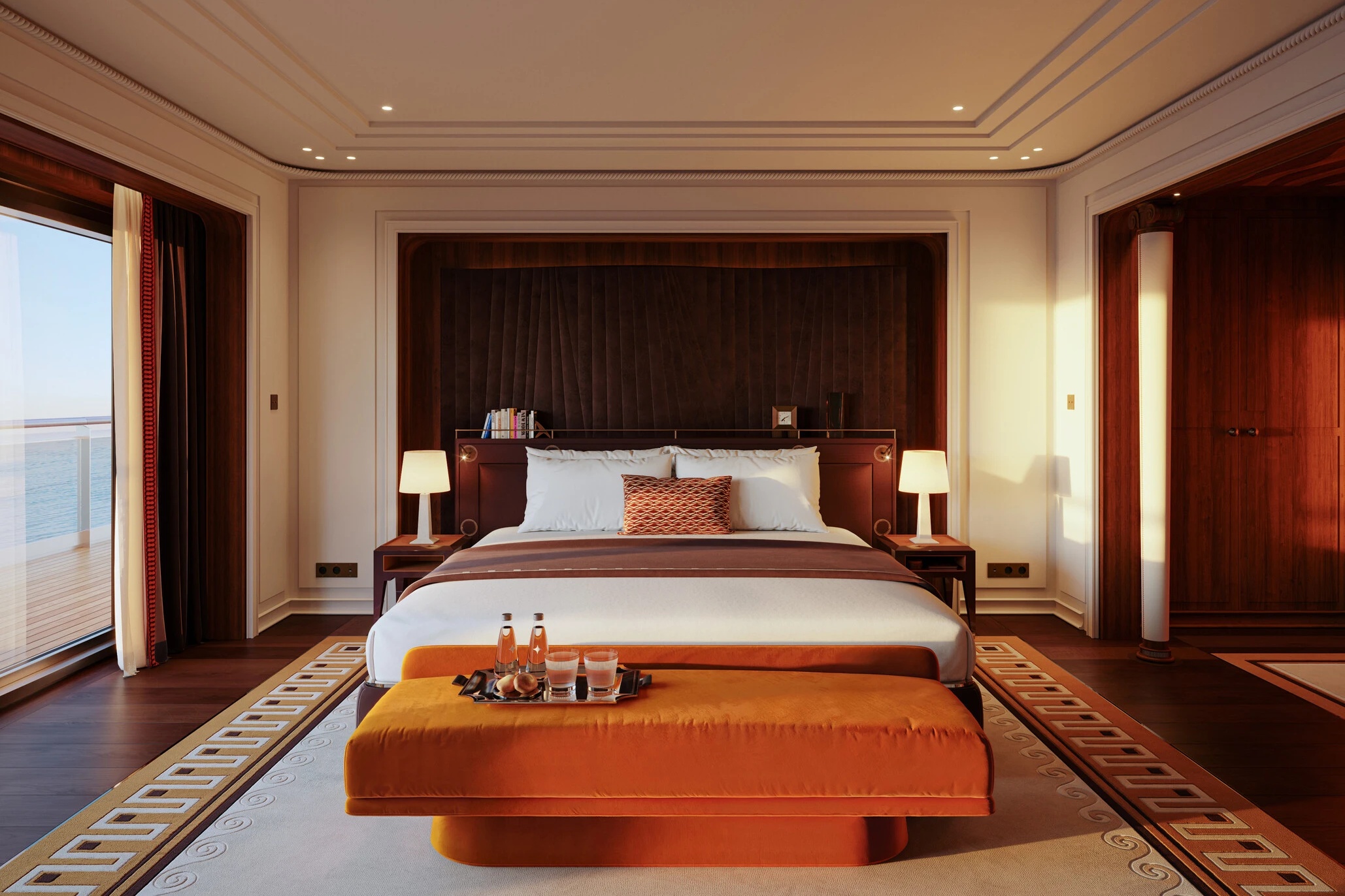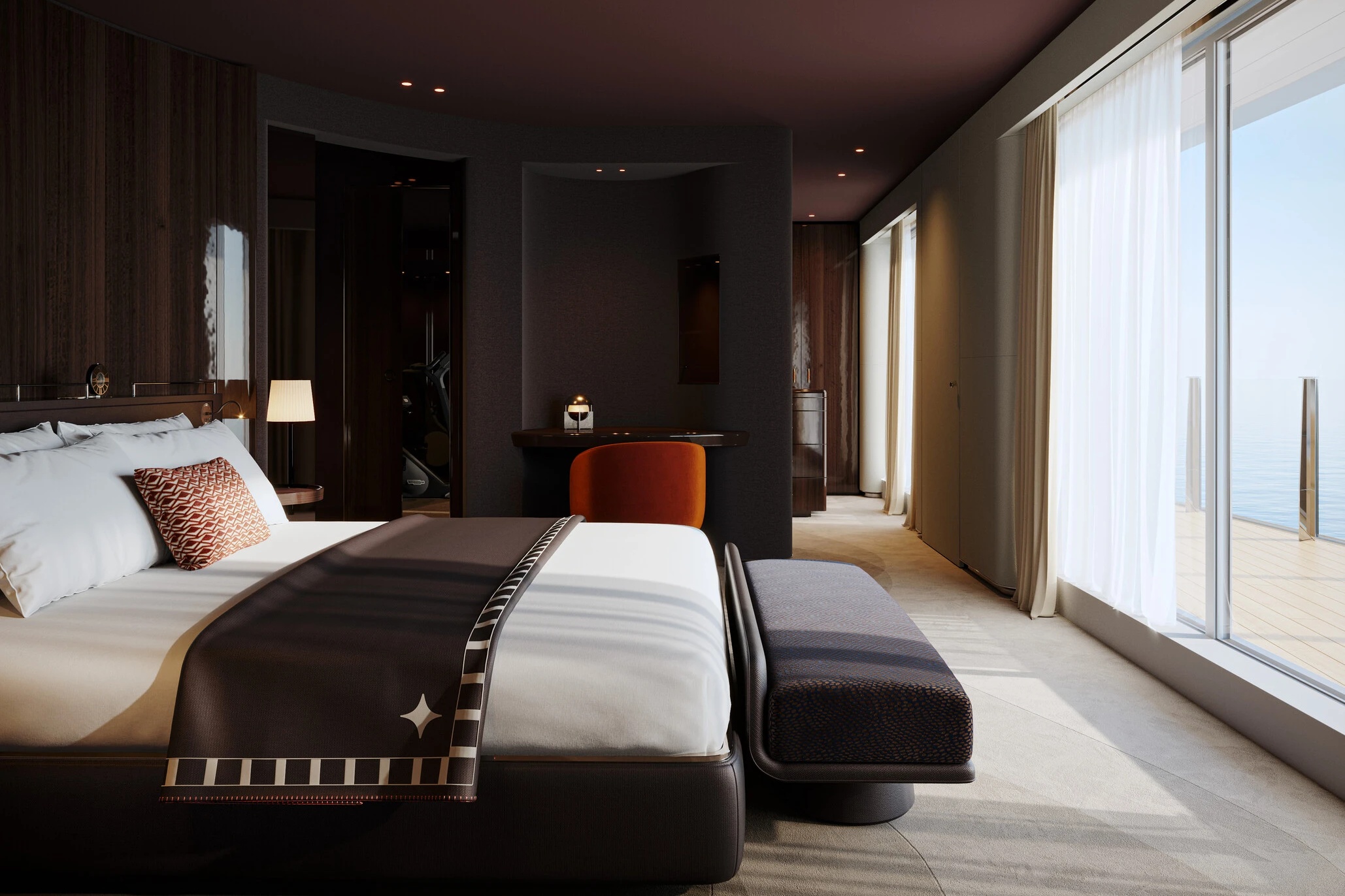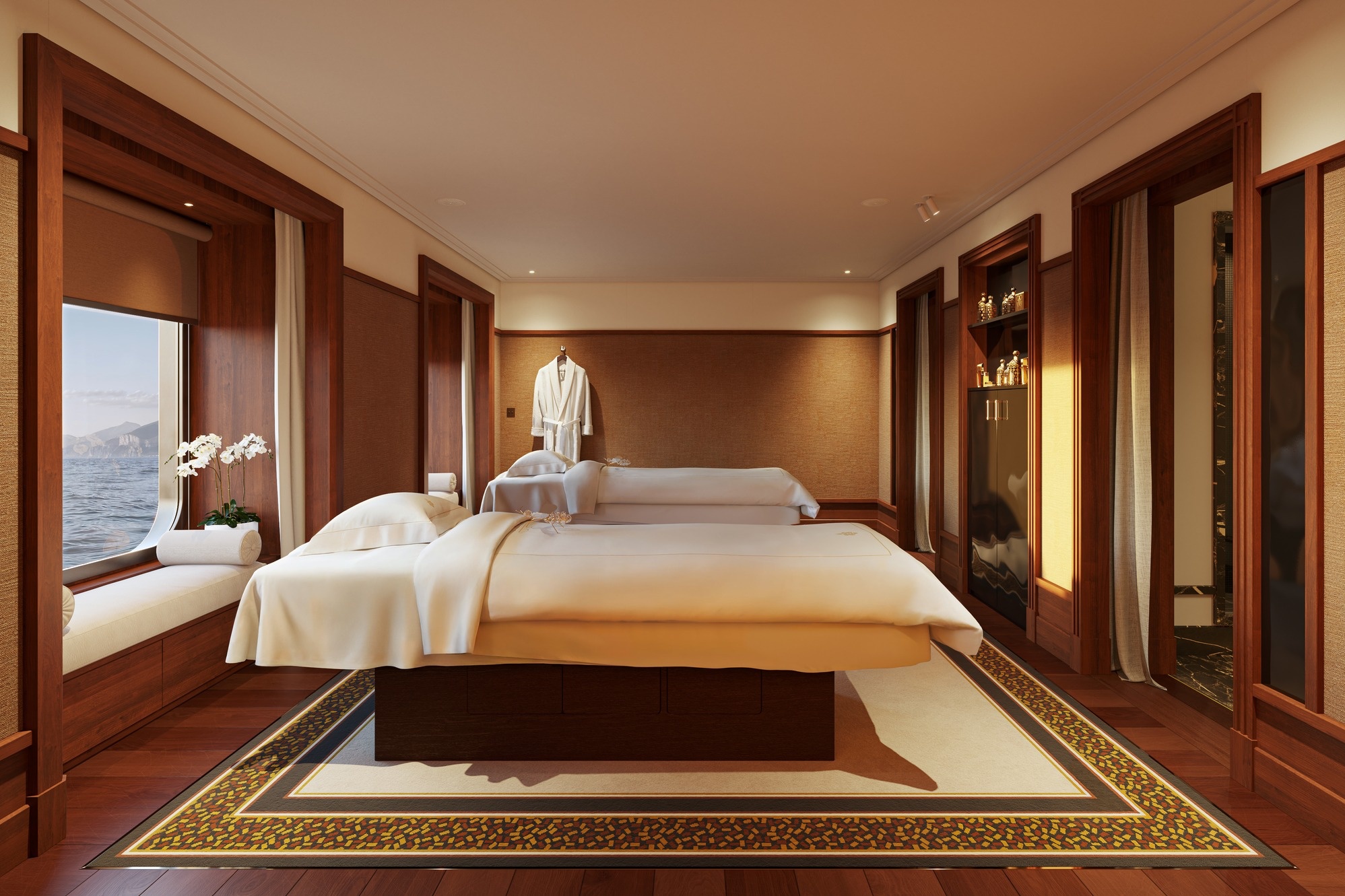 Song song đó, quy mô của chiếc thuyền cho phép mỗi căn phòng đều sở hữu hệ cửa sổ toàn cảnh với kích thước tối thiểu rộng 4m, hoặc ban công riêng biệt, tạo nên sự kết nối giữa không gian bên trong và cảnh quan bên ngoài. Trong đó, những phòng signature suite sẽ nằm ở tầng 4, 5, 6, và tầng 7 sẽ được dành riêng cho các phòng suite penthouse trên du thuyền. Mỗi phòng đều mang một phong cách và tinh thần riêng, cung cấp quản gia riêng, trải nghiệm điểm đến độc quyền trên một số hành trình, và các tiện nghi cao cấp, nhằm mang lại cảm giác “tự do tự tại” cho những ai mong muốn tìm kiếm sự thư thái trong suốt chuyến đi.