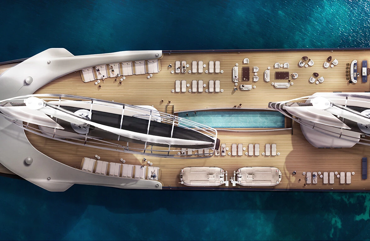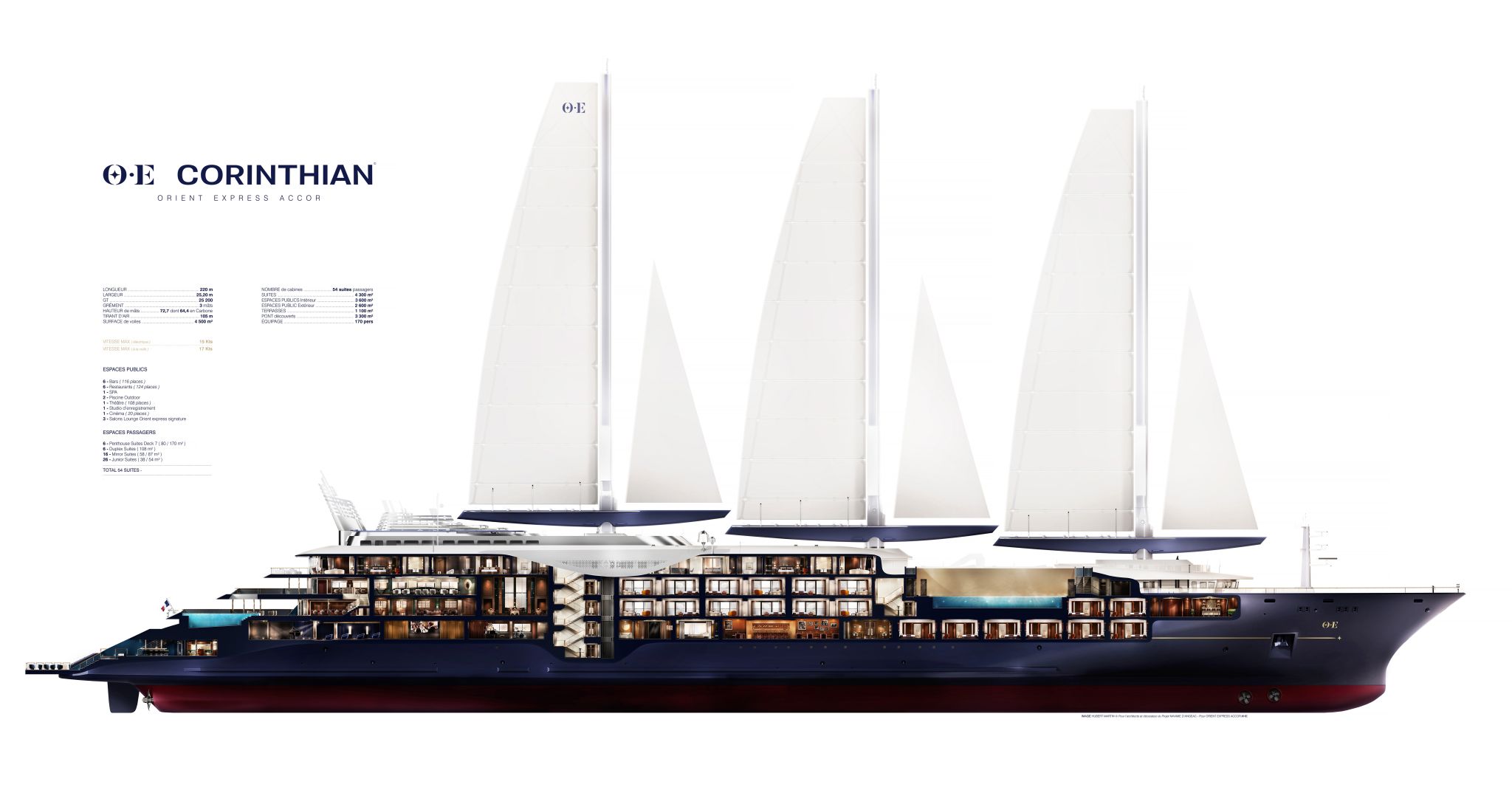 Không chỉ dừng lại ở vẻ ngoài ấn tượng, Orient Express Corinthian còn thể hiện bước tiến đáng kể của kỹ thuật hàng hải hiện đại khi được chế tạo tại xưởng đóng tàu Chantiers de l’Atlantique. Với chiều dài khoảng 220 mét, chiếc thuyền sở hữu 3 cột buồm cao hơn 100m, nâng đỡ hệ thống buồm cứng SolidSail có tổng diện tích lên đến 4.500m². Mỗi cánh buồm rộng 1.500m², được chế tạo từ vật liệu kính gia cường sợi carbon, có khả năng xoay và nghiêng 70 độ để đón gió một cách tối ưu, cho phép thuyền vận hành hoàn toàn bằng sức gió trong điều kiện thời tiết thuận lợi, từ đó giảm phụ thuộc vào nhiên liệu truyền thống.