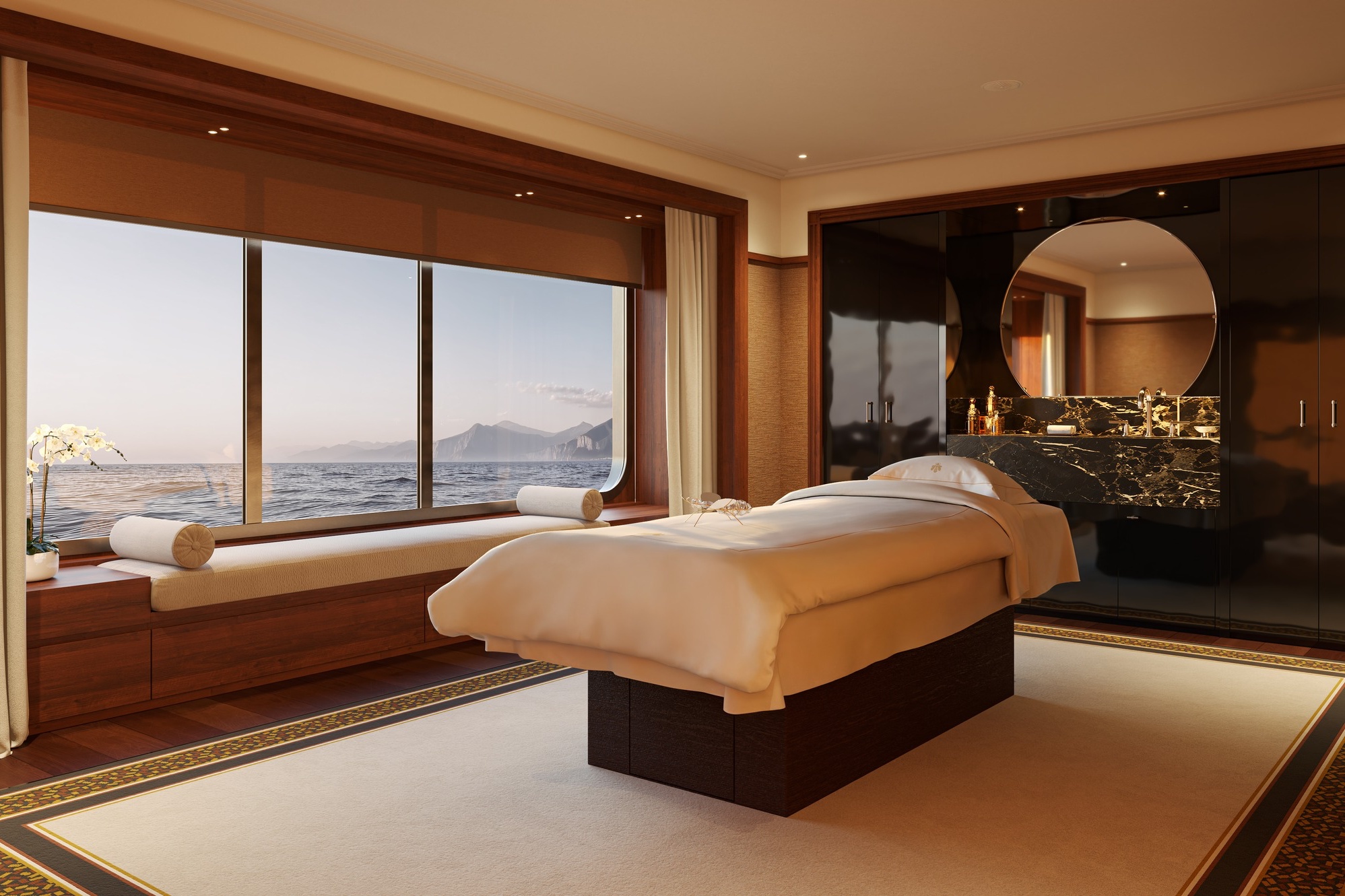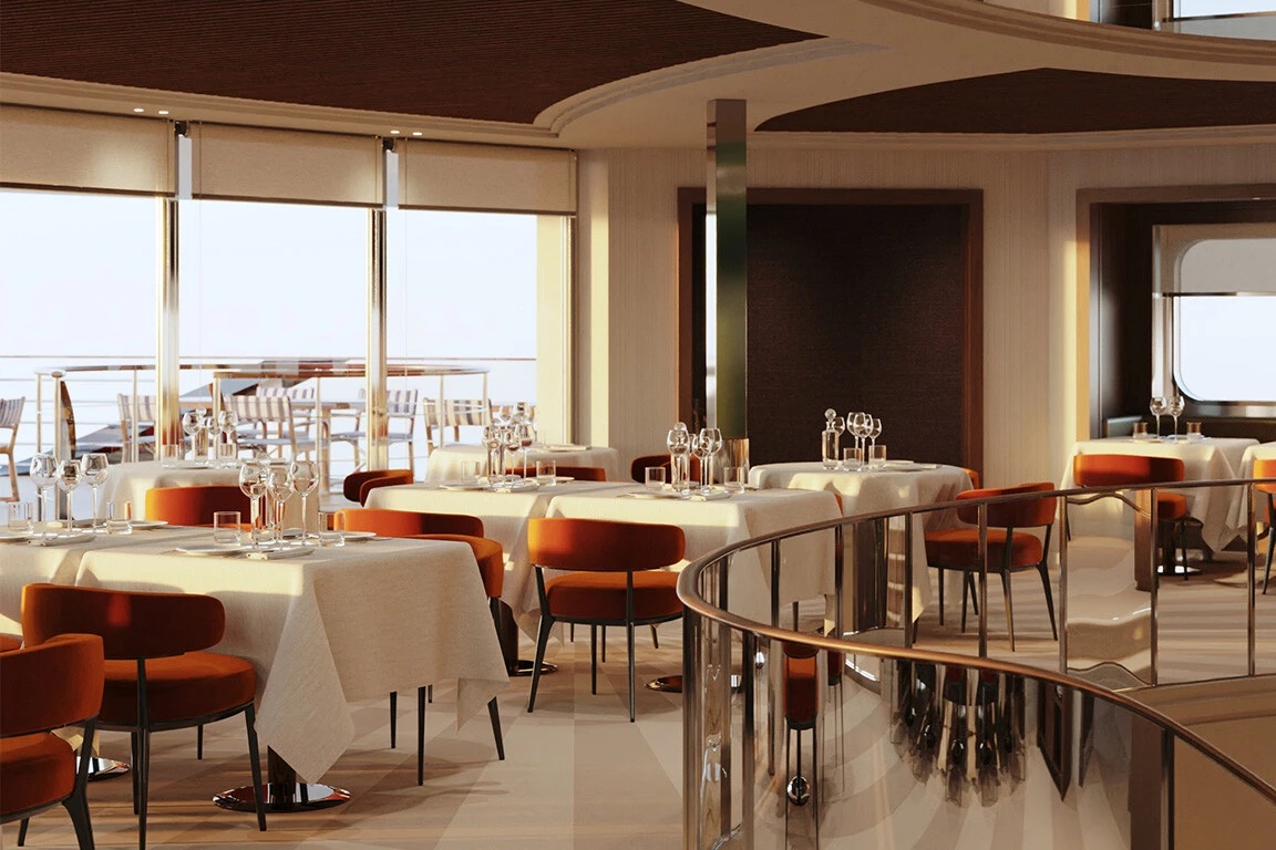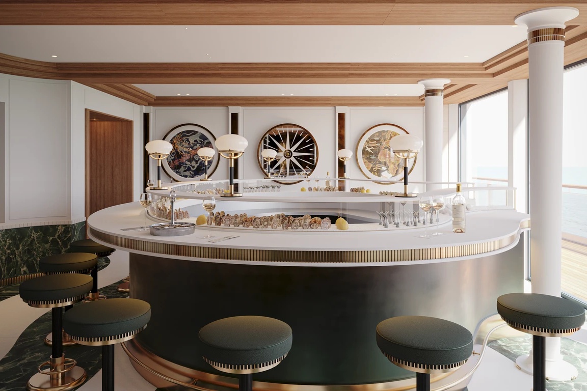 Dưới bàn tay dẫn dắt của kiến trúc sư danh tiếng Maxime D’Angeac – Giám đốc sáng tạo của Orient Express với 30 năm kinh nghiệm – không gian nội thất trên du thuyền mở ra một sự hài hoà giữa vẻ đẹp hoài niệm của những chuyến tàu huyền thoại và tinh thần hiện đại của các du thuyền ngày nay. Lấy cảm hứng từ thời đại hoàng kim của tàu hỏa và chiếc tàu thủy Normandie danh tiếng, từng chi tiết nhỏ đều được chăm chút kỹ lưỡng bởi những nghệ nhân chế tác bạc và vàng hàng đầu nước Pháp.