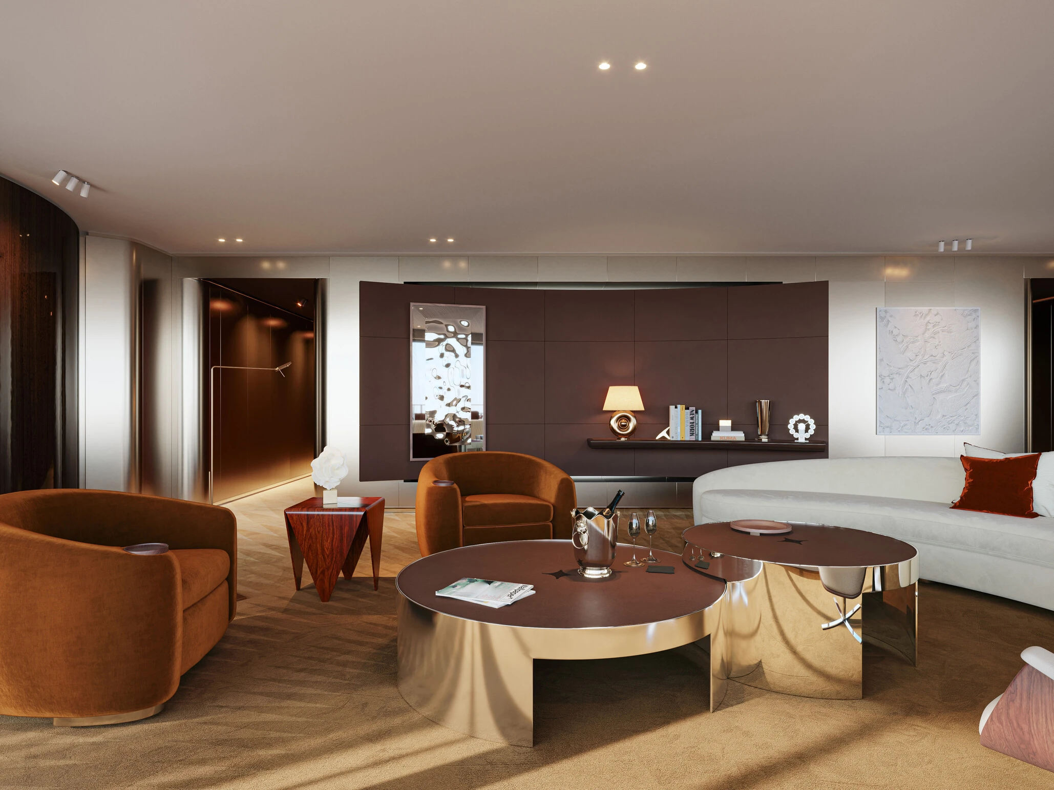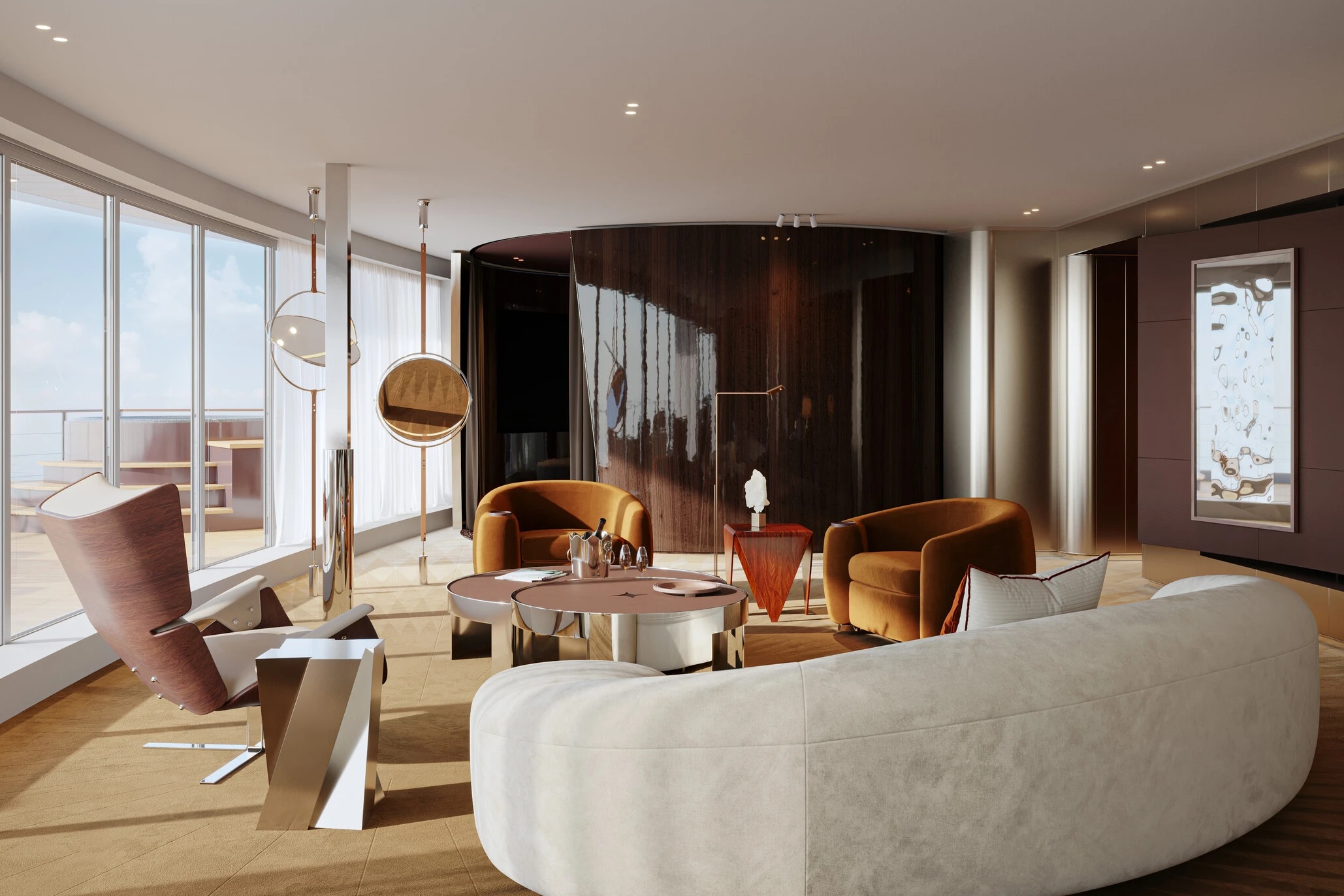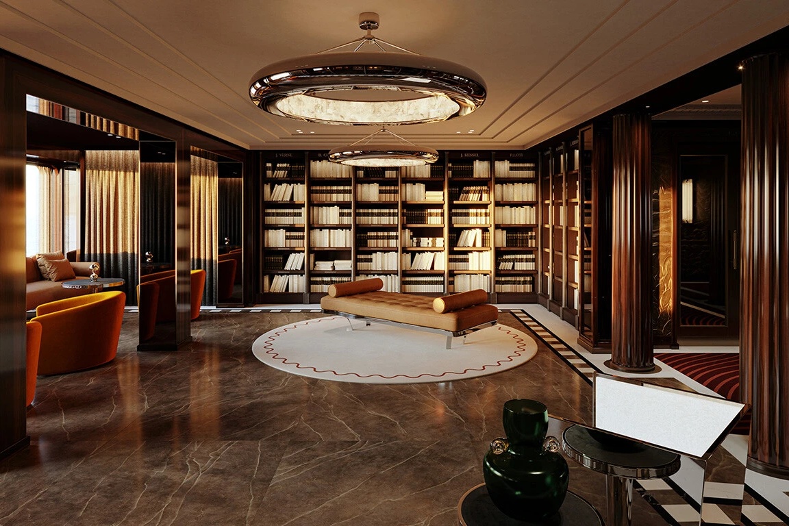 Từng góc nhỏ trong không gian đều kể một câu chuyện riêng, từ ánh sáng dịu nhẹ mang sắc thái cổ điển lan tỏa khắp không gian, chất liệu da và gỗ được chế tác thủ công cho đến các bộ sưu tập nghệ thuật được tuyển chọn một cách kỹ lưỡng. Hơn nữa, sự xuất hiện của đá cẩm thạch cùng các thiết kế nội thất độc đáo tạo nên một bầu không khí sang trọng nhưng không phô trương, tôn vinh nghệ thuật sống tinh tế của người Pháp giữa lòng biển cả.