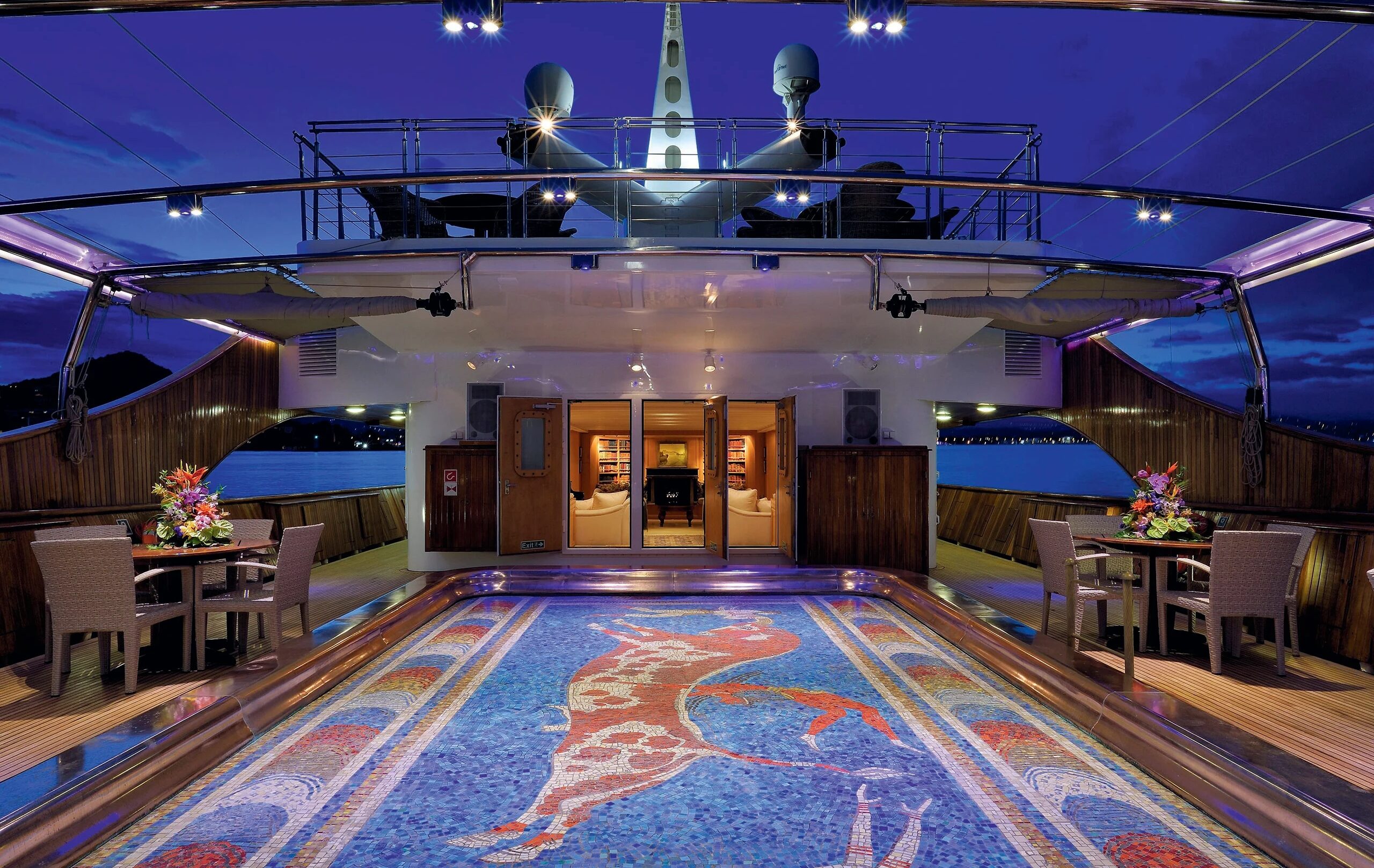 Với 11 cabin sang trọng, du thuyền có thể phục vụ tối đa 22 khách cùng đội ngũ 54 thành viên thủy thủ đoàn. Nổi bật nhất là spa hai tầng rộng hơn 400m², tích hợp phòng xông hơi, hammam, phòng massage và phòng gym hiện đại. Flying Fox còn có bể bơi nước biển dài 12 mét trên boong chính, hai sân đỗ trực thăng, rạp chiếu phim, khu vực giải trí ngoài trời và garage chứa dàn tender, jet ski cùng các thiết bị thể thao dưới nước.