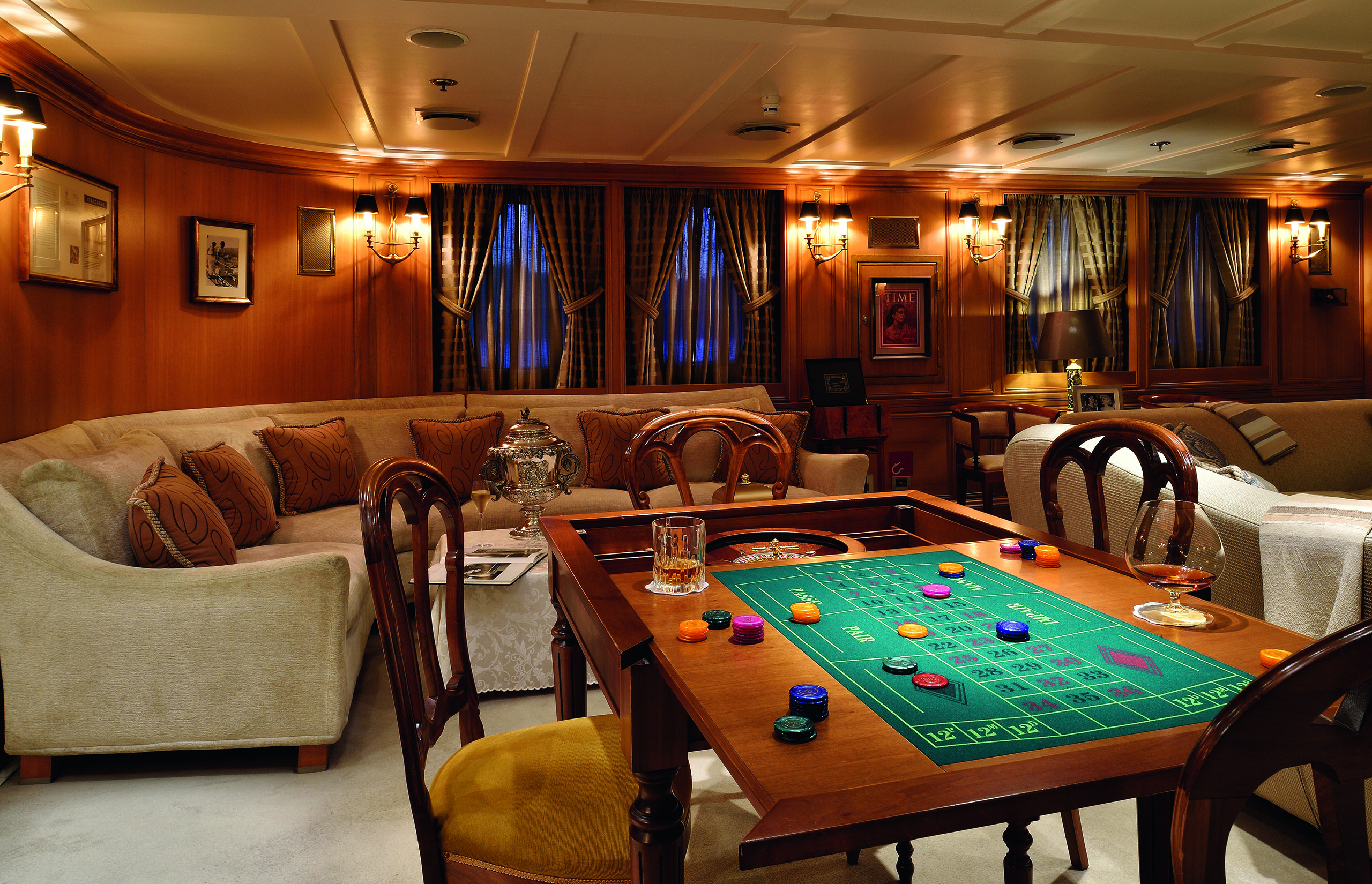 Rising Sun có tổng cộng 82 phòng, bao gồm 8 cabin dành cho khách, có thể phục vụ 16 khách cùng với đội ngũ 45 thành viên thủy thủ đoàn. Không gian nội thất được hoàn thiện với gỗ quý, đá onyx và các vật liệu cao cấp khác, tạo nên bầu không khí sang trọng, ấm cúng nhưng không kém phần hiện đại.