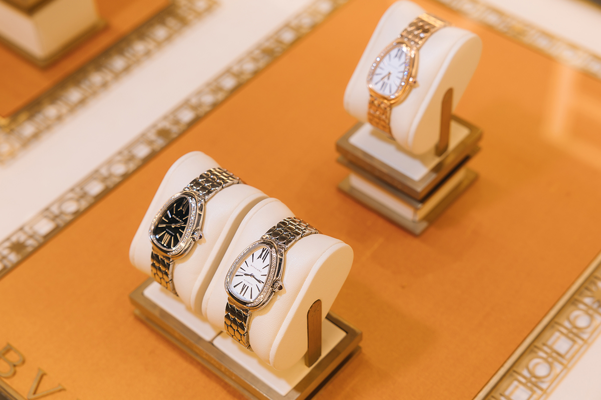 Tại khu vực trưng bày trang sức của Bvlgari, vẻ đẹp tinh tế và giá trị vượt thời gian được thể hiện qua từng đường nét thủ công tỉ mỉ trên các mẫu trang sức biểu tượng Serpenti, Divas’ Dream, và B.Zero1. Sự tinh xảo này tiếp tục được thể hiện qua các bộ sưu tập đồng hồ, từ nét quyến rũ lộng lẫy và uyển chuyển của Serpenti đến sự tinh tế, chính xác trong từng đường chạm khắc của Octo.
