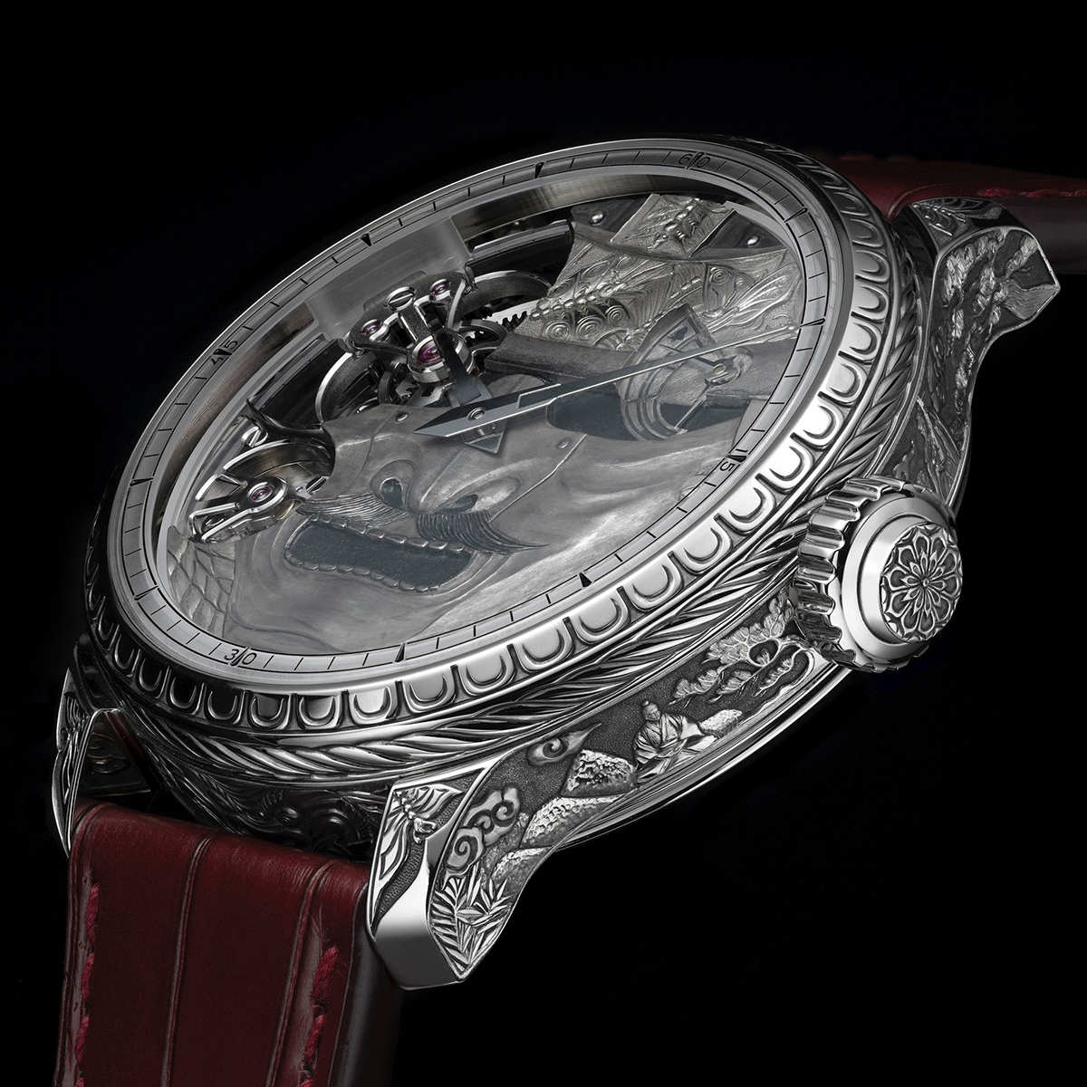 Trung tâm mặt số là chiếc mặt nạ “Menpō”, toát lên một khí chất oai nghiêm, đầy uy lực. Đây là biểu tượng cho danh dự, kỷ luật và lòng trung thành, gợi nhớ đến những chiếc mặt nạ bằng sắt của thời kỳ Edo. Tại vị trí 2 giờ là chỉ báo dự trữ năng lượng kép: Vòng hiển thị bên ngoài trang trí bằng họa tiết cái chuông, sử dụng kim dài để chỉ báo mức dự trữ năng lượng cho cơ chế điểm chuông, vòng hiển thị bên trong sử dụng một kim ngắn hơn để chỉ báo mức dự trữ năng lượng cho bộ máy.
