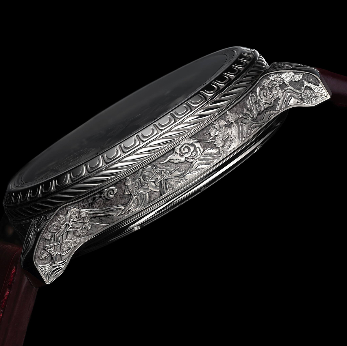 Nhà chết tác đã ứng dụng chất liệu vàng trắng 18K khai thác có đạo đức làm bộ vỏ, núm vặn và vành bezel có đường kính 42.5mm. Đặc biệt, vành bezel được chạm khắc hoa văn “Kebiki-odoshi” (mô phỏng kỹ thuật bện dây áo giáp). Núm vặn được điêu khắc hình hoa mẫu đơn (Peony) – biểu tượng cho danh dự, lòng dũng cảm và sức mạnh. Thân vỏ được biến hóa thành một bức bích họa điêu khắc thu nhỏ, ghi lại hai khía cạnh đối lập của một võ sĩ: một bên là khoảnh khắc tĩnh tại thưởng nhạc và một bên là cảnh chiến trường khốc liệt.