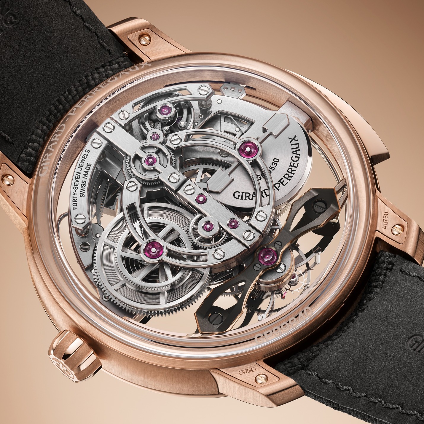 Bộ vỏ vàng hồng 46mm mang lại sự hiện diện mạnh mẽ trên cổ tay chủ nhân, nhưng vẫn giữ được sự thanh lịch đặc trưng. Mặt kính sapphire hai chiều cho phép chiêm ngưỡng toàn bộ bộ máy cơ tinh vi, một lời mời gọi lặng lẽ để khám phá sự tinh xảo thủ công ở mức độ cao nhất. Minute Repeater Flying Bridges không chỉ là một chiếc đồng hồ grand complication mà là minh chứng sống động cho khả năng cân bằng giữa truyền thống và tinh thần đổi mới của Girard-Perregaux, giao điểm nơi âm thanh của quá khứ tiếp tục vang vọng, tinh khiết và bất diệt, trong từng khoảnh khắc hiện tại.