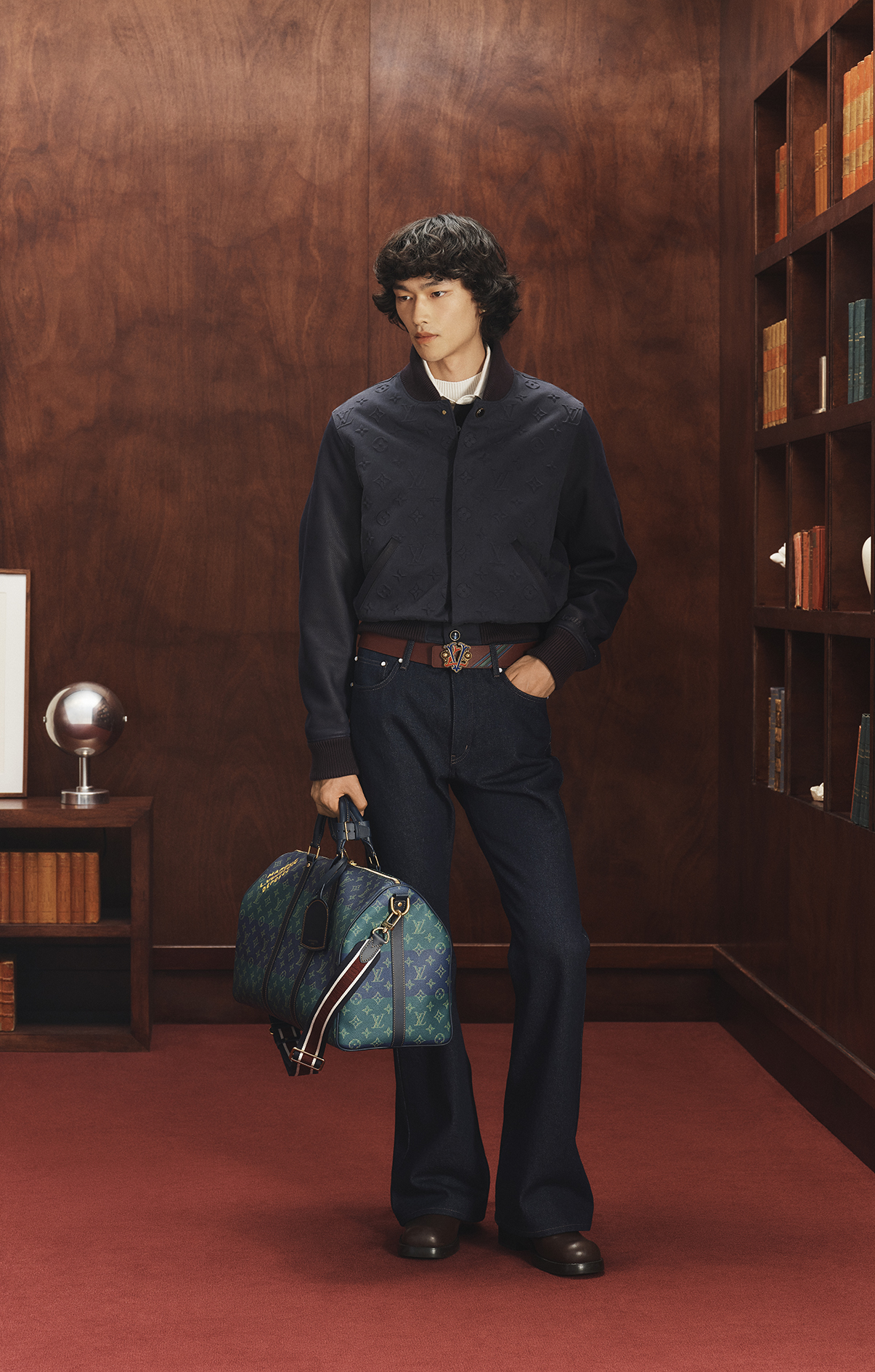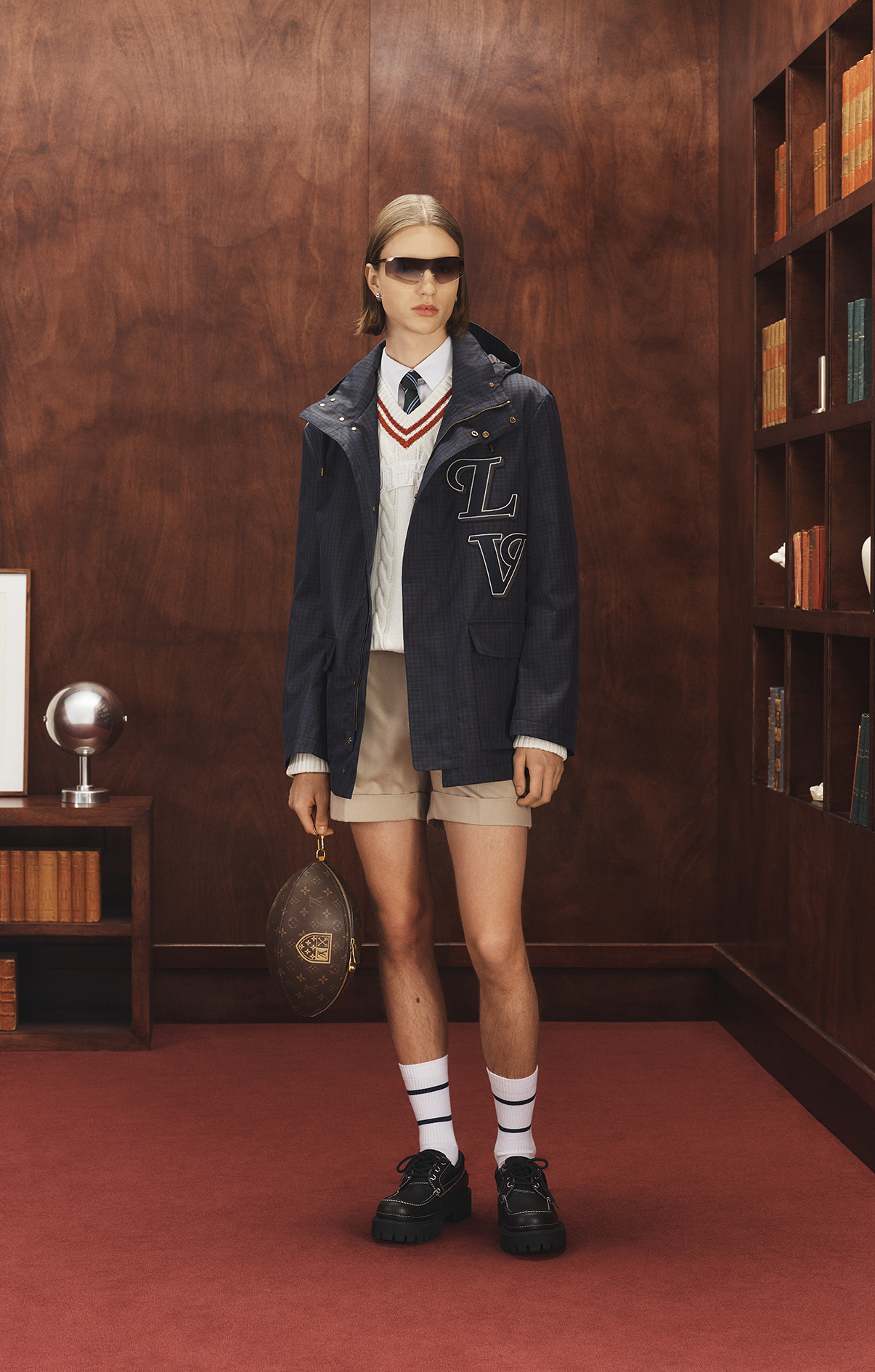 Tính xuyên mùa của BST mang đến những lựa chọn áo khoác (outerwear) đa dạng, như: áo khoác workwear xanh navy bằng len double-face, cashmere và lụa có thể đảo mặt thành sọc Monogram Heritage; áo chần bông Monogram vừa có thể mặc riêng vừa phối trong; áo khoác bouclette xanh navy một hàng khuy gợi vẻ trang trọng; áo camel jacquard double-face với khăn Monogram tháo rời lại toát lên sự thư thái. Áo khoác varsity da xanh navy mang tinh thần chuyển mùa. Knitwear gauge-7 phù hợp khí hậu thành thị, đi cùng áo jersey thêu nổi hiệu ứng len dòng chữ Marque Louis Vuitton Déposée. Quần cargo và short gợi cảm hứng workwear, cân bằng nét preppy tinh tế, kết hợp cùng track top pha chất liệu và áo khoác trucker chỉn chu.