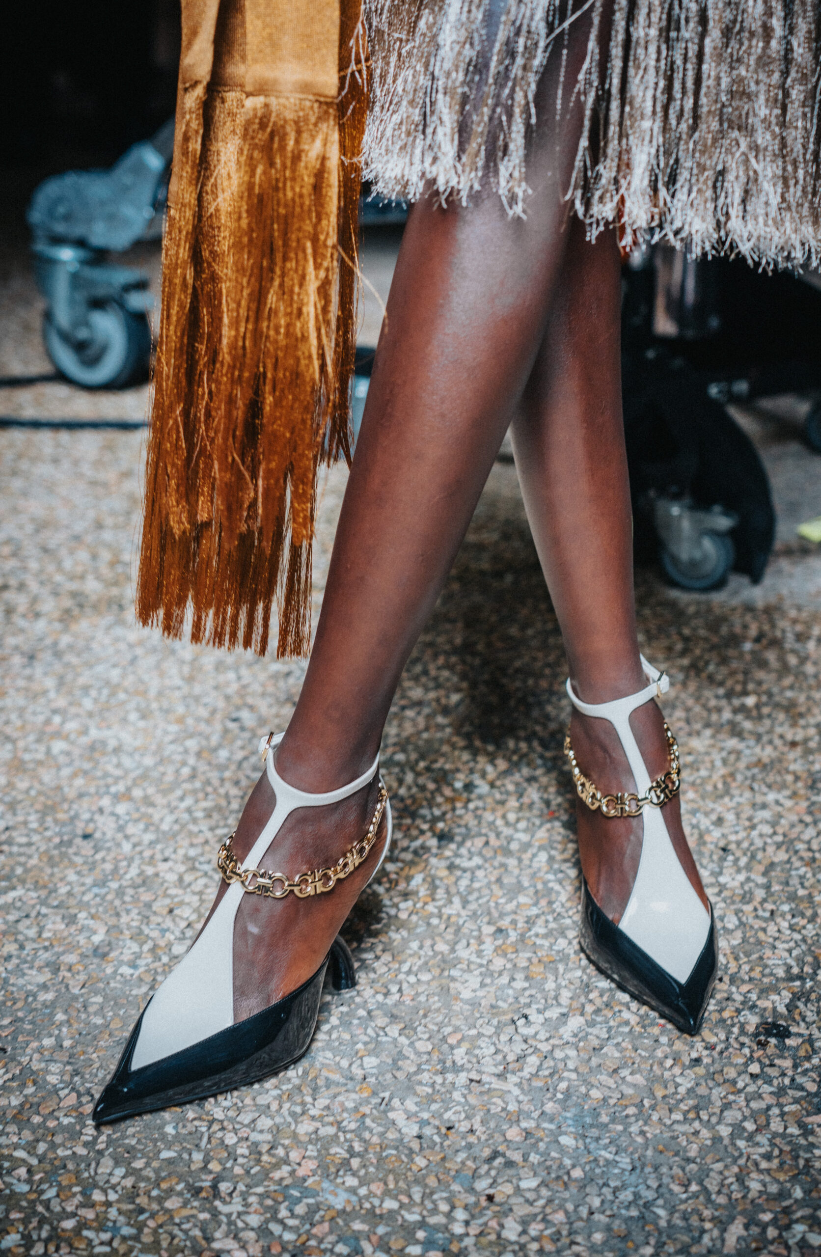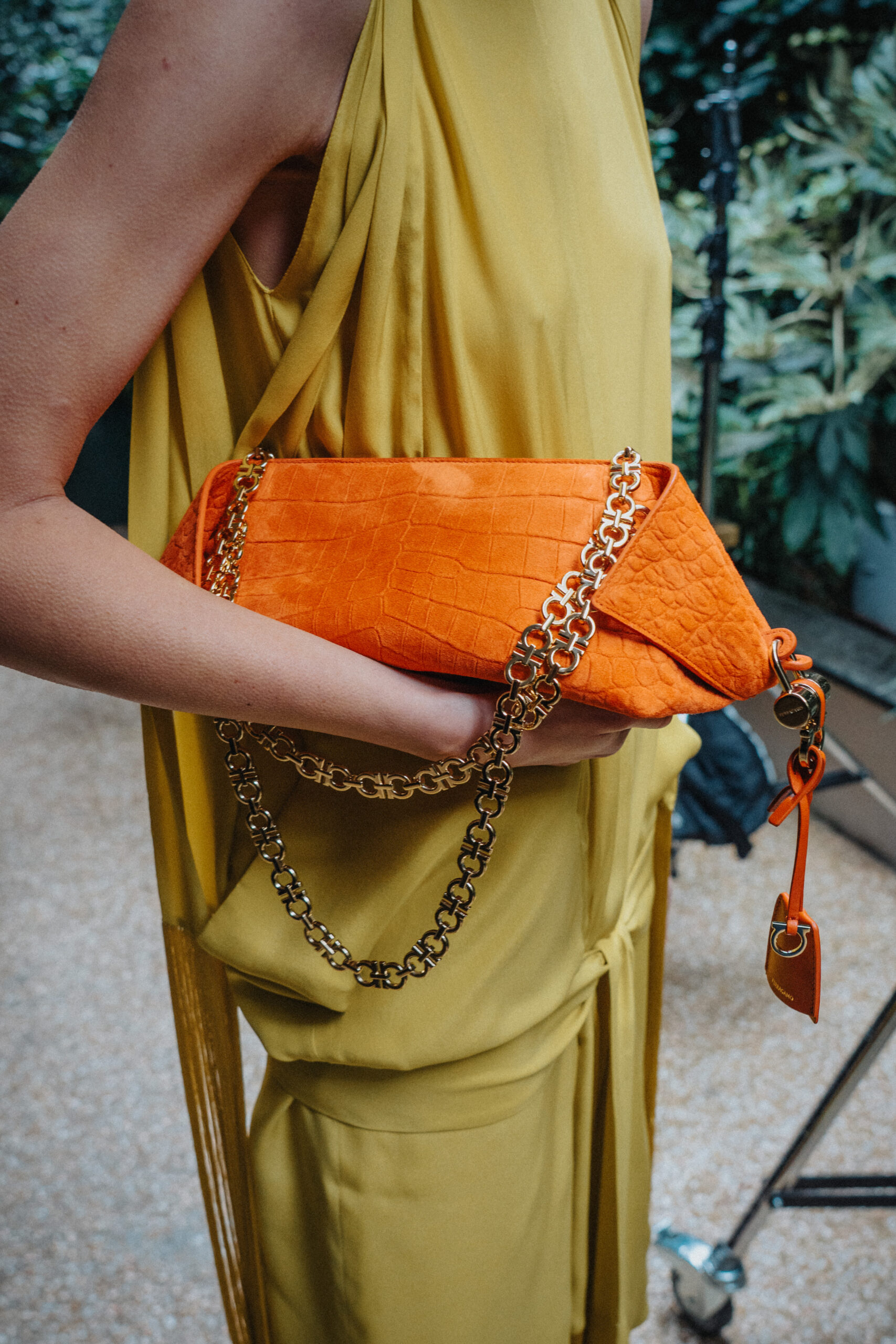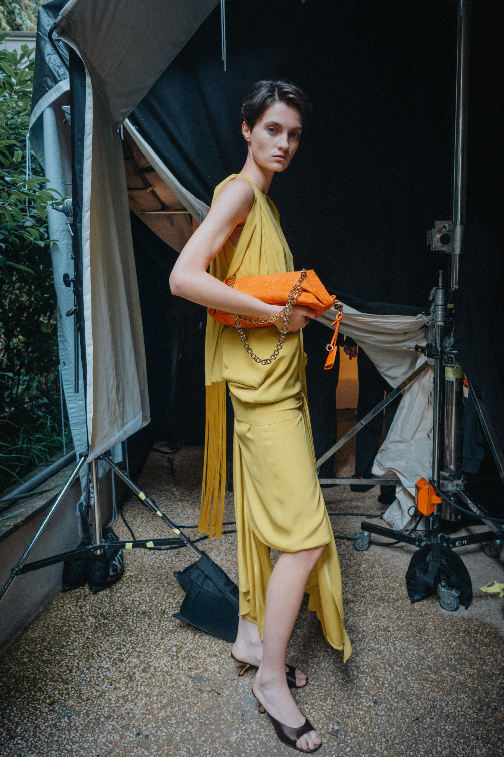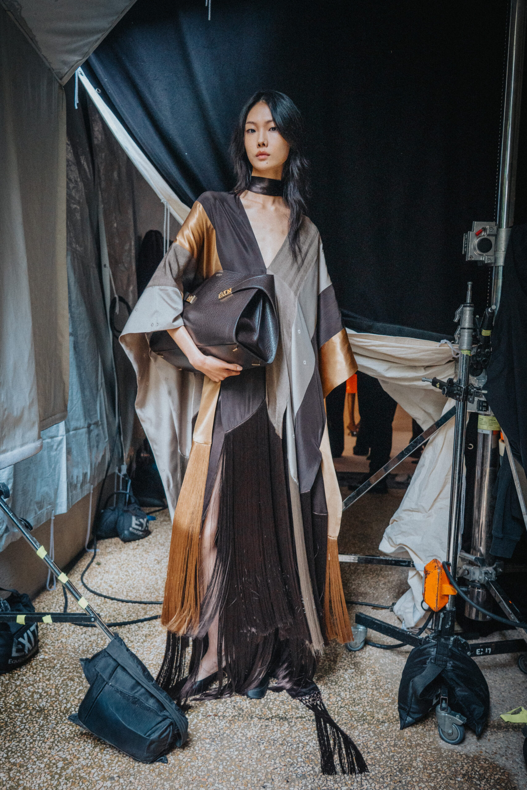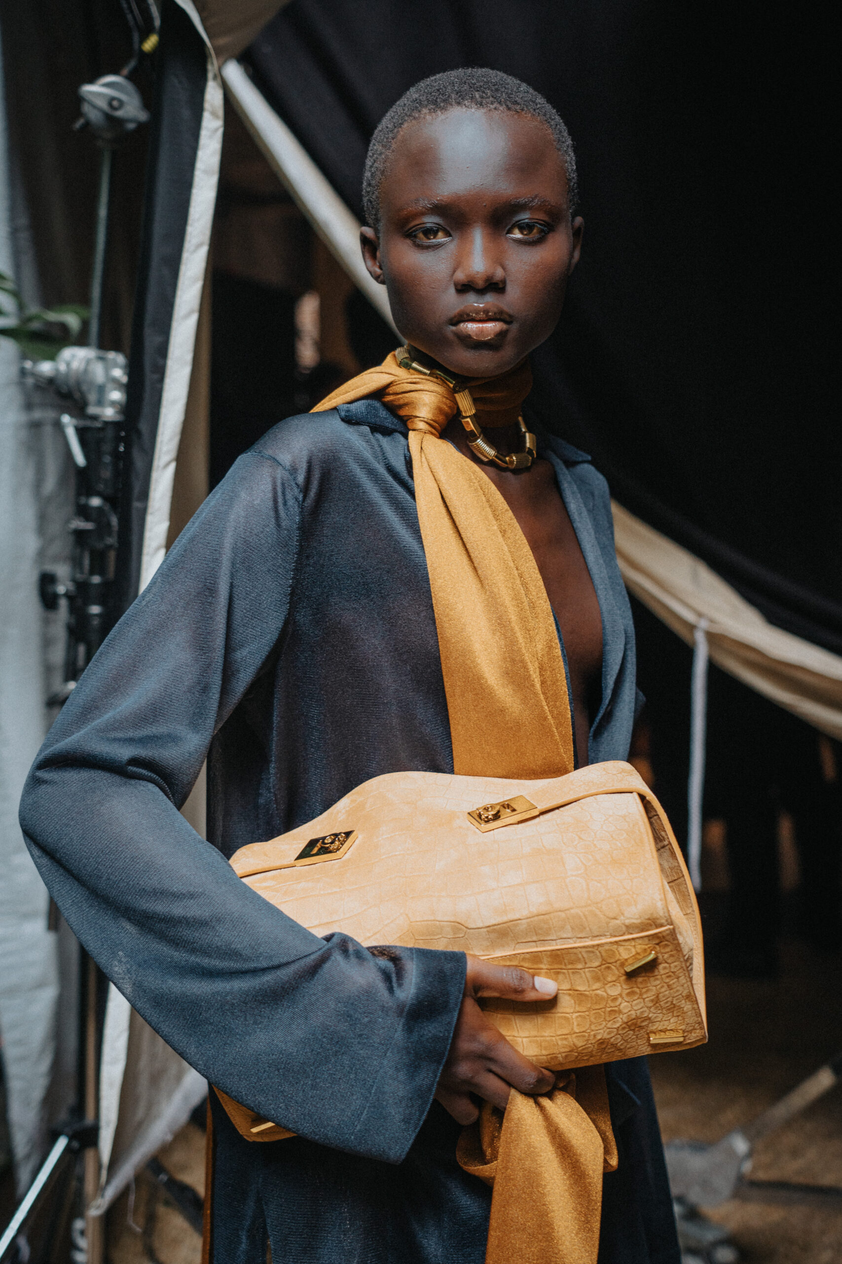 Từ kho lưu trữ hình ảnh cũ của Ferragamo, hình ảnh năm 1925 của ngôi sao màn bạc câm Lola Todd trong bộ trang phục toàn bộ họa tiết báo đã khơi gợi cảm hứng cho việc khám phá các họa tiết và chất liệu đặc trưng của phong trào “Africana” trong thời kỳ nhạc jazz. “Tôi quan tâm đến cách những chất liệu, họa tiết và vải vóc từ châu Phi và vùng Caribe được đưa vào Mỹ và châu Âu, trở thành biểu tượng của địa vị xã hội,” Davis chia sẻ – và giờ đây, tinh thần đó được tái hiện trong những thiết kế lụa satin devoré (kết hợp giữa chất liệu satin và kỹ thuật devoré) in động vật, trang sức da plongé (da cừu hoặc da bê mỏng và mềm được nhuộm xuyên thấu để giữ lại độ tự nhiên), cùng chi tiết tua rua. Thời kỳ “Roaring Twenties” đã được tái hiện qua BST này.