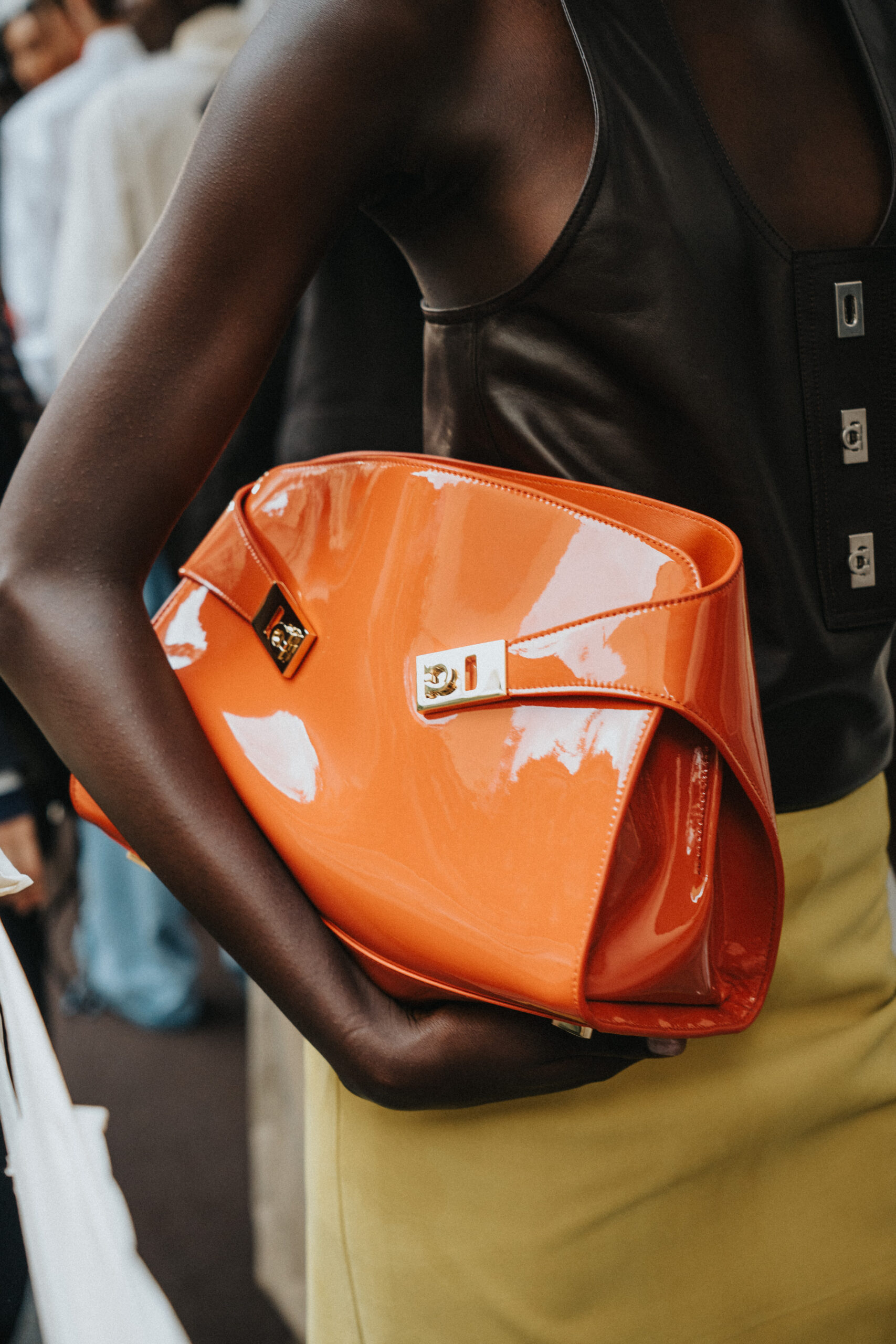 Ở dòng phụ kiện, chiếc túi Hug mang tính biểu tượng trở lại với những diện mạo mới, biến hóa qua nhiều chất liệu, từ da bóng, da đan tay, da dập vân cá sấu và da nubuck mờ mịn. Bên cạnh đó là chiếc túi gấp gợi hứng từ khăn lụa, khoác lên gam màu và họa tiết đặc trưng của mùa này, điểm xuyết chi tiết kim loại Gancini có thể tháo rời.