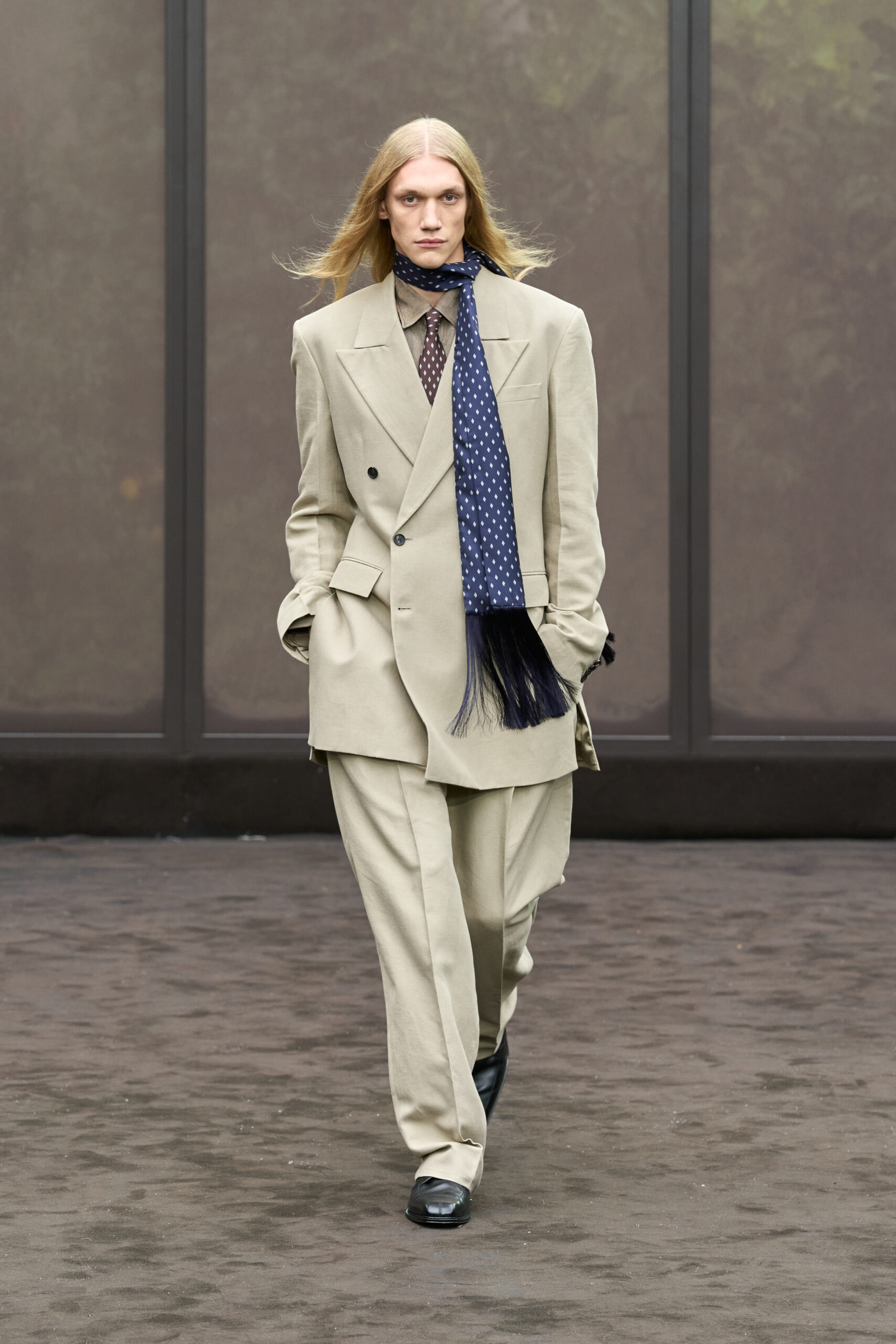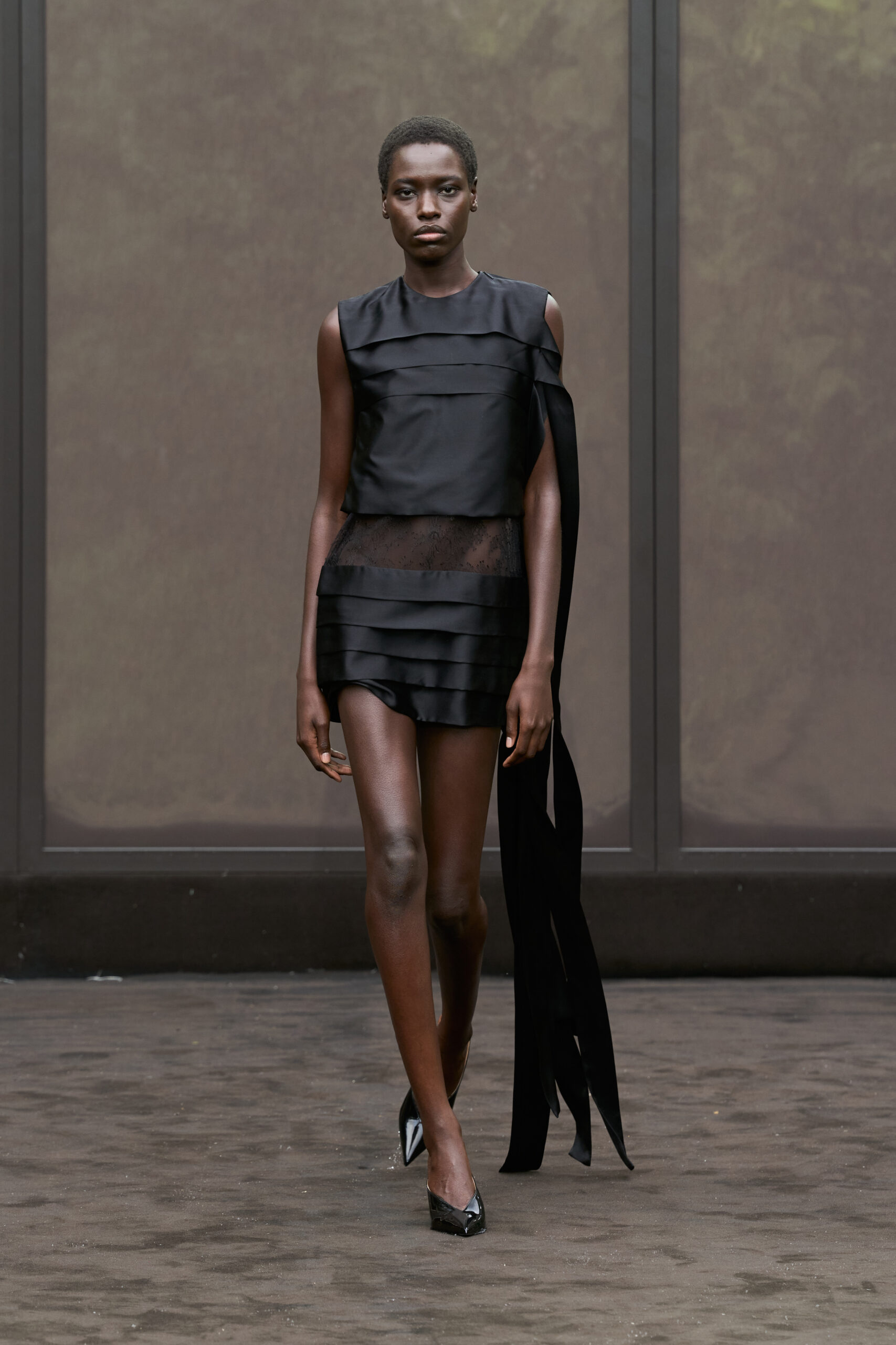 Tinh thần thanh thoát và tự do của thời đại cũng được khắc họa rõ nét cùng những bộ vest lấy cảm hứng từ không khí hộp đêm sôi nổi, váy suông thẳng điểm xuyết ren mảnh, những chiếc đầm với đường eo hạ thấp và phần lưng khoét sâu đầy gợi cảm. “Đó là thời khắc phụ nữ kiến tạo một vẻ đẹp nữ tính mới – một lời tán dương cho tự do, cho quyền làm chủ chính mình,” Davis chia sẻ. “Con người khi ấy đang tìm cách mở ra không gian riêng, nổi loạn trước những khuôn thước xã hội, và tinh thần ấy được phản chiếu trong từng đường may, nếp gấp của trang phục.” Ở thời trang nam giới, phong vị phóng khoáng của thời kỳ Phục hưng Harlem cùng sự hào hoa, lối ăn mặc cầu kỳ đã thổi bùng nguồn cảm hứng. Trong khi chiếc cà vạt – biểu tượng quen thuộc của nam giới lại được biến tấu thành dải lưng quấn quanh áo lễ phục, hay ghép thành mảng vải độc đáo trên những chiếc váy duyên dáng.