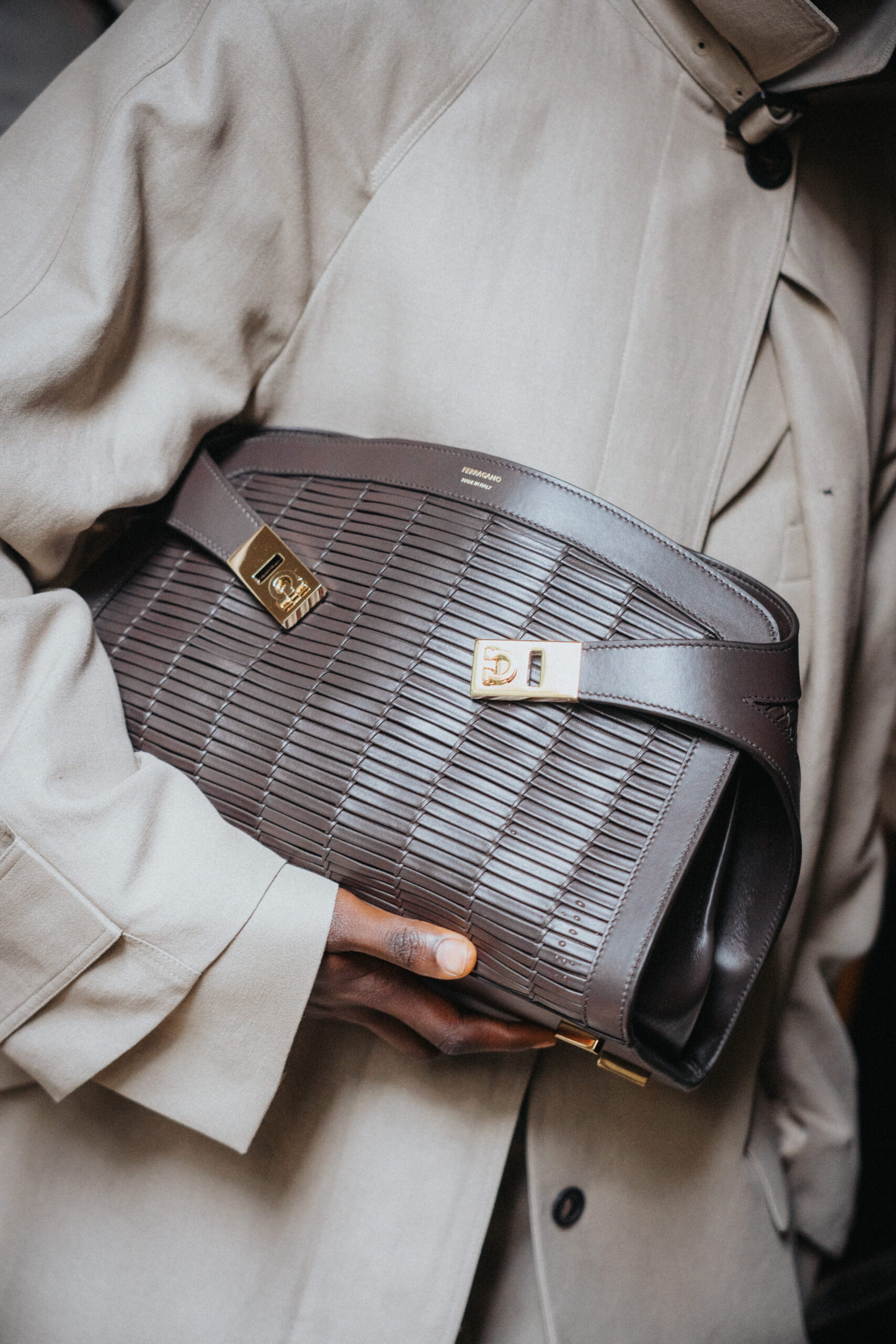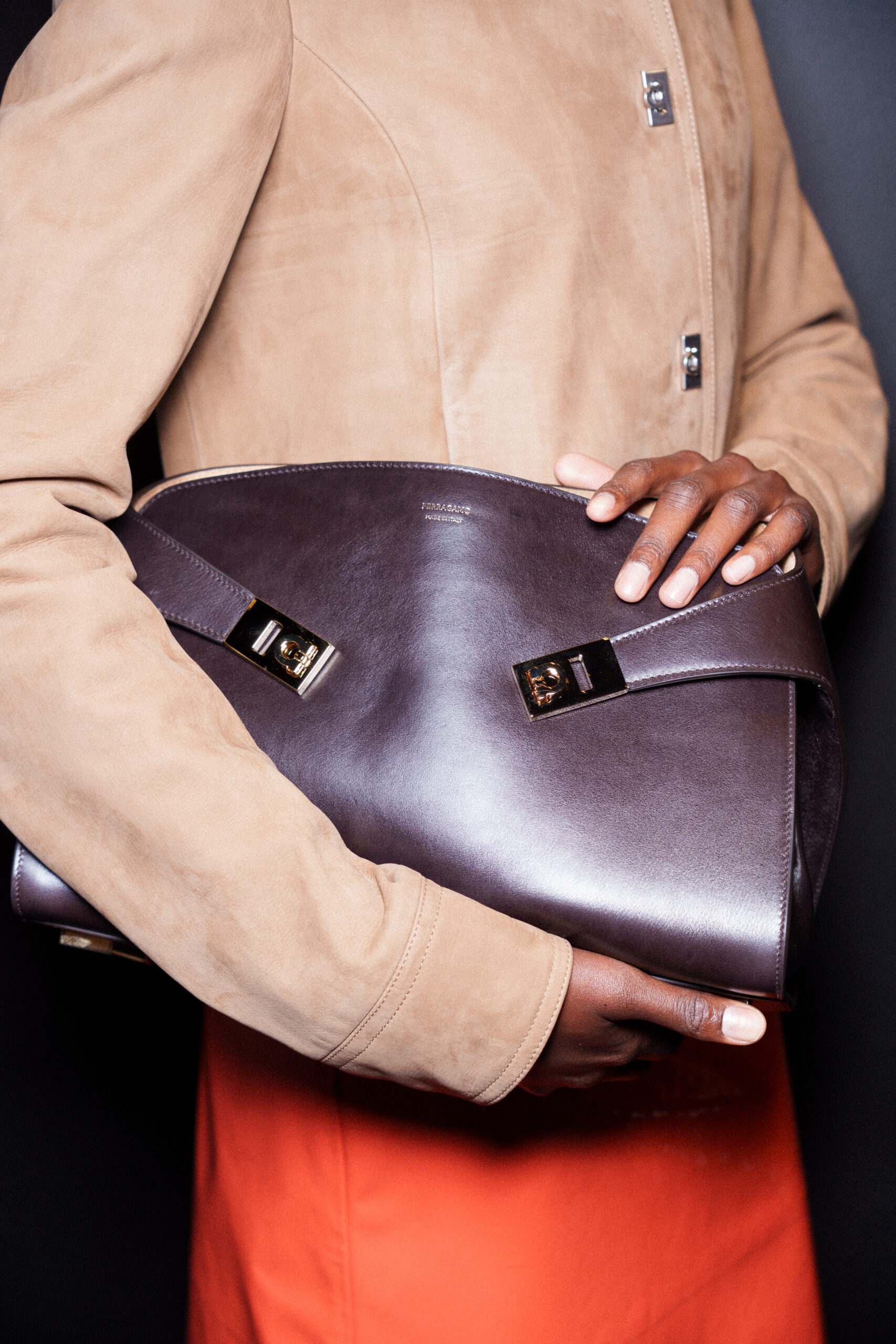 Một dáng túi đeo tay thanh lịch, lấy từ phác thảo xưa, được nhấn bằng khóa Gancini mạ vàng, lông vũ bung nở trên một thiết kế khác, lả lơi viền quanh những nếp gấp mềm mại của túi Soft.