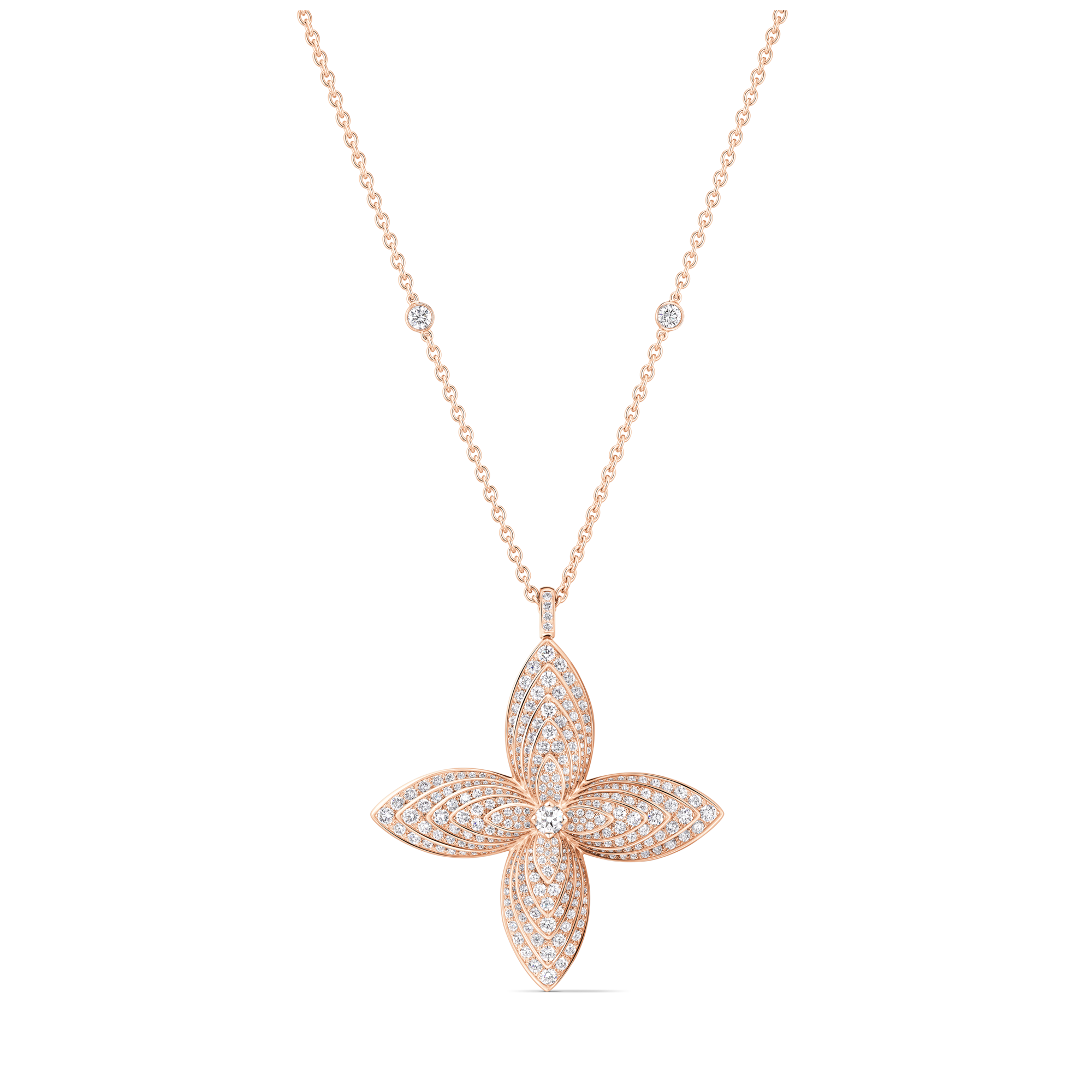 Từng xuất hiện trong vàng trắng và kim cương, hoa Monogram nay khoác lên diện mạo mới bằng vàng hồng quyến rũ. Thiết kế bông hoa xuất hiện ở vị trí trung tâm của dây chuyền, bông tai và nhẫn, mang đến vẻ đẹp cuốn hút, giúp tôn sáng gương mặt và tạo nên tổng thể thanh lịch và nổi bật.