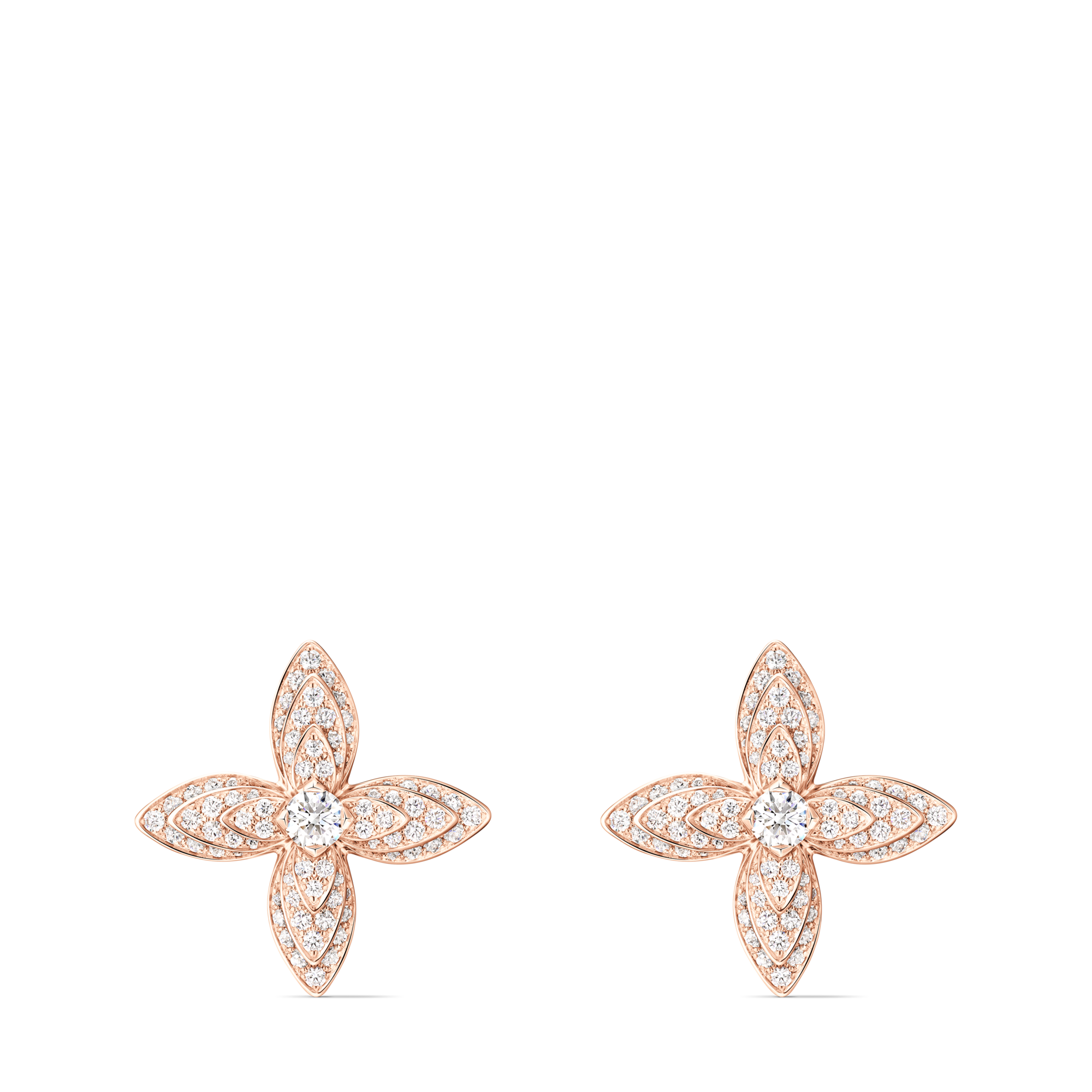 Những cánh hoa đính kim cương cắt brilliant được chế tác tinh xảo từ vàng hồng, xếp thành nhiều lớp để tạo nên hình dáng bông hoa thanh thoát. Ở trung tâm, viên kim cương trung tâm được cố định bằng chấu hình tam giác, giúp tăng độ phản chiếu và tạo hiệu ứng lấp lánh nổi bật.