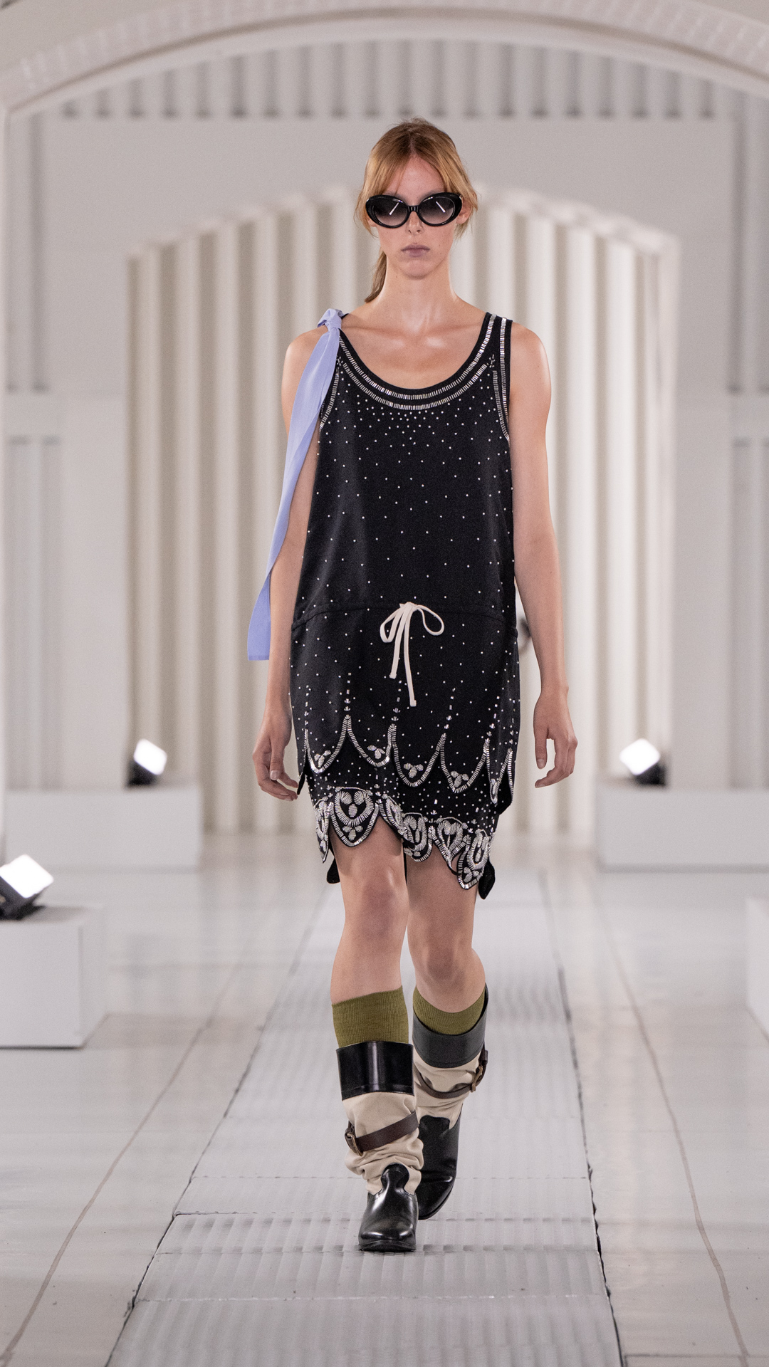Những chiếc áo sơ mi, áo blouse và đầm với chất liệu vải nhăn mang đến cảm giác cổ điển, song hành là các thiết kế đầm lấy cảm hứng từ bodysuit được phối lớp ngẫu hứng với quần culottes phom rộng để tạo nên sự bất đối xứng đầy phá cách. Trong khi đó, chất liệu vải đứng phom được ứng dụng linh hoạt: từ những chiếc áo Parka kết hợp cùng ba lỗ dệt kim sọc và quần short, cho đến áo khoác Trucker dáng lửng với đường cắt sắc sảo và phần eo nhún bèo.