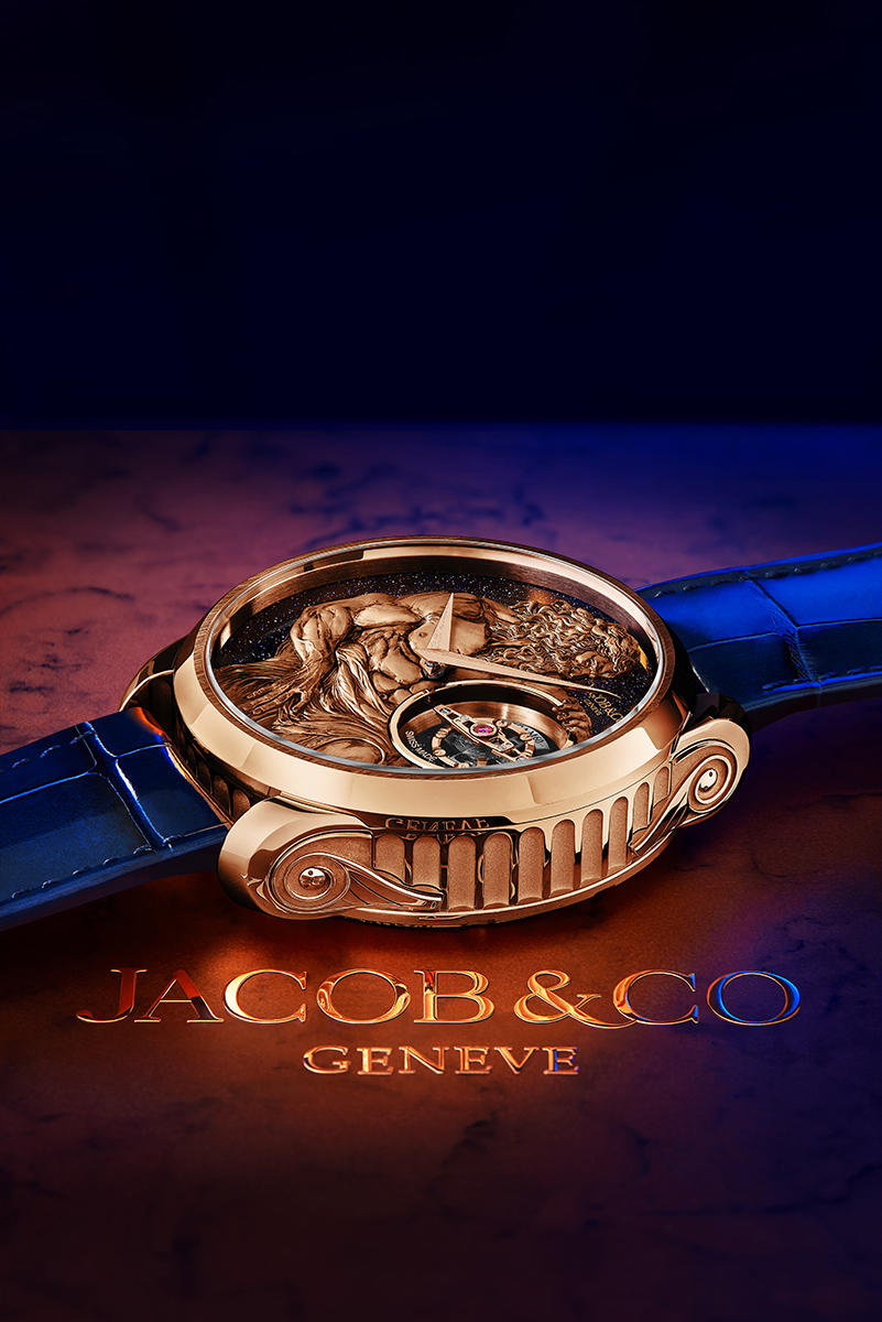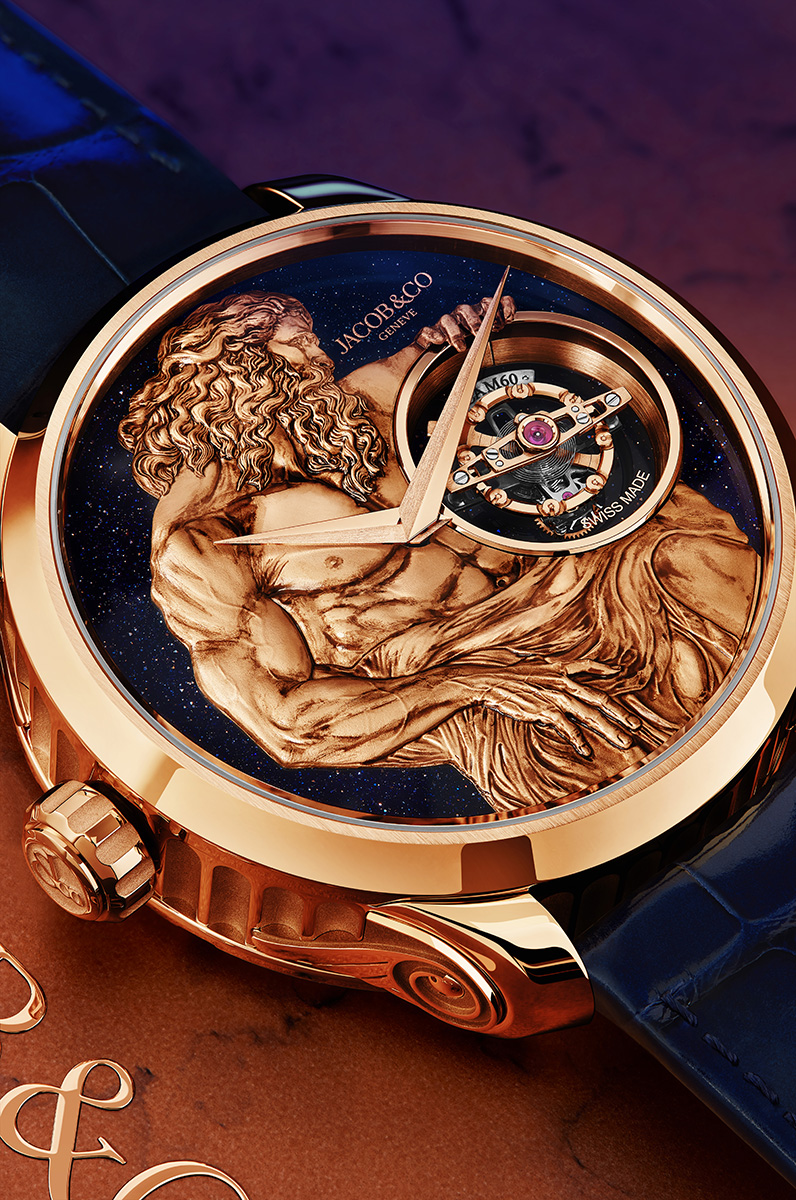 Jacob & Co. đã gắn kết tốc độ vô tiền khoáng hậu này với hình tượng thần Chronos – vị thần thời gian của Hy Lạp cổ đại. Đấng nắm giữ thời gian vĩnh cửu hiện thân qua một bức điêu khắc vàng hồng 3D sống động, được chạm khắc và đánh bóng thủ công tỉ mỉ trên nền bầu trời đá aventurine xanh thẳm lấp lánh tinh tú.