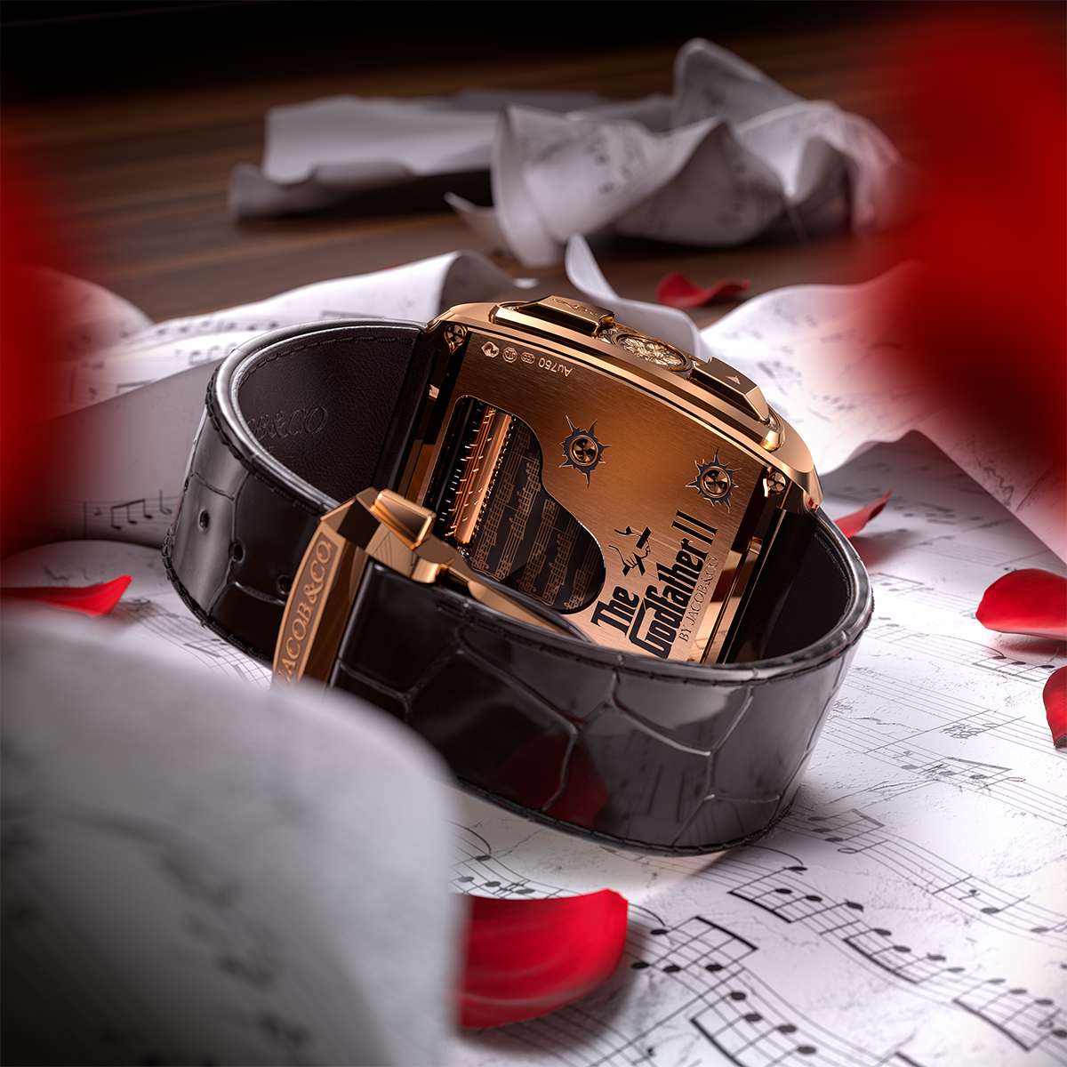 Bộ vỏ vàng hồng 42 x 44mm đánh dấu một bước chuyển mình khác biệt so với thế hệ Opera Godfather, nổi bật bởi những đường cong công thái học cùng phong thái Art Deco kiêu hãnh. Nắp lưng sapphire trong suốt mang hình dáng cây đàn piano, hé lộ hệ thống lược của hộp nhạc bên trong. Cấu trúc này được che phủ bằng tấm bảng chạm khắc chính xác bản nhạc phổ gốc của “The Godfather Love Theme”.