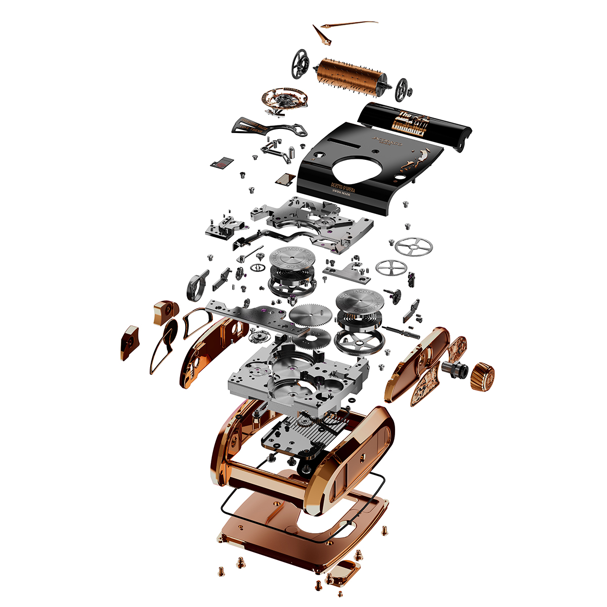 Vận hành bởi bộ máy Calibre JCAM62 hoàn toàn mới, cỗ máy này trình làng một tính năng đại phức tạp, độc tôn trong toàn bộ bối cảnh nghệ thuật chế tác đương đại: Cơ chế melody selector ngự trị tại vị trí 10 giờ, cho phép quý chủ nhân tự do chuyển đổi giữa hai bản nhạc. Được kích hoạt qua một nút bấm tại góc 8 giờ, mỗi giai điệu vang lên trong khoảng 15 – 20 giây và có thể lặp lại tới 10 lần chỉ với một lần lên cót trọn vẹn. Cả hai bản nhạc đều được mã hóa trên cùng một trục hộp nhạc duy nhất, một bước tiến vi cơ khí ngoạn mục giúp thu gọn kích thước bộ vỏ, nhưng vẫn đủ không gian để ôm trọn cơ cấu flying tourbillon 60 giây.