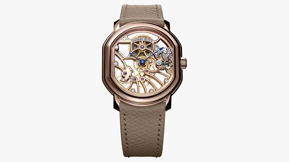 Từ năm 2023, các sáng tạo mới của Daniel Roth liên tục tôn vinh tình yêu của nhà chế tác dành cho bộ máy siêu mỏng và tourbillon. Phiên bản Extra Plat Rose Gold Skeleton mở lộ hoàn toàn cấu trúc cơ học, phô bày bộ máy lên dây tay DR002SR với cầu và đĩa được chế tác bằng vàng hồng 18 karat, hài hòa với vỏ đồng hồ hình elip kép đặc trưng của Daniel Roth. Thiết kế là minh chứng cho triết lý của Daniel Roth, nơi bộ máy siêu mỏng không chỉ là kỹ thuật mà là một đỉnh cao trong nghệ thuật đồng hồ cao cấp.