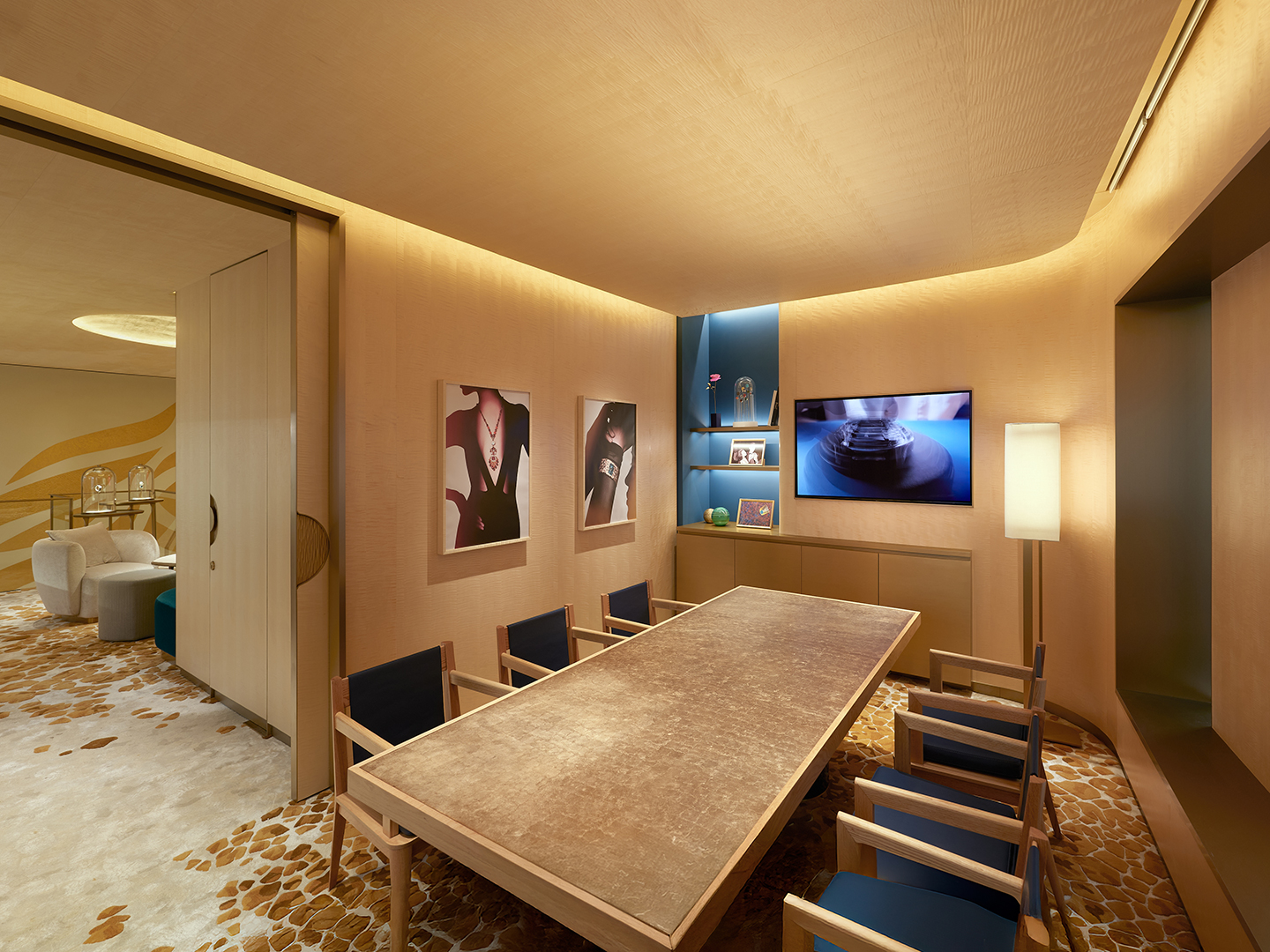 Hai mẫu nhẫn Possession mà Khánh Linh sử dụng phô diễn trực tiếp kỹ thuật chạm khắc tay Palace Décor trứ danh. Bề mặt vàng hồng được điêu khắc bằng mũi ve để tạo ra các rãnh nông sâu bất quy tắc. Việc tích hợp hàng chục viên sapphire và tsavorite nhiều màu sắc dọc theo vòng xoay vừa tăng cường chiều sâu thị giác, vừa đòi hỏi kỹ thuật cẩn đá quý cực kỳ phức tạp trên một bề mặt lồi lõm không đồng nhất.