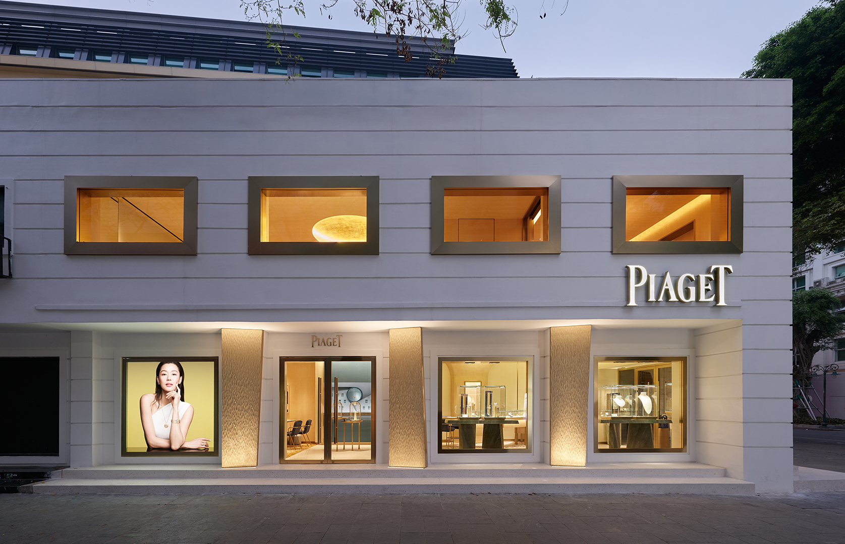 Tọa lạc tại vị trí số 61 Lý Thái Tổ, cửa hàng Piaget Hà Nội được định vị như một “Ateliers de l’Extraordinaire” – công xưởng của những điều phi thường được hiện thực hoá giữa phố phường Hà Nội. Trở lại sau một thời gian nâng cấp cửa hàng và mở rộng diện tích lên tới 119m2, mặt tiền tòa nhà nay được bao bọc bằng hệ thống các module vàng được sắp xếp để phản chiếu ánh sáng và phô diễn vị thế “Nhà chế tác của Vàng” mà thương hiệu dày công gây dựng.