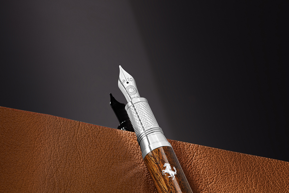 Từ phần thân bút chế tác tinh vi bằng gỗ mahogany được khảm với dải sơn mài màu đen gợi nhớ đến chiếc vô-lăng cổ điển của những mẫu Ferrari GT, cho đến các điểm nhấn phủ bạch kim tái hiện hiệu ứng mạ chrome bóng loáng. Từng đường nét đều được thiết kế để truyền tải tinh thần di sản và vẻ thanh lịch tinh tế. Họa tiết khắc vân chéo trên ngòi bút, chóp bút và đỉnh nắp gợi nhắc đến kết cấu bề mặt trên phần chấu kim loại ở các mẫu vô-lăng Ferrari GT nguyên bản.