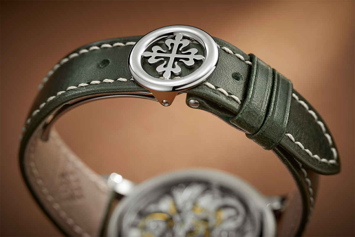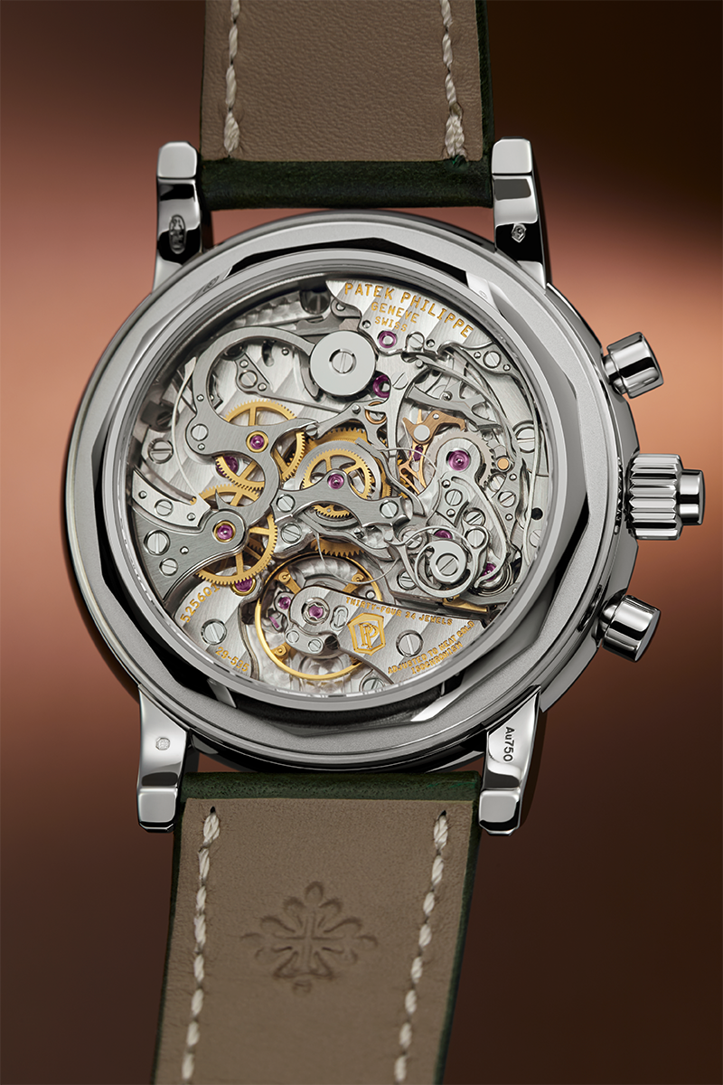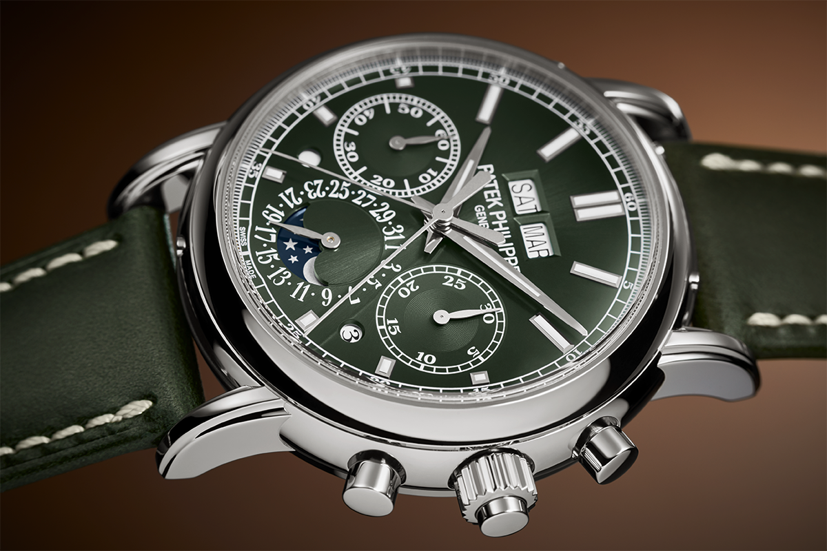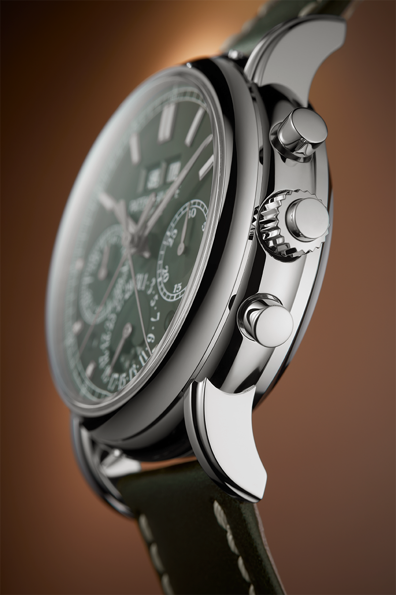 Tạo tác này khéo léo gợi nhắc tới phong cách lịch thiệp cổ điển qua bộ vỏ bằng vàng trắng 18k, kết hợp với mặt số màu xanh olive hoàn thiện bằng phương pháp chải tia mặt trời, đi kèm với đó là bộ dây đeo bằng da cá sấu cùng tông màu. Không chỉ có diện mạo gợi nhắc đến tinh thần giáng sinh ấm áp, những tính năng kỹ thuật của Ref. 5204G-001 thực sự là một món quà mơ ước cho bất kỳ nhà sưu tầm nào. Sở hữu hai tính năng siêu phức tạp mang tính biểu tượng của Patek Philippe là bấm giờ kép (split-seconds chronograph) và lịch vạn niên (perpetual calendar), chiếc đồng hồ được trang bị bộ máy cơ caliber CHR 29-535 PS Q, một trong những bộ máy có cấu trúc phức tạp nhất trong bộ sưu tập hiện hành, được cấu thành từ 496 bộ phận khác nhau.