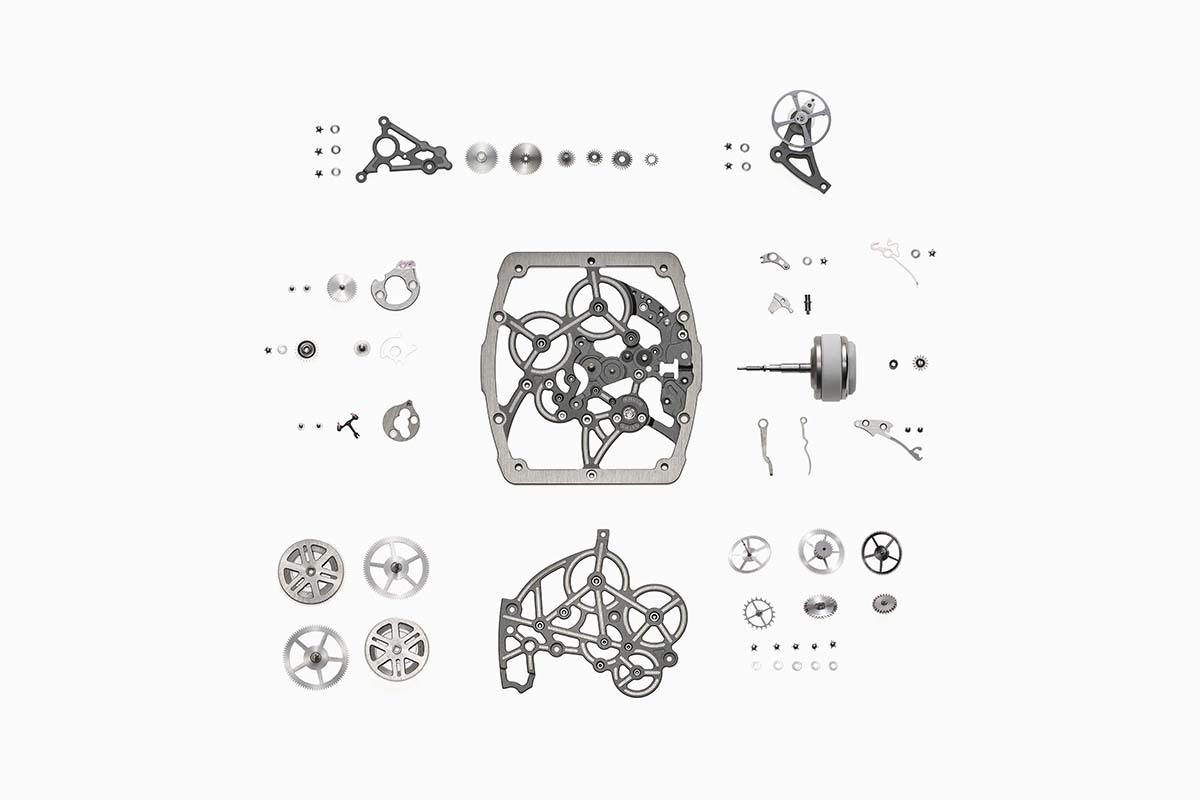 Tuy nhiên, gia công vật liệu này luôn là một thách thức lớn. Phay titanium grade 5 là công việc nặng nhọc: độ cứng cực cao của vật liệu cùng tiêu chuẩn dung sai thấp của thương hiệu khiến mọi dụng cụ đều phải chịu tải lớn. Tiêu chuẩn không khoan nhượng ấy cũng áp dụng cho các chi tiết satin‑brushed dày hơn một chút, những phần cấu trúc bộ máy vừa tạo hình vừa làm nổi bật sự căng thẳng giữa đường thẳng và đường cong.