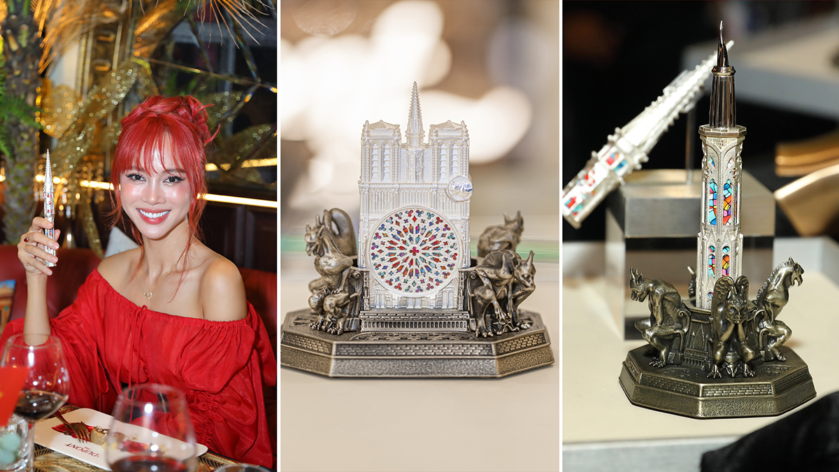 “Chị đẹp” Vũ Ngọc Anh cùng BST Notre Dame de Paris, gồm bật lửa và bút máy với thiết kế tôn vinh kiến trúc tráng lệ của nhà thờ Đức Bà Paris với ô cửa kính đầy màu sắc. BST được ra đời để chúc mừng Nhà thờ Đức Bà Paris mở cửa trở lại sau khi hoàn thành trùng tu năm 2024.
