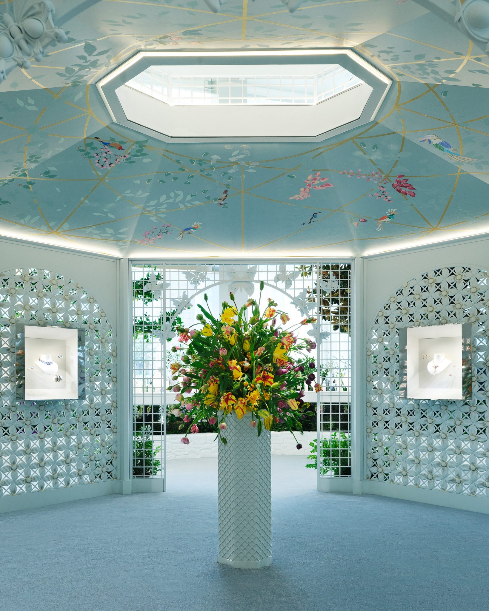 Chương Xuân mở ra với chủ đề chuyển hóa và tái sinh, nơi chu kỳ của thiên nhiên dẫn dắt mạch kể. Sự sinh trưởng và chuyển động hữu cơ được thể hiện qua những dây leo vàng tạo hình thủ công, lá bạch kim và các cấu trúc hình học tinh xảo.
